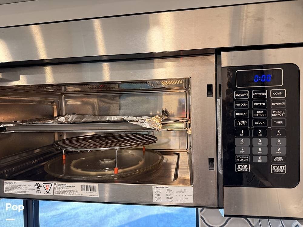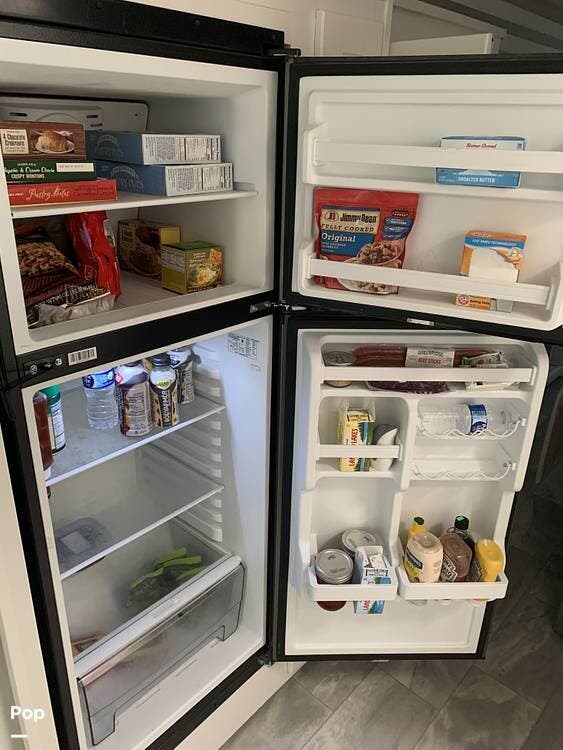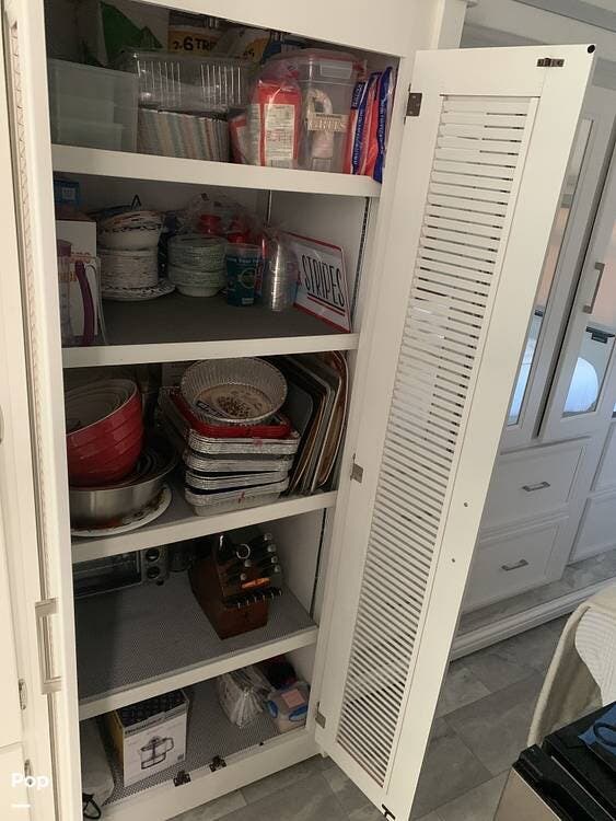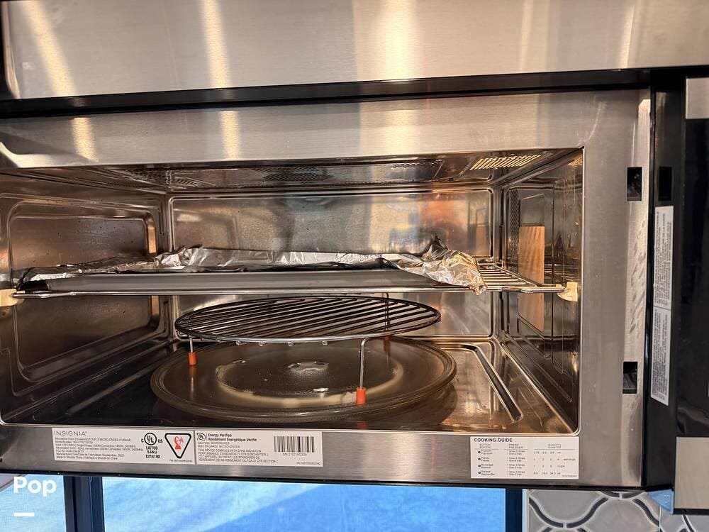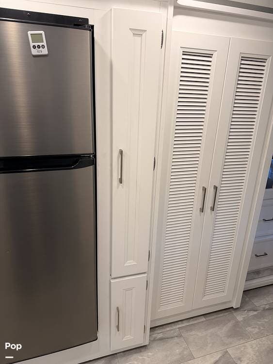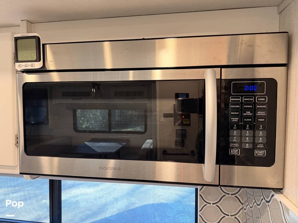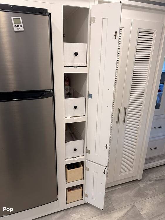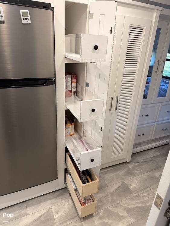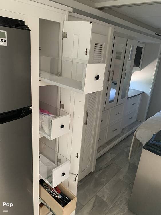It has a filtered water system, solid countertops, a convection microwave, and a residential refrigerator!