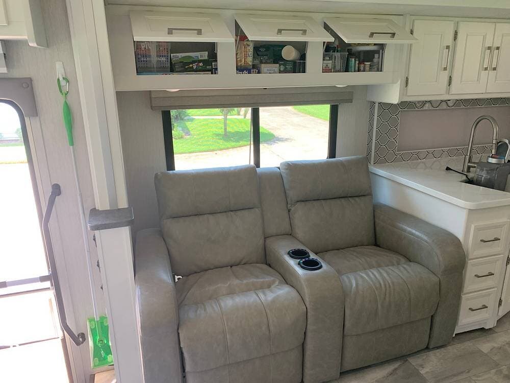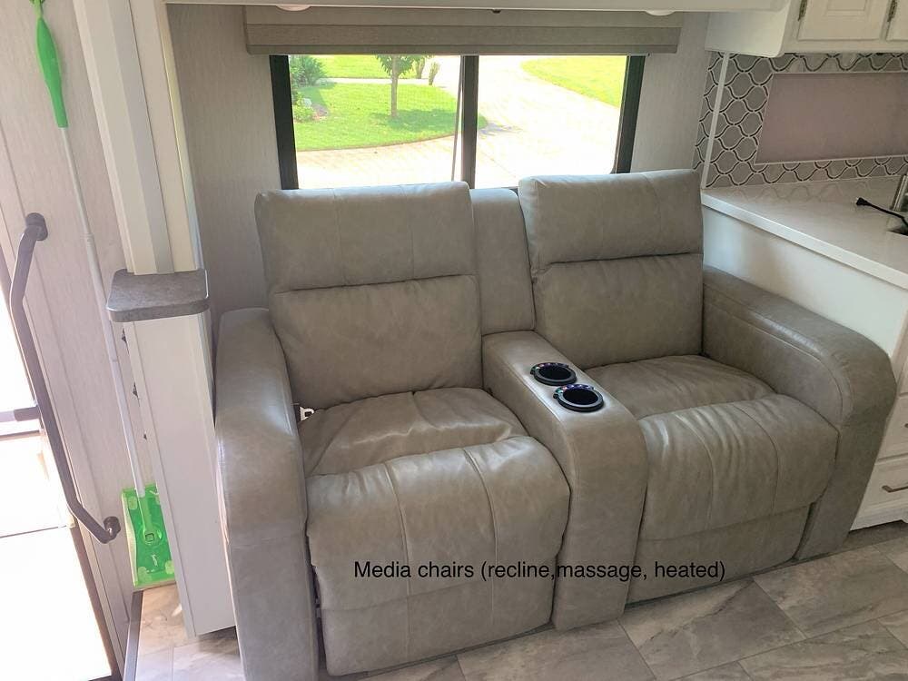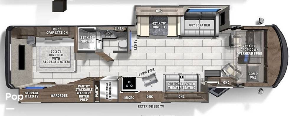 Once you're on board, you'll see how comfortably and ergonomically this RV was designed. Family members, as well as guests, will love the intuitive layout with its handy swivel driver's and passenger's seat, convertible dinette sleeper, dual recliners with console storage, massage and heat, a sleeper-sofa, a power drop-down over-cab bed, 3 more flat-panel TVs,
