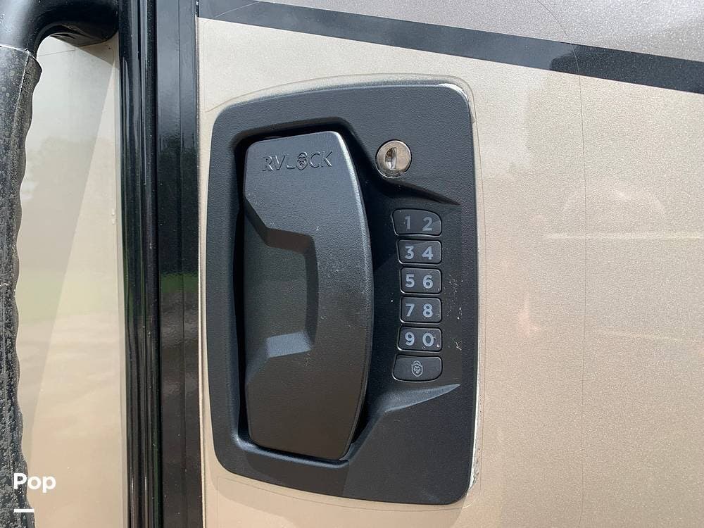 Outside, she has full-body paint, a full-size power patio awning, protective slide-topper awnings, an exterior shower, an exterior television, auto-leveling, and a solar charging system.