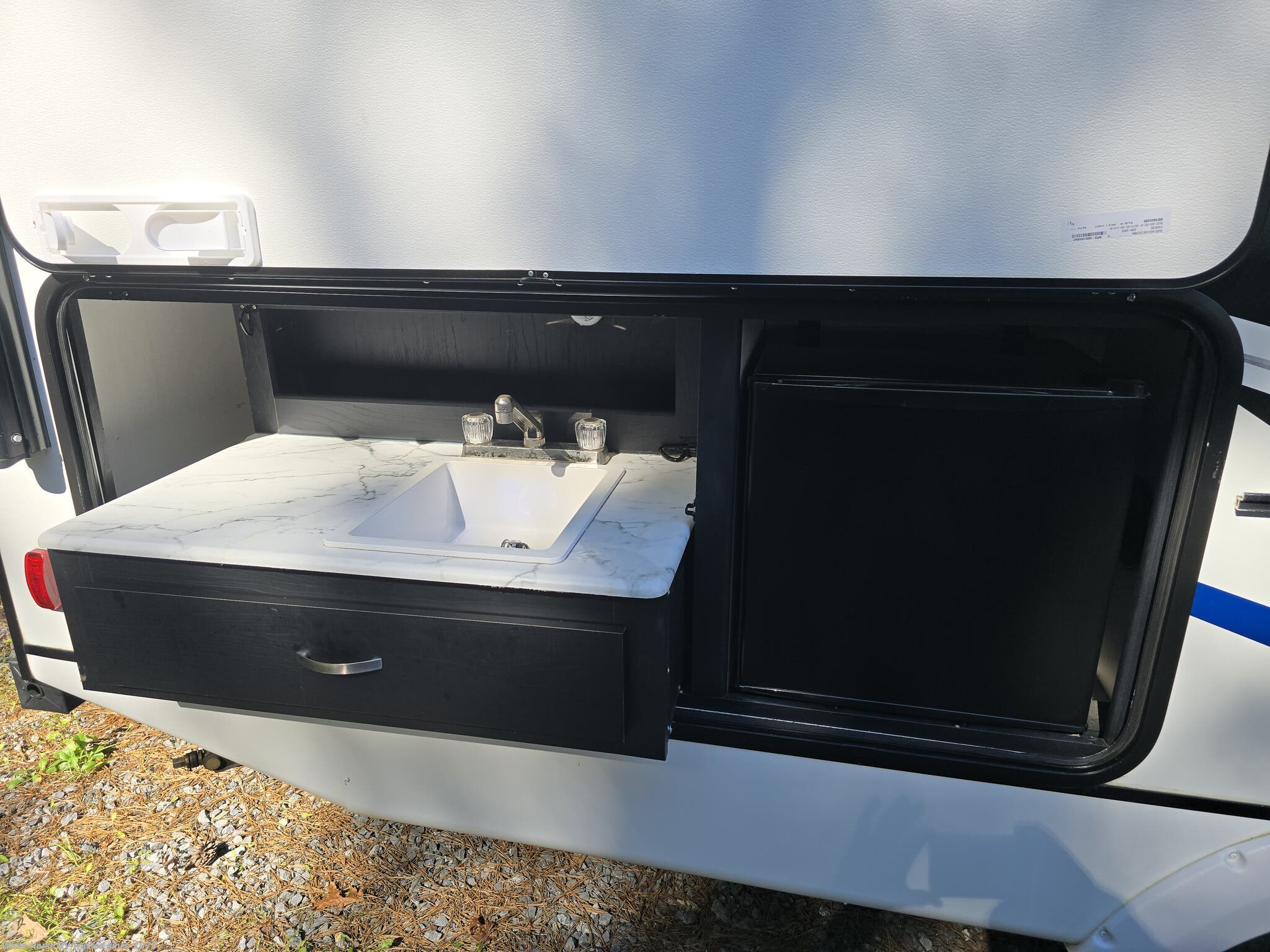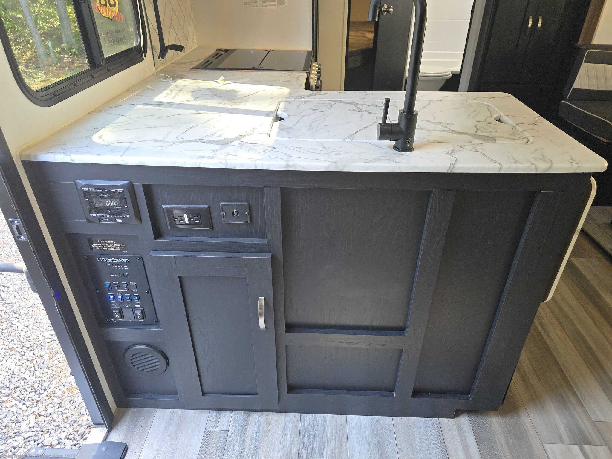 Outdoor Living: 18’ power awning with LED lighting and an outdoor camp kitchen below the bottom bunk (sink, fridge, grill)