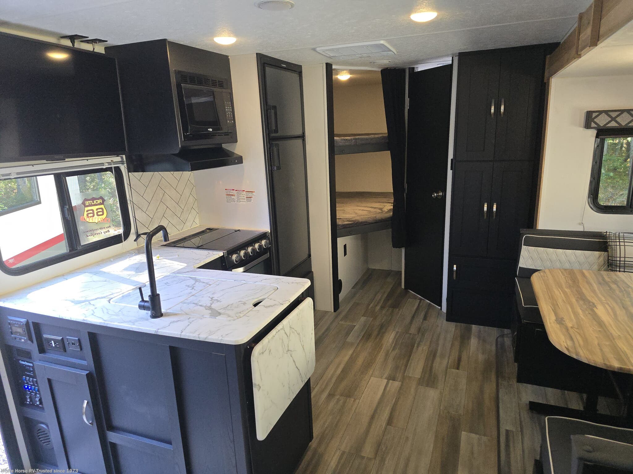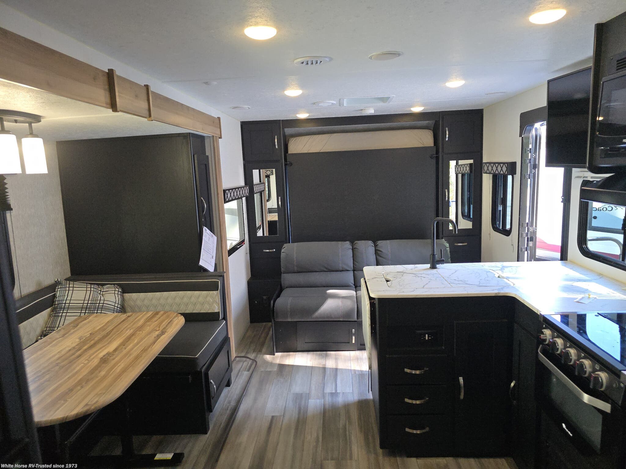 Sleeping Capacity: Comfortably sleeps up to 8 with double-over-double bunks, a U-shaped dinette, and a Murphy queen bed/sofa combo up front