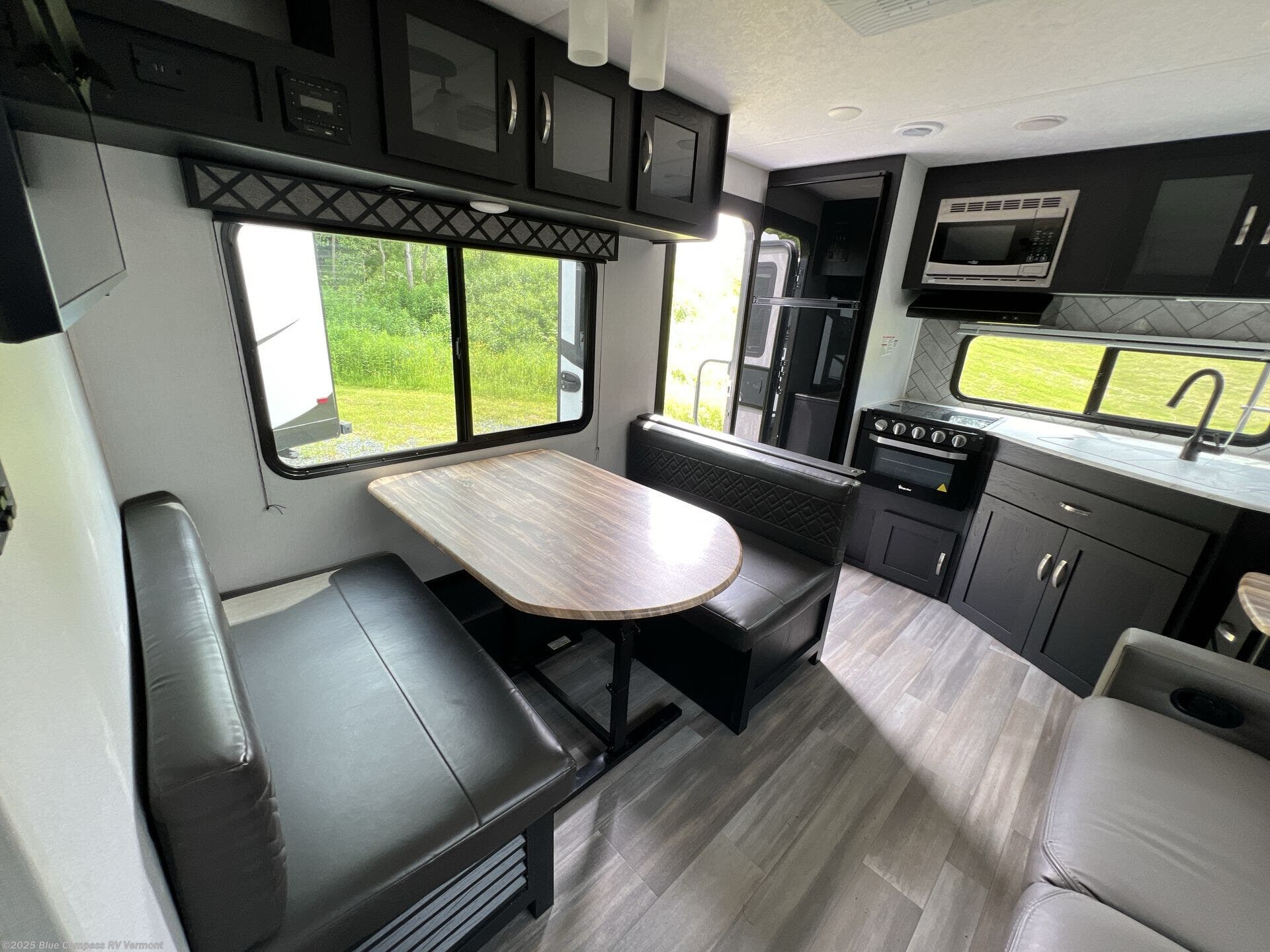 Check out this rear kitchen travel trailer that can sleep three to four each night. The front semi-private bedroom includes a privacy curtain and a queen bed with vaulted under-bed storage for your belongings. The sofa within the large slide out and the booth dinette will provide comfortable seating space, and there is an LED TV for those rainy camp days. This model also includes a three burner cooktop, a microwave oven, and an 8 cu. ft. double door refrigerator for your perishables. And don't forget about the 18' power awning with LED lights!