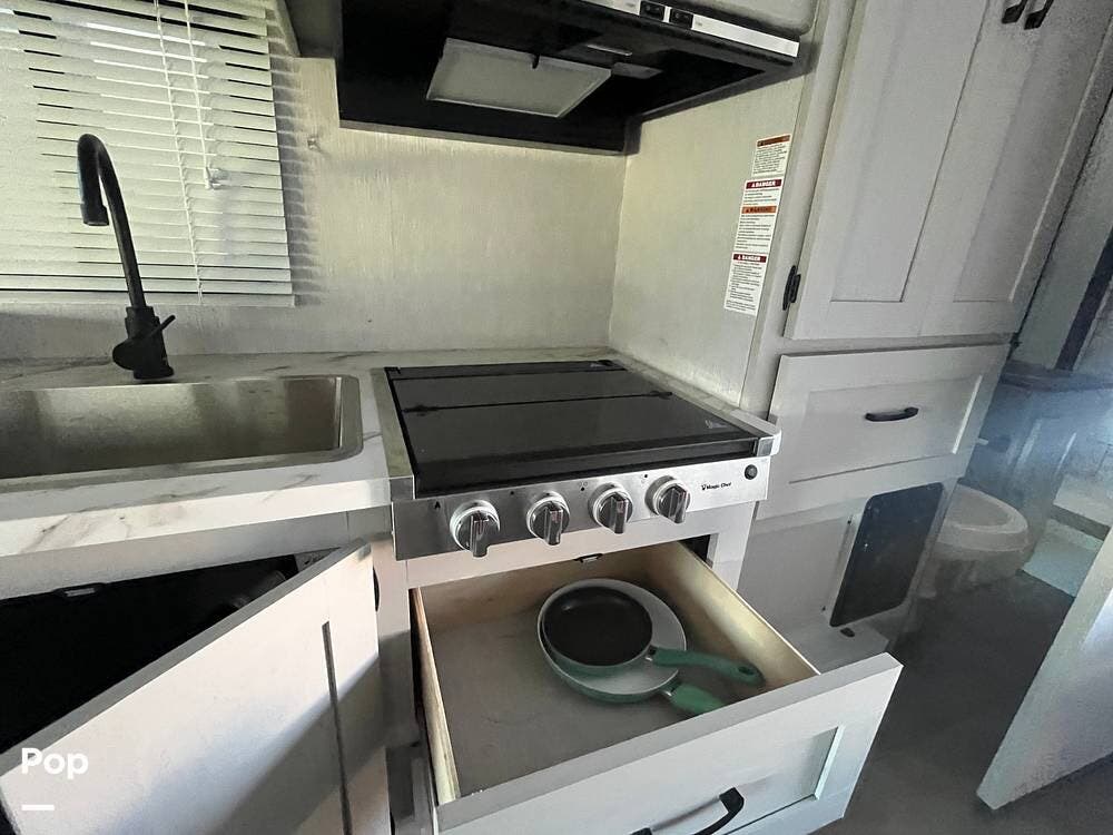 Inside, the kitchen is thoughtfully equipped with a three-burner cooktop, convection microwave oven, stainless-steel sink with a high-rise faucet, and a full-size electric refrigerator.