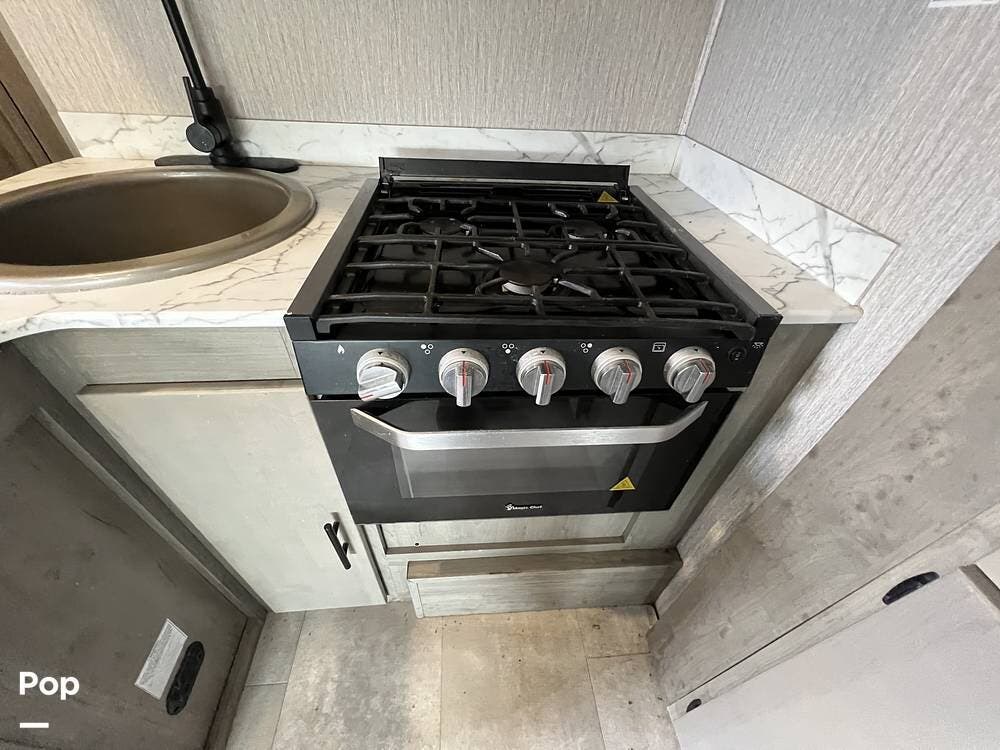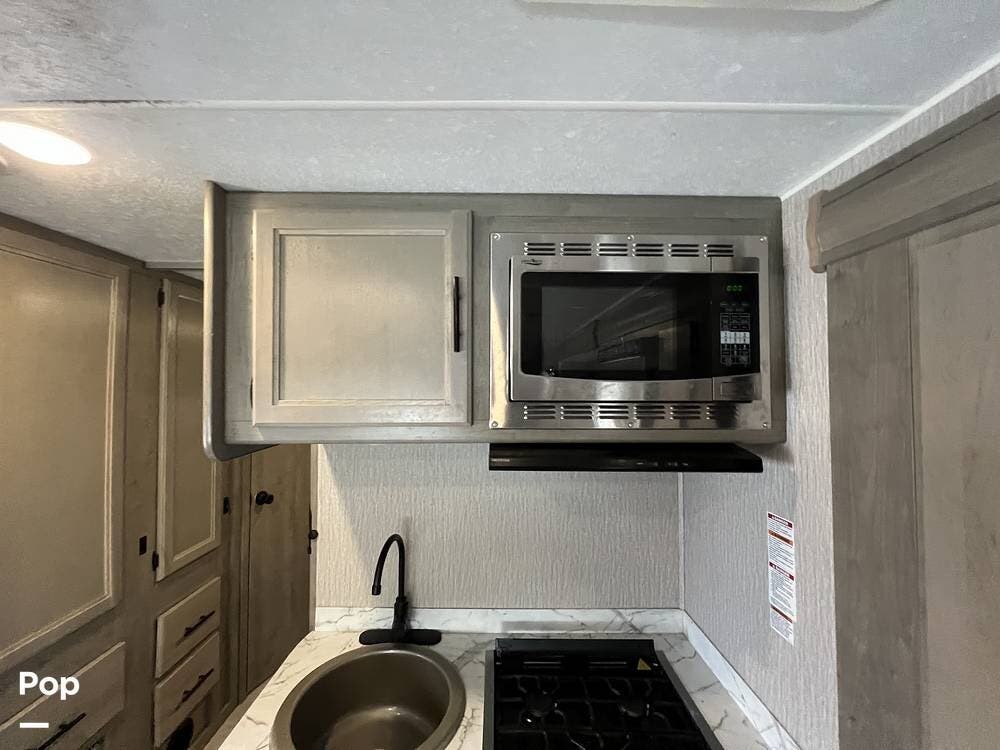 The galley has everything you would expect from Forest River. There is a full range top and oven, a microwave, and
