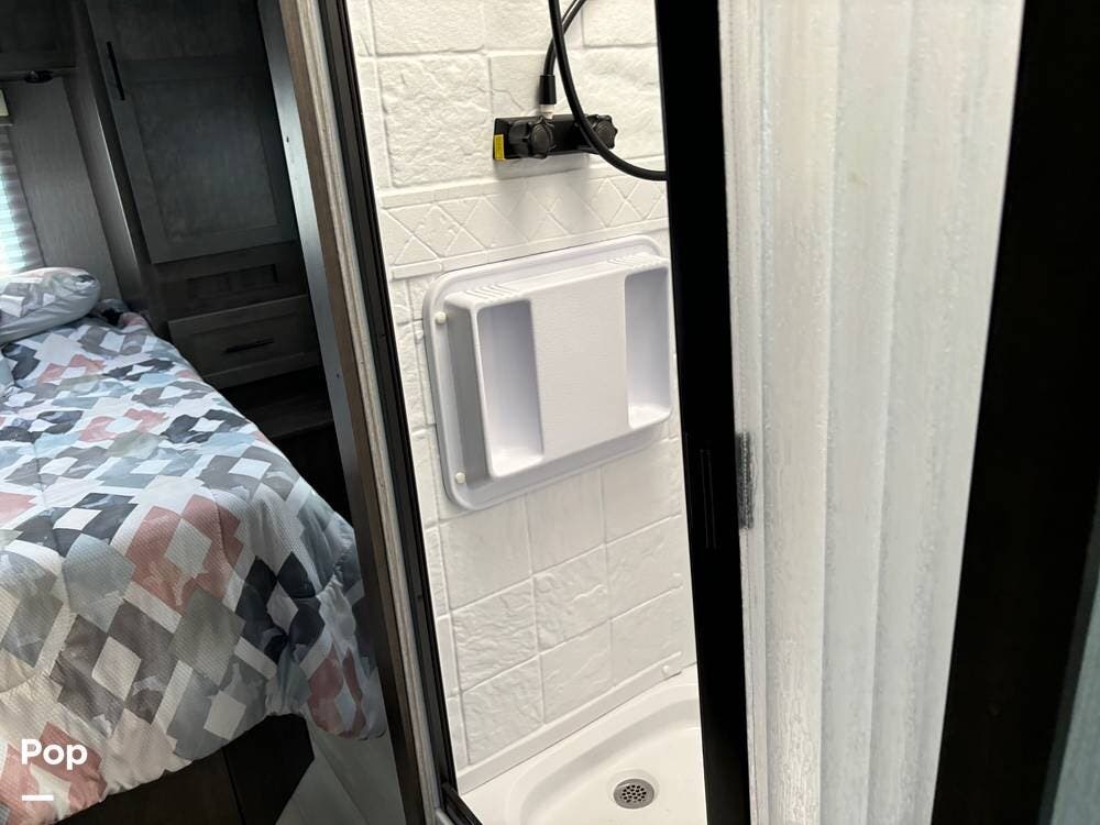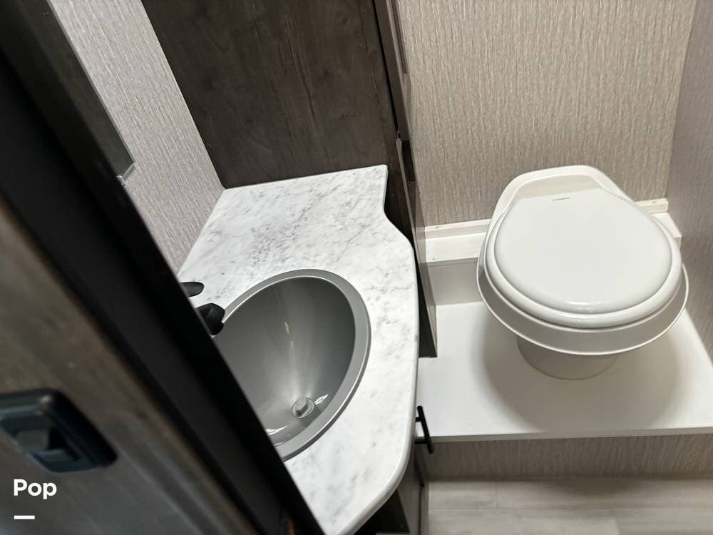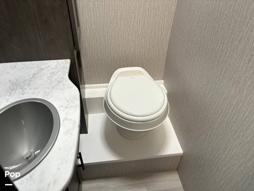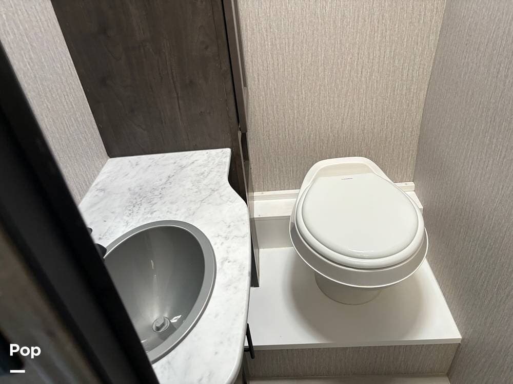 The bathroom is well-appointed with a shower, toilet, and sink, providing all the comforts of home on the road.