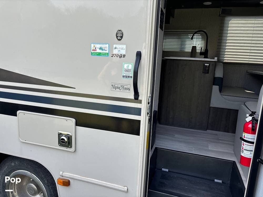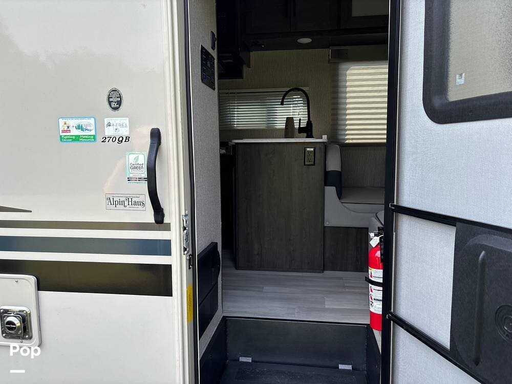The 270QB has modern amenities, including a fully equipped kitchen with a refrigerator, microwave, stove, and ample storage space.