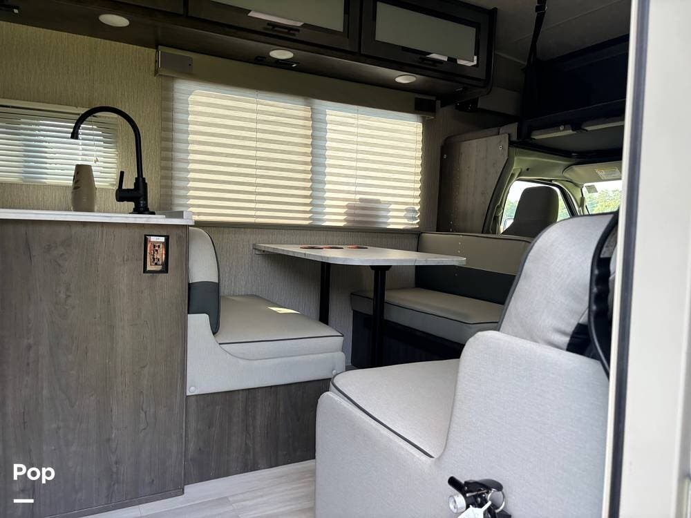 The living area features comfortable seating and a dinette that can be converted into an additional sleeping space.