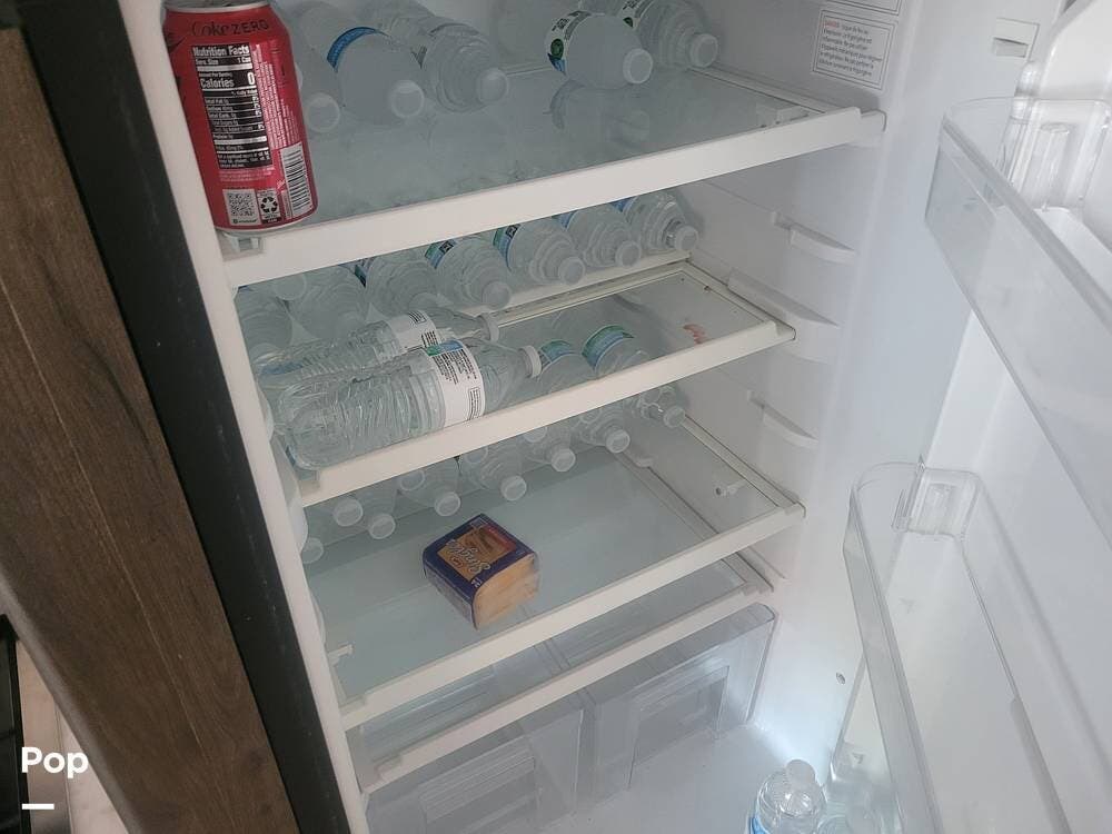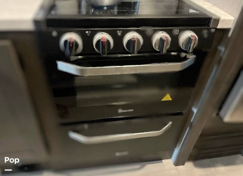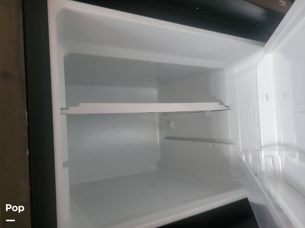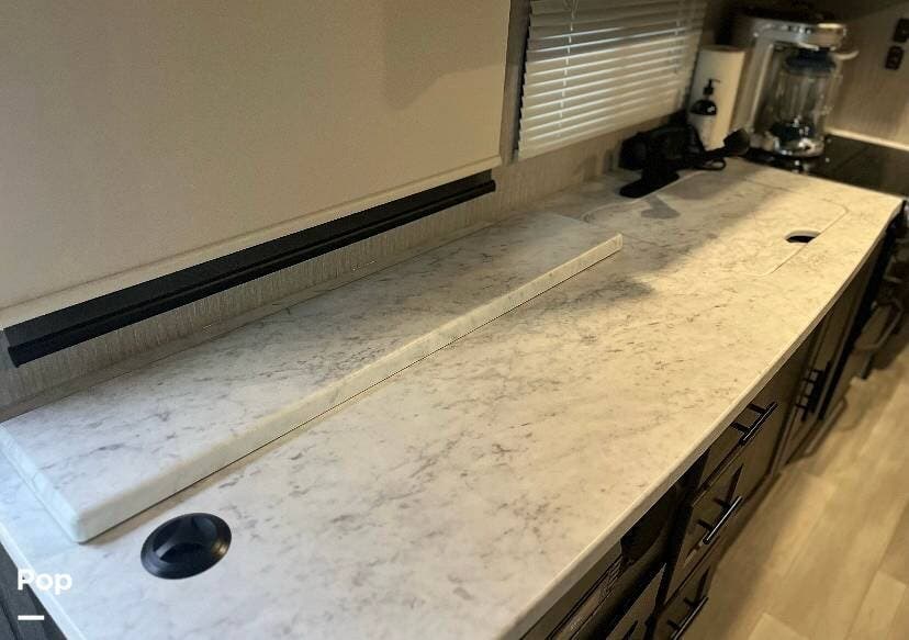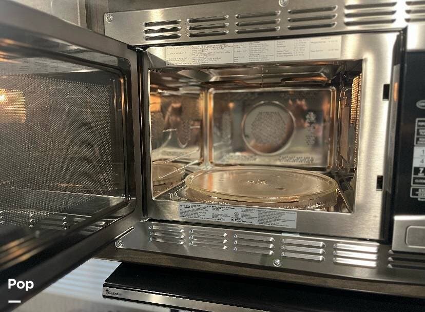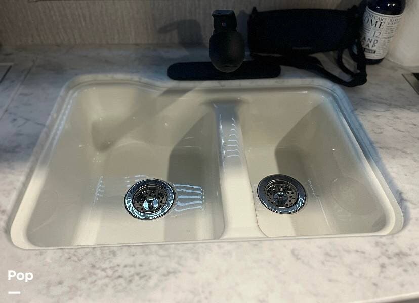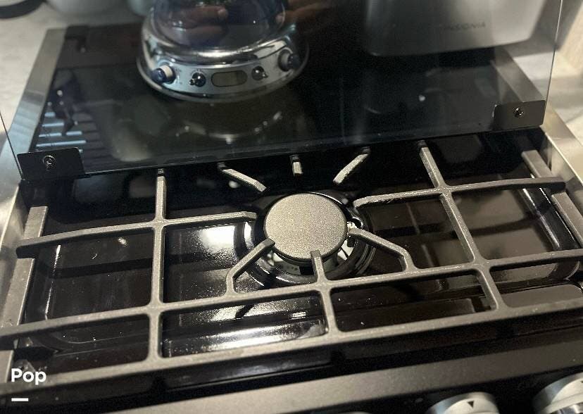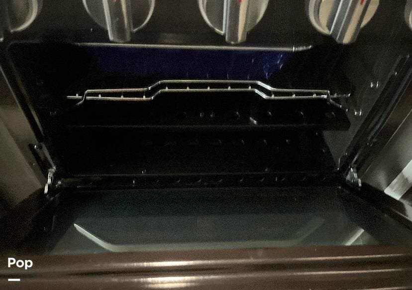 The kitchen has a refrigerator/freezer, three burner stove, oven, microwave, pantry, double stainless sink, slide-out counter, and plenty of cabinets and drawers for storage.