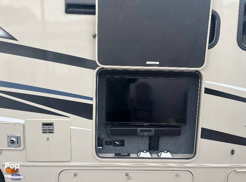 The living area has a sofa bed, a U-shaped convertible dinette, a full-sized over-cab bunk, a lift TV, a stereo system, and a cabinet and drawers for storage.