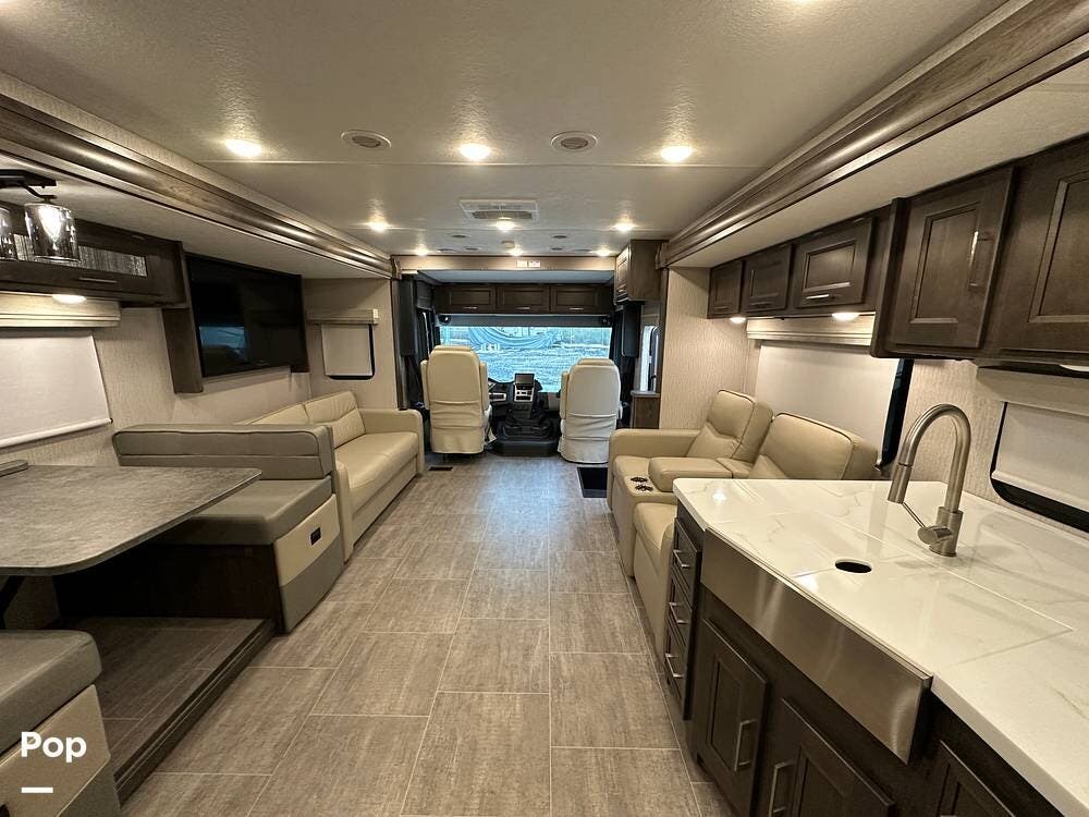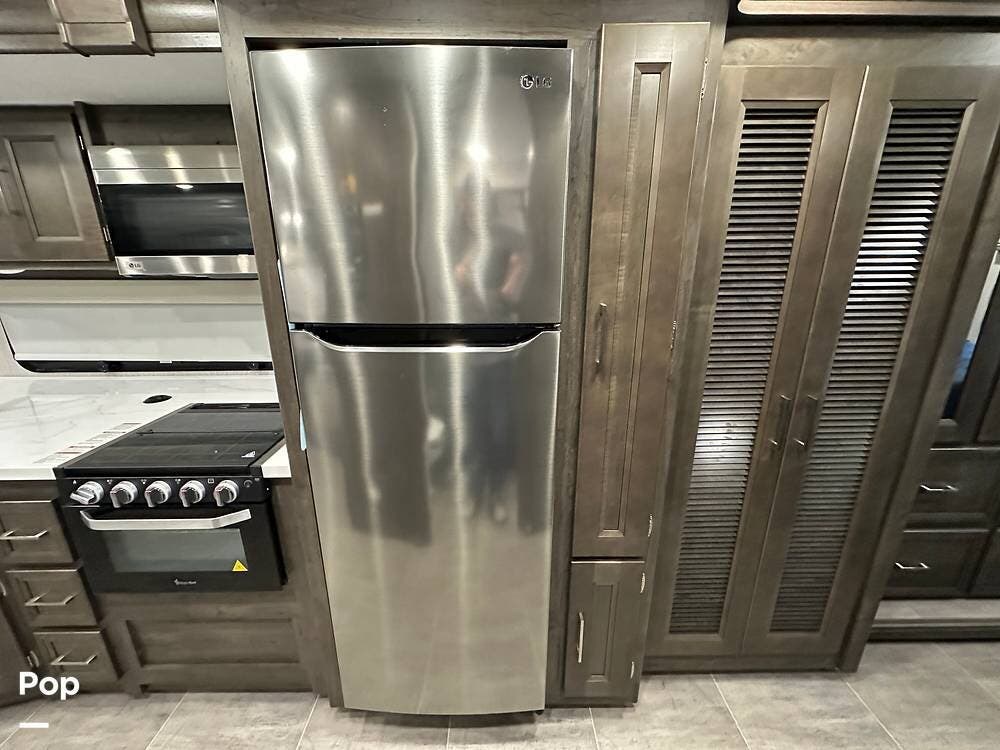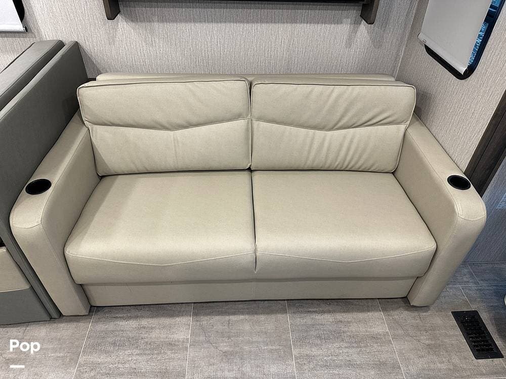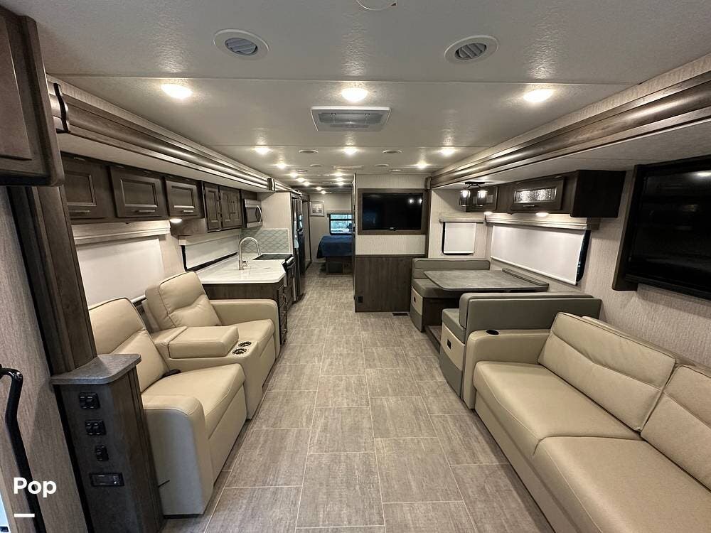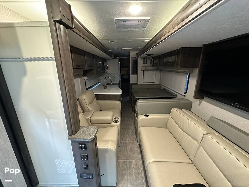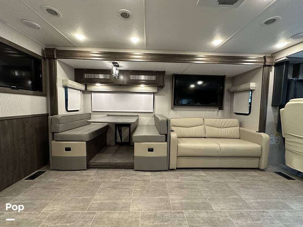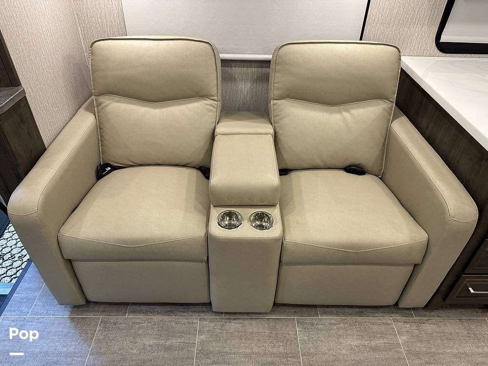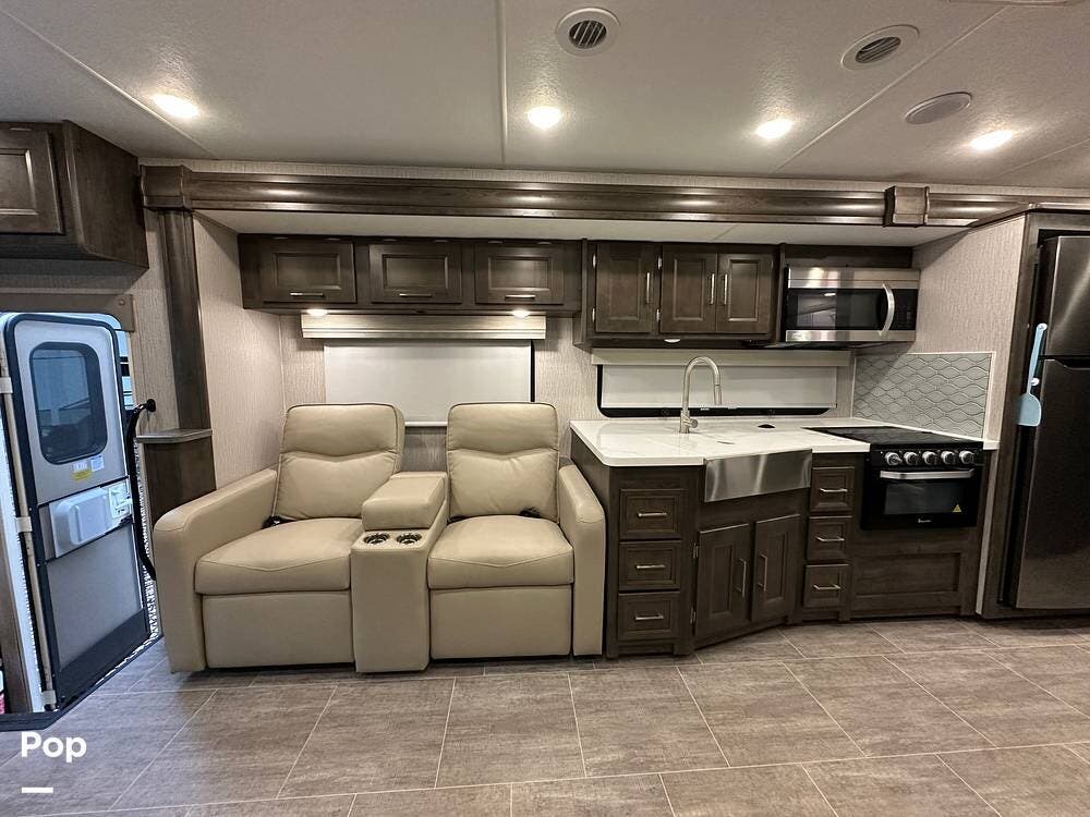 Step inside and you're greeted by an inviting, residential-style interior featuring elegant finishes and premium materials. The open floor plan creates a roomy atmosphere, with dual slides that expand the living area for maximum comfort. A plush sofa and theater seating make it easy to relax, while the large entertainment center and cozy fireplace bring all the comforts of home on the road.