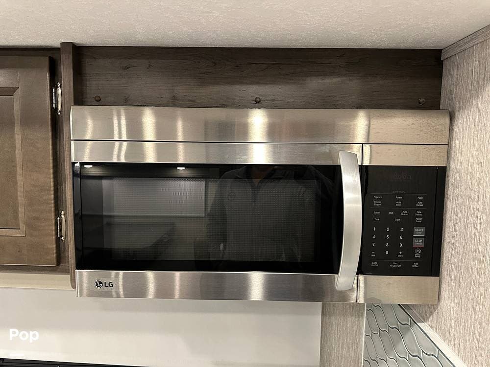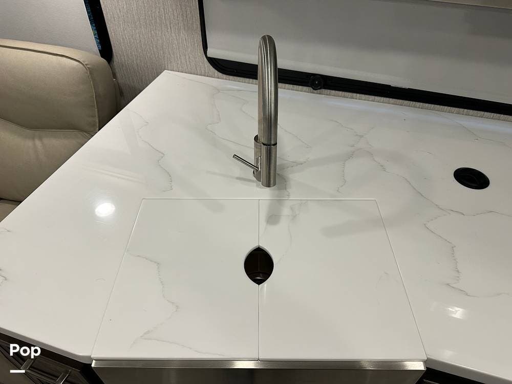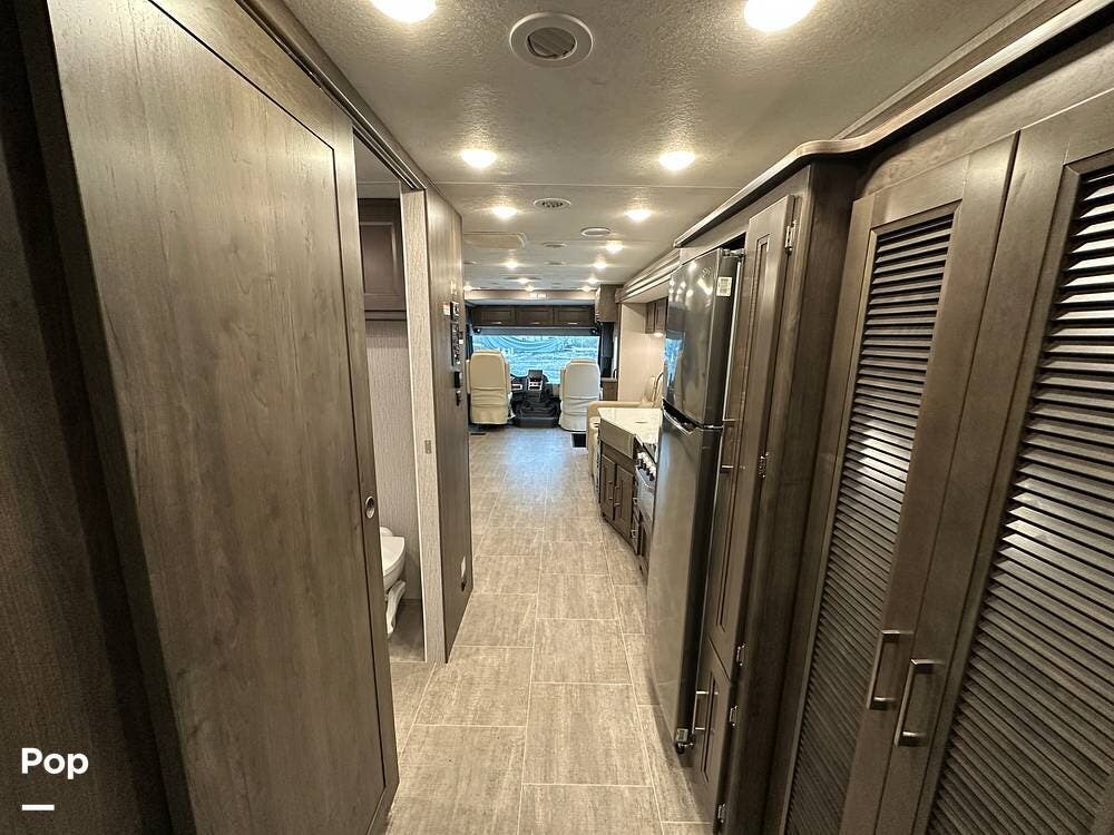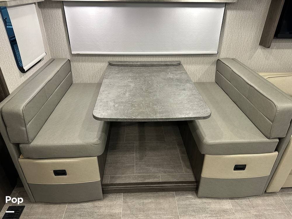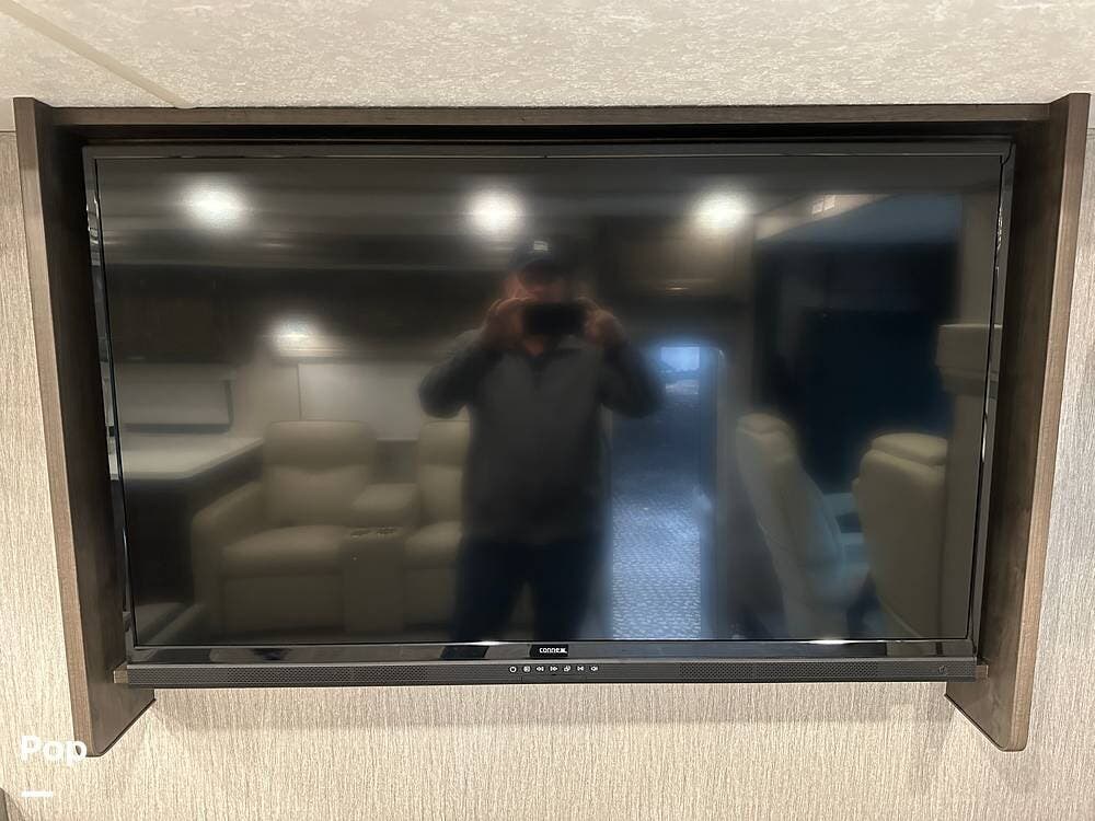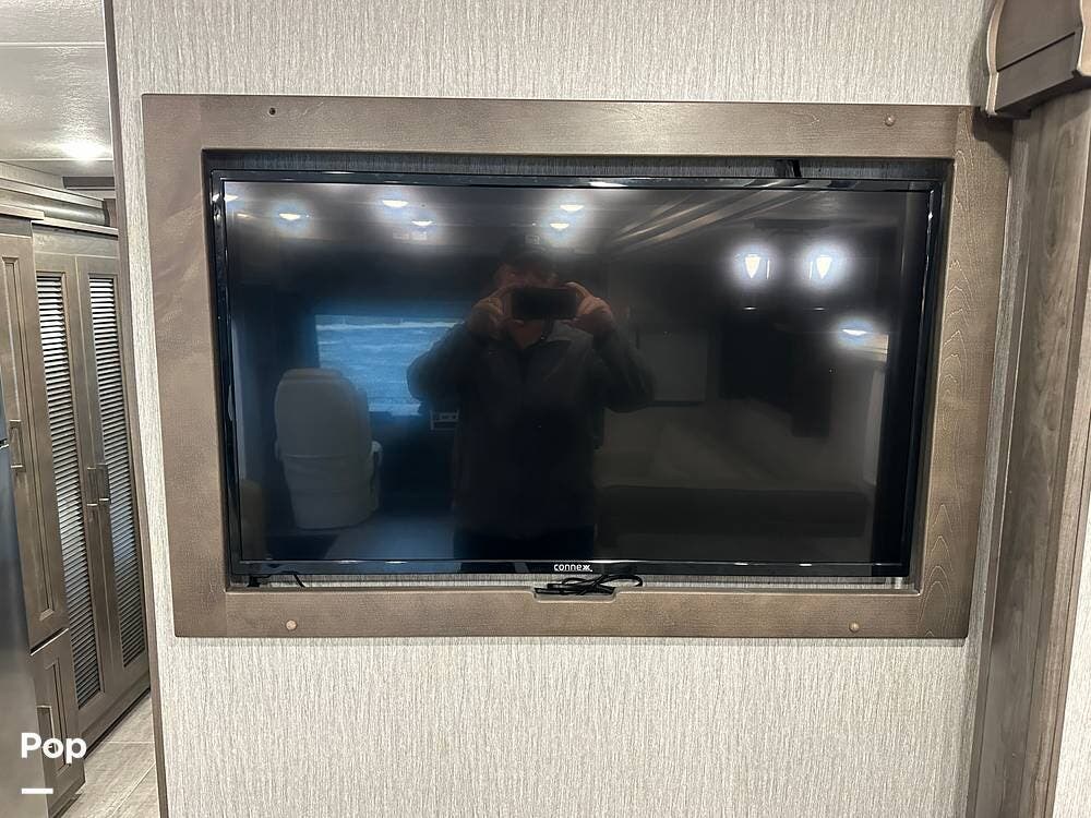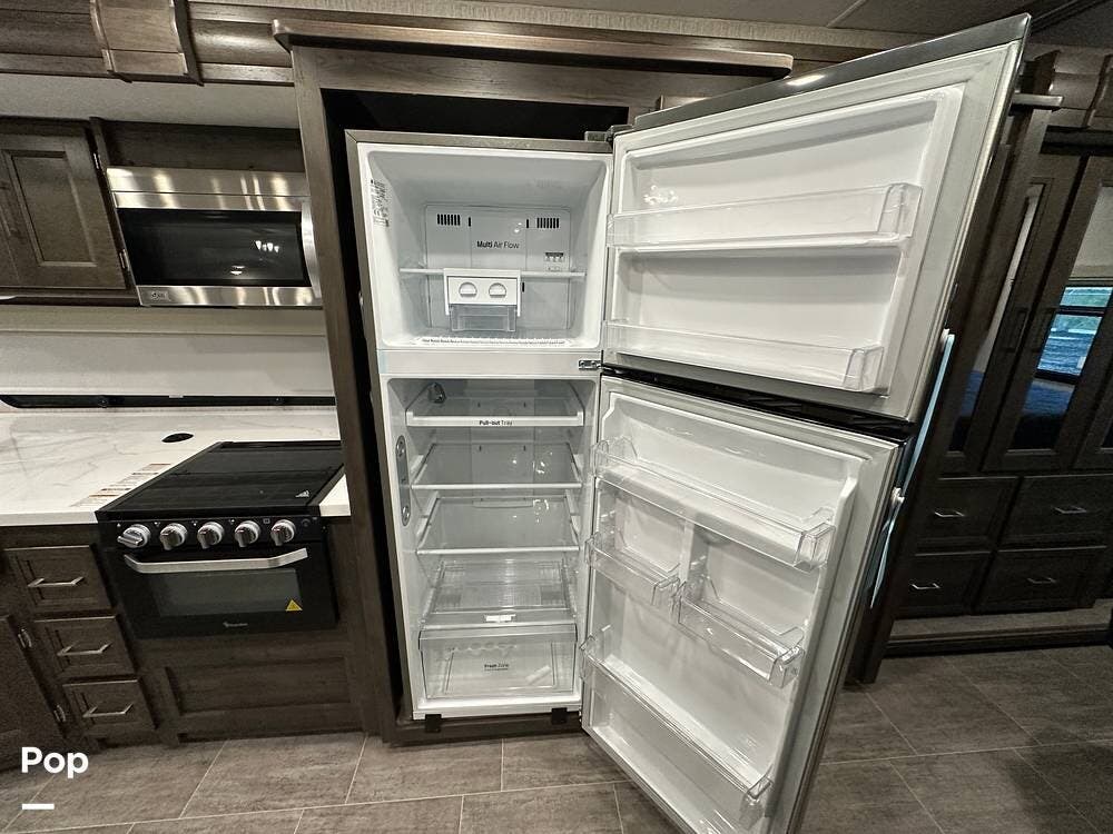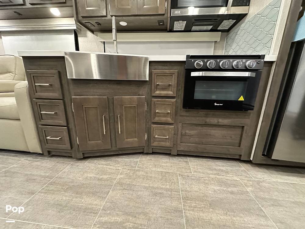 Step inside and you're greeted by an inviting, residential-style interior featuring elegant finishes and premium materials. The open floor plan creates a roomy atmosphere, with dual slides that expand the living area for maximum comfort. A plush sofa and theater seating make it easy to relax, while the large entertainment center and cozy fireplace bring all the comforts of home on the road.