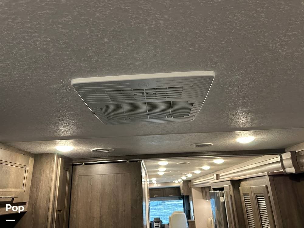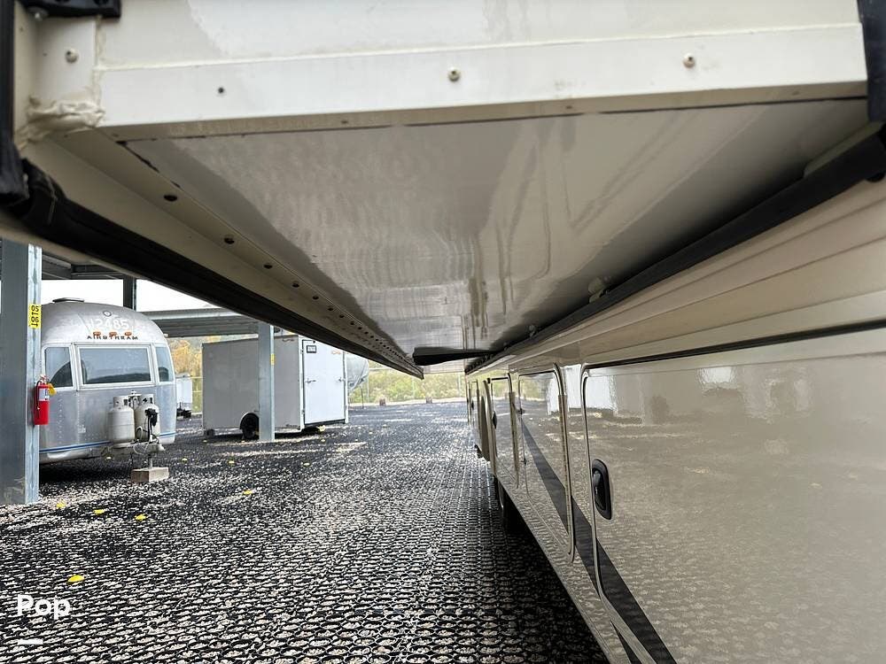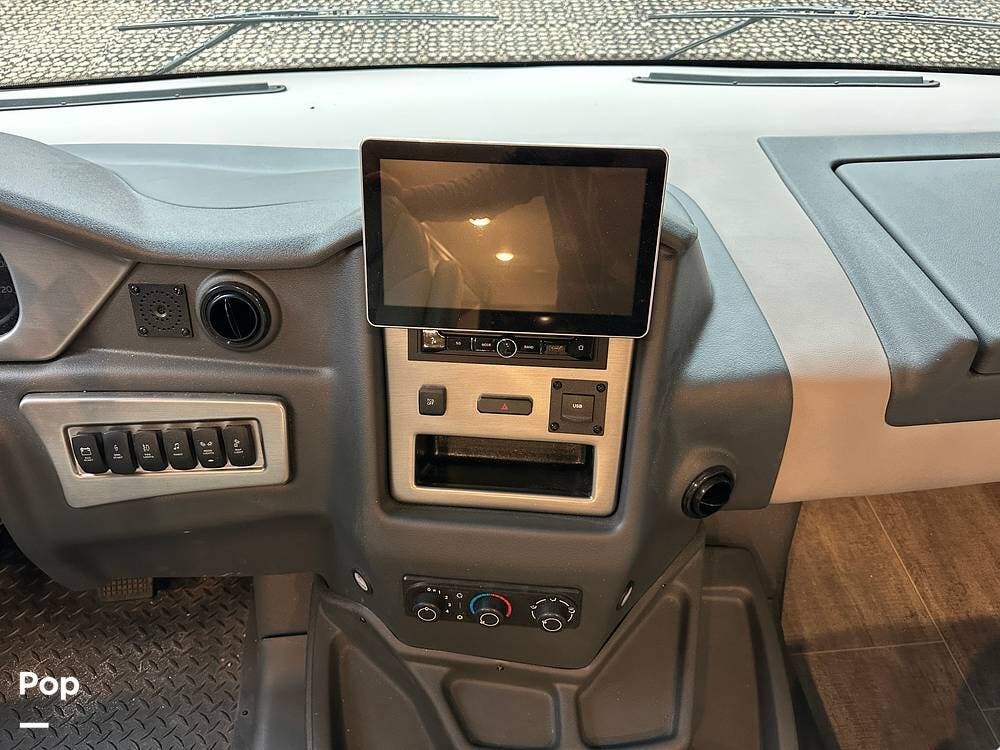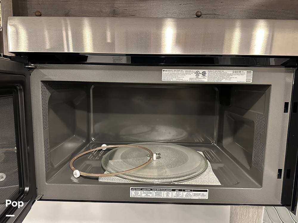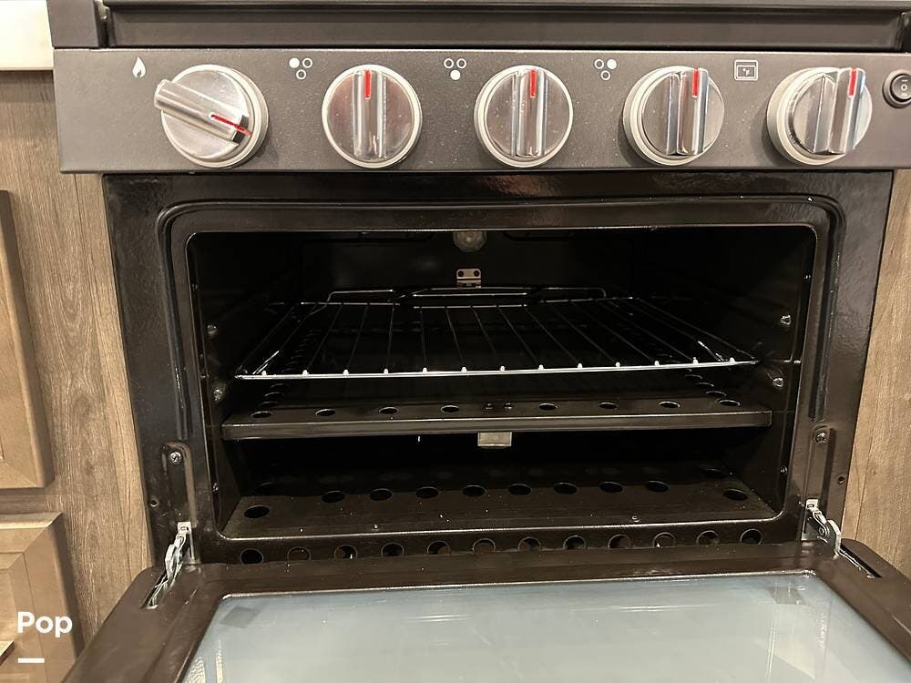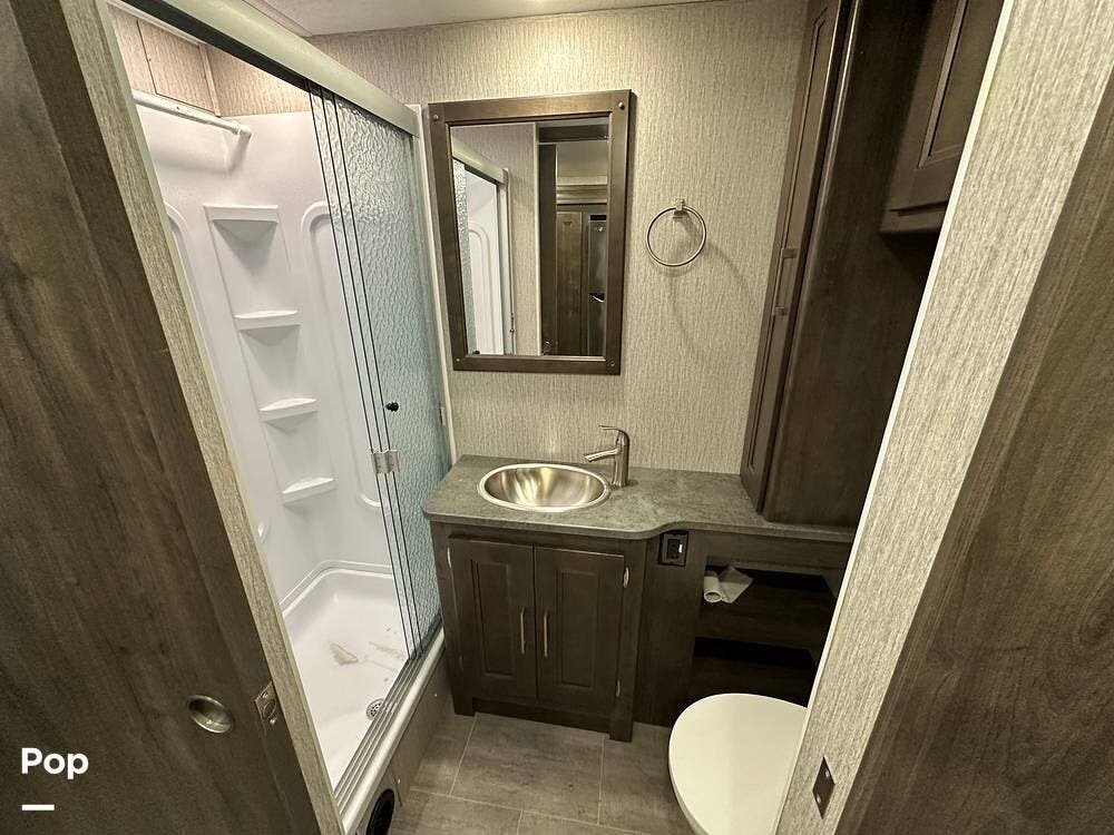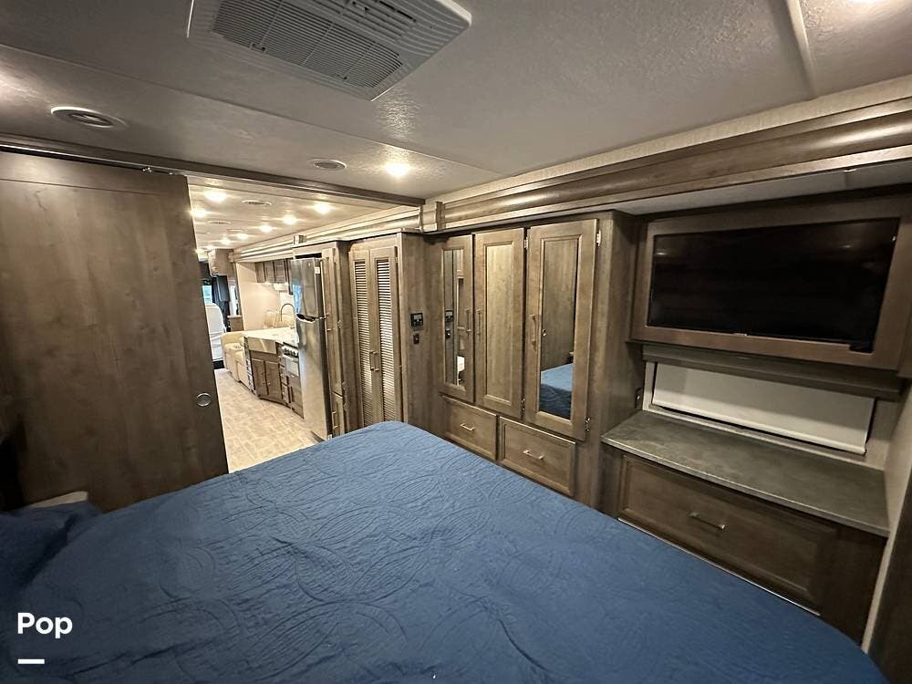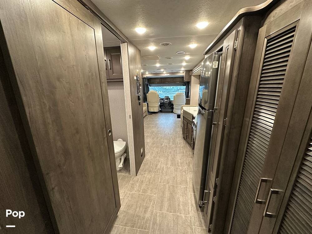 Step inside and you're greeted by an inviting, residential-style interior featuring elegant finishes and premium materials. The open floor plan creates a roomy atmosphere, with dual slides that expand the living area for maximum comfort. A plush sofa and theater seating make it easy to relax, while the large entertainment center and cozy fireplace bring all the comforts of home on the road.