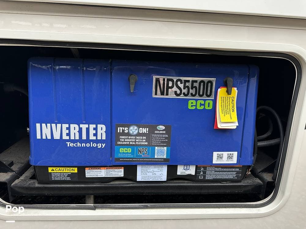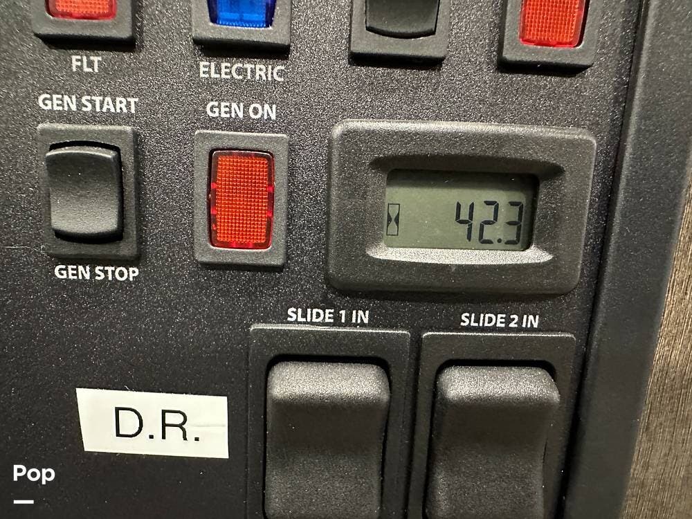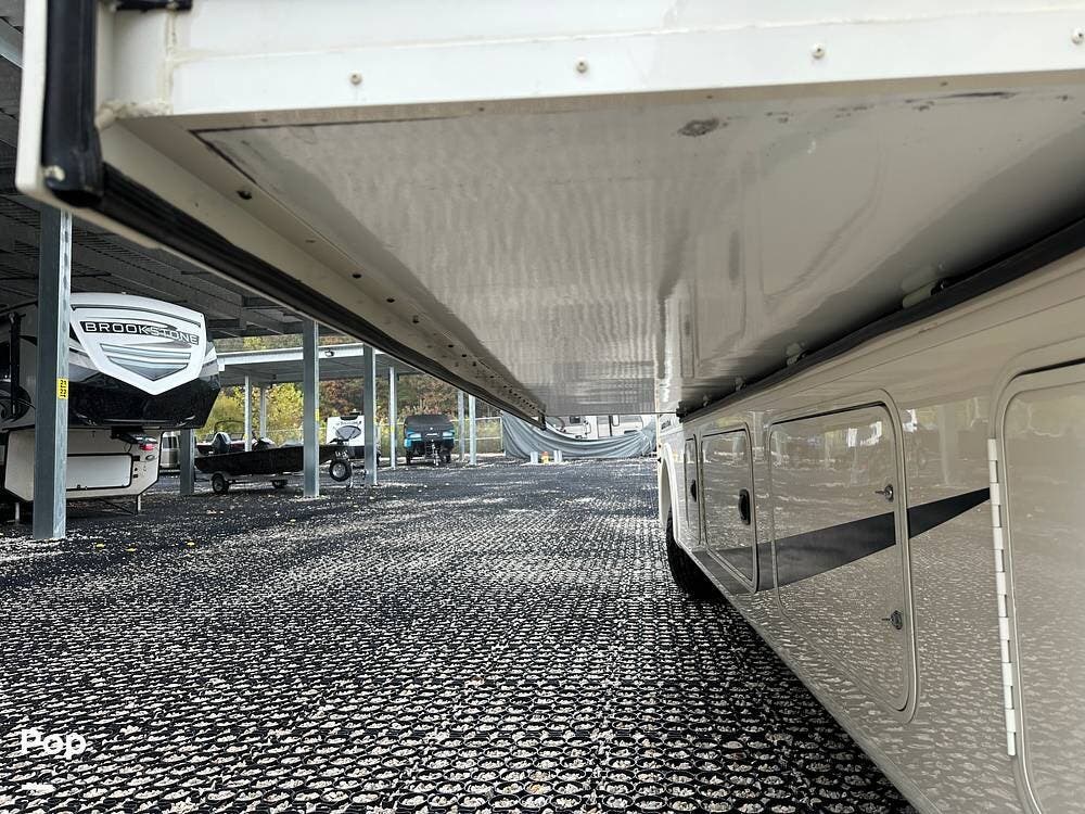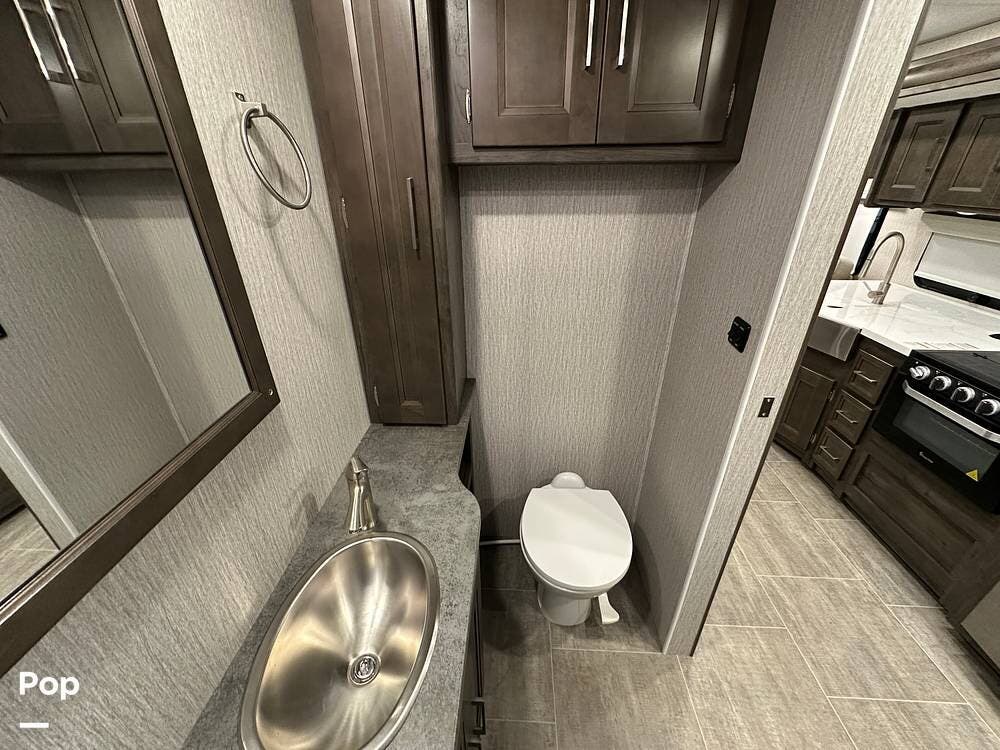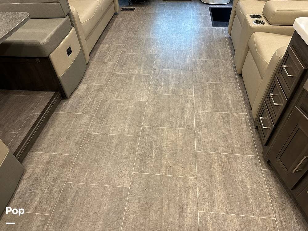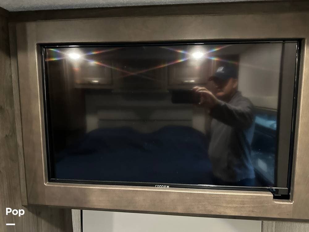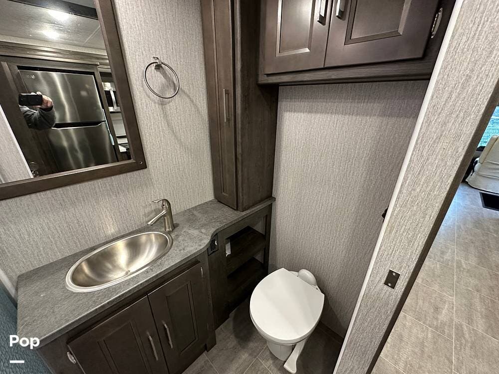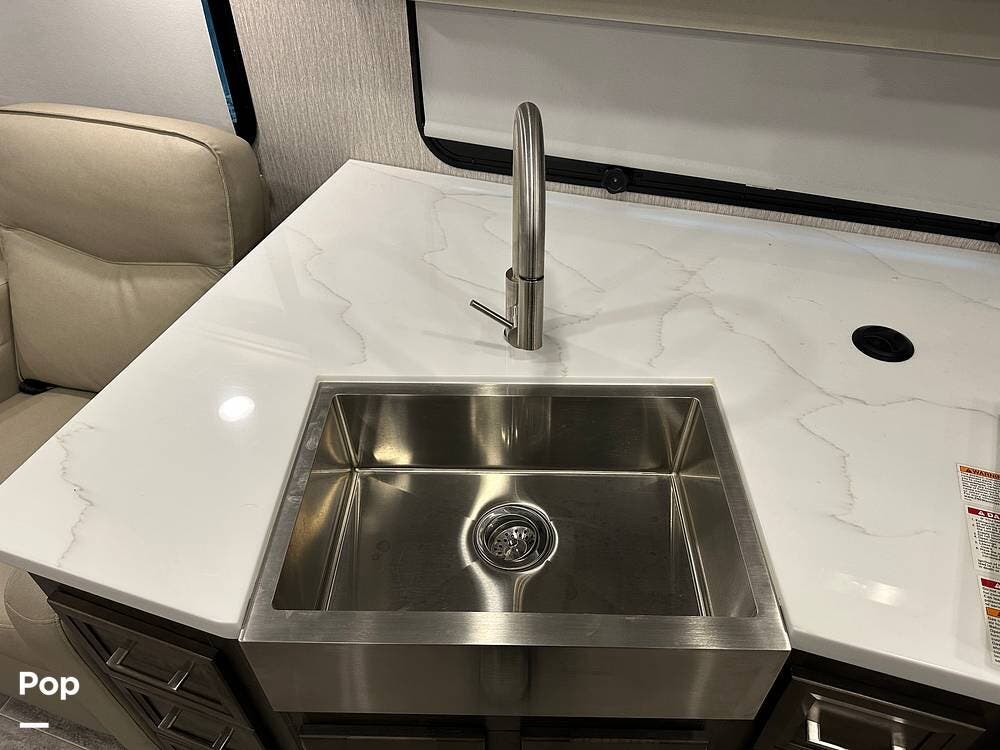 Step inside and you're greeted by an inviting, residential-style interior featuring elegant finishes and premium materials. The open floor plan creates a roomy atmosphere, with dual slides that expand the living area for maximum comfort. A plush sofa and theater seating make it easy to relax, while the large entertainment center and cozy fireplace bring all the comforts of home on the road.
