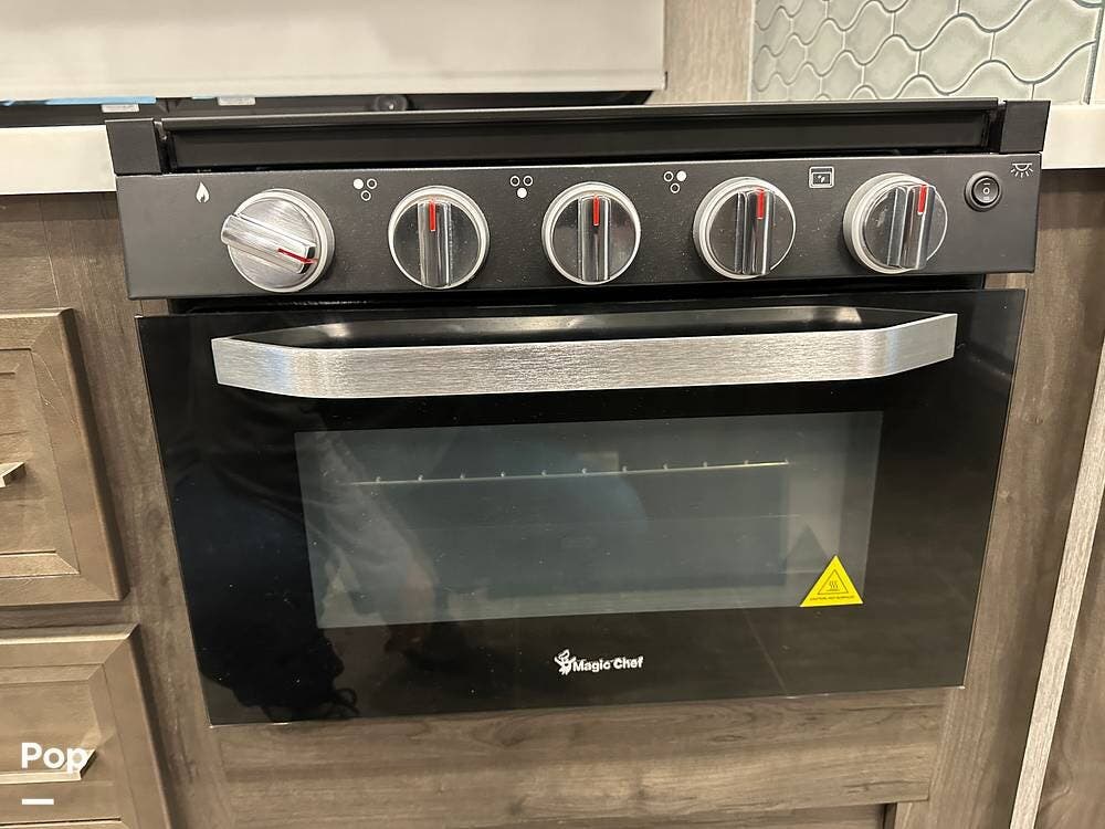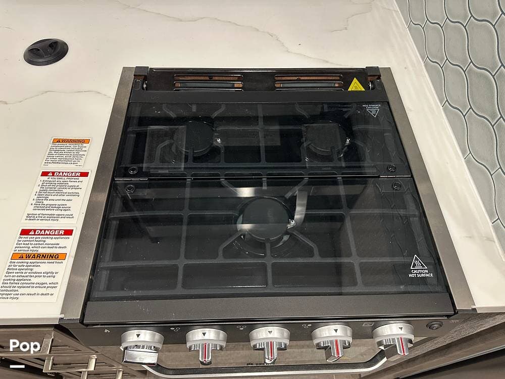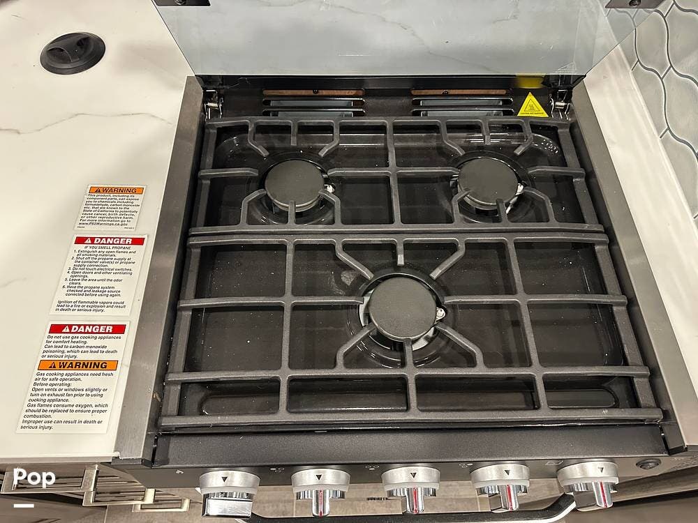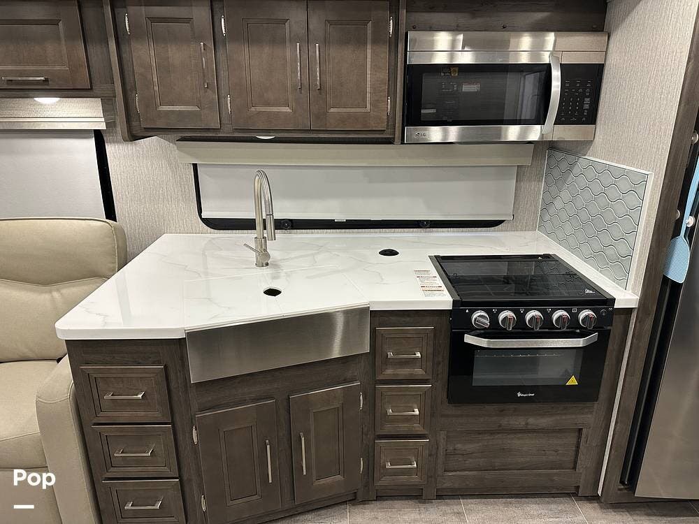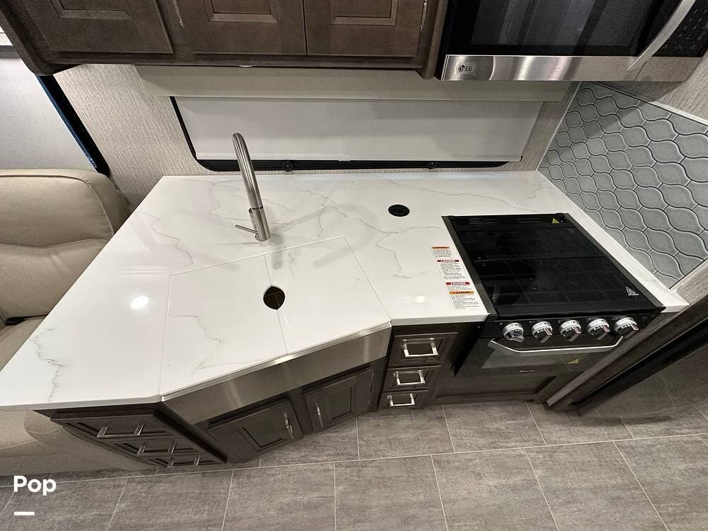 The fully equipped kitchen features solid-surface countertops, a residential refrigerator, and a three-burner cooktop -- ideal for preparing meals wherever your journey takes you.
