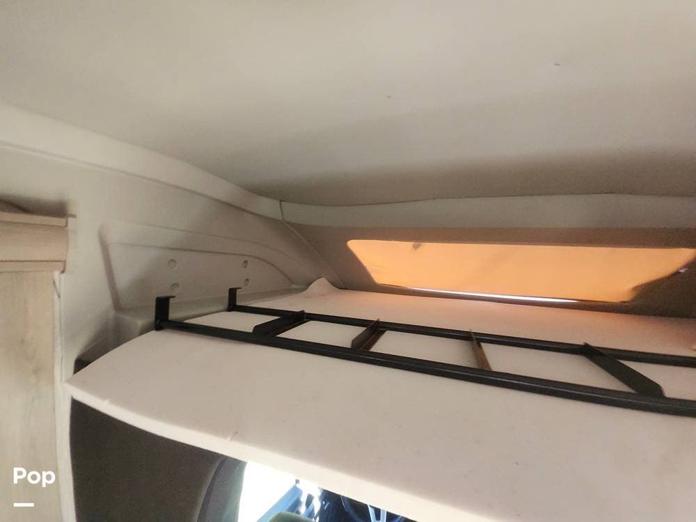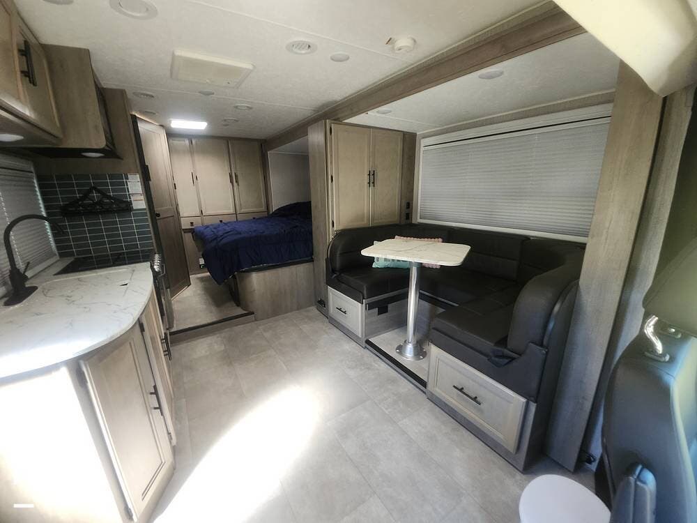 The Select 24FSS floorplan features a drop-down above the cab bed, a dinette booth across the full kitchenette with the queen bed, and a full bathroom to the rear.