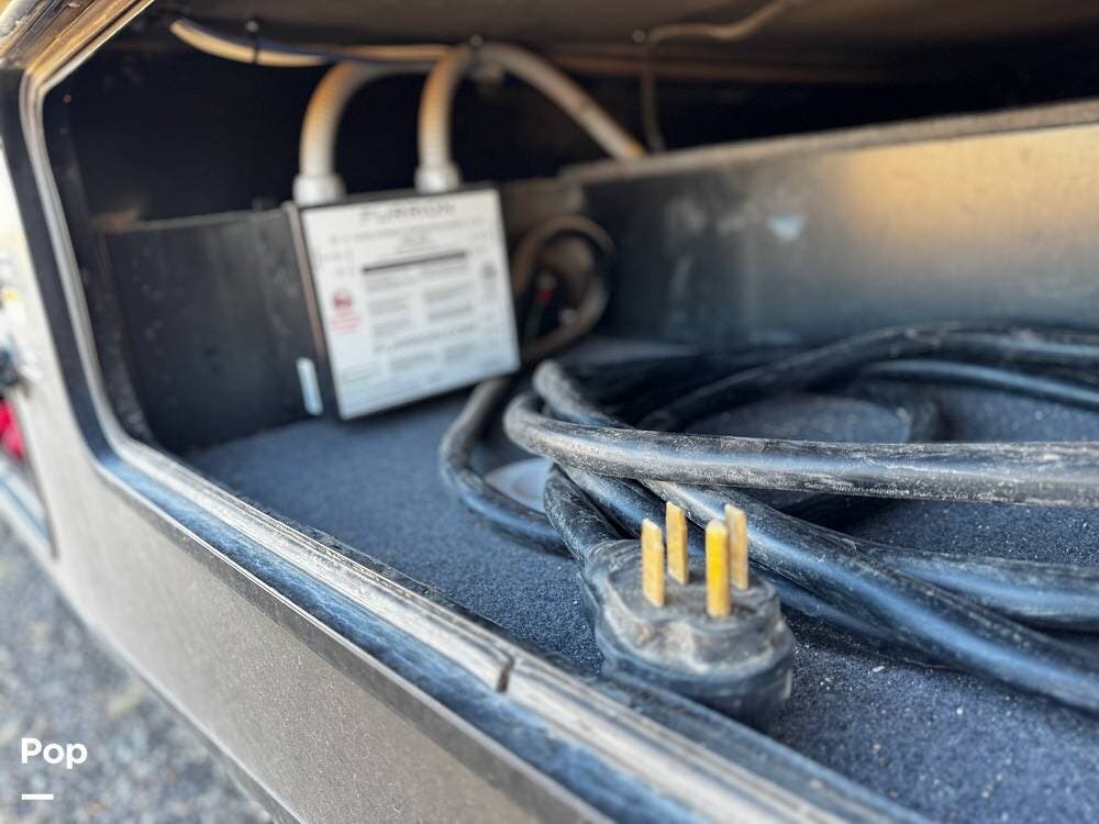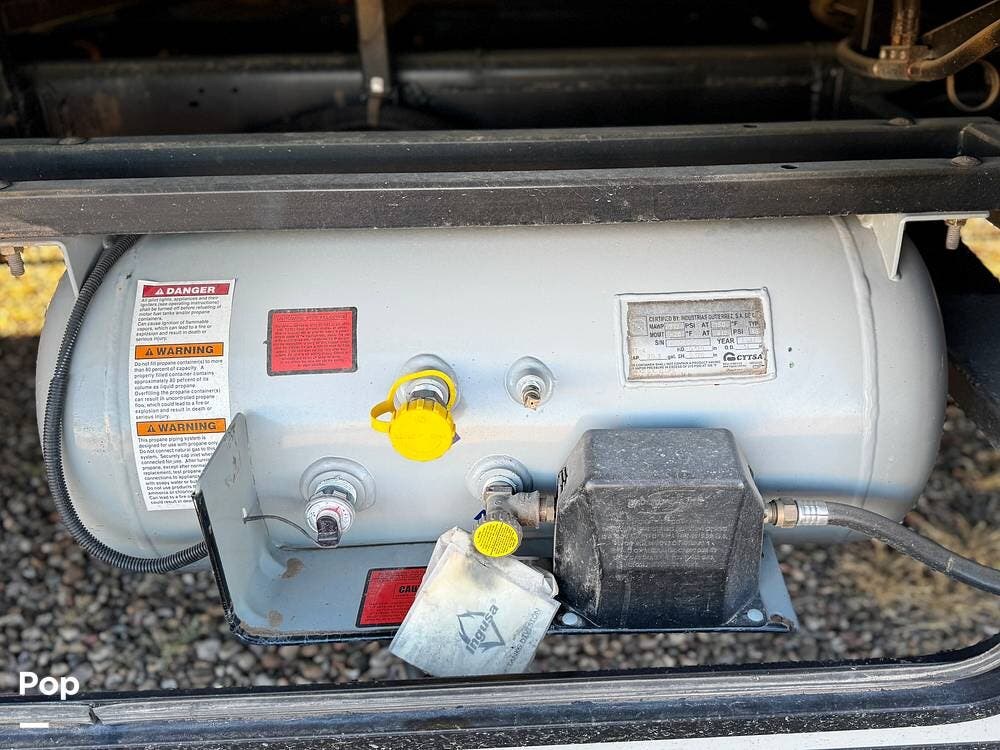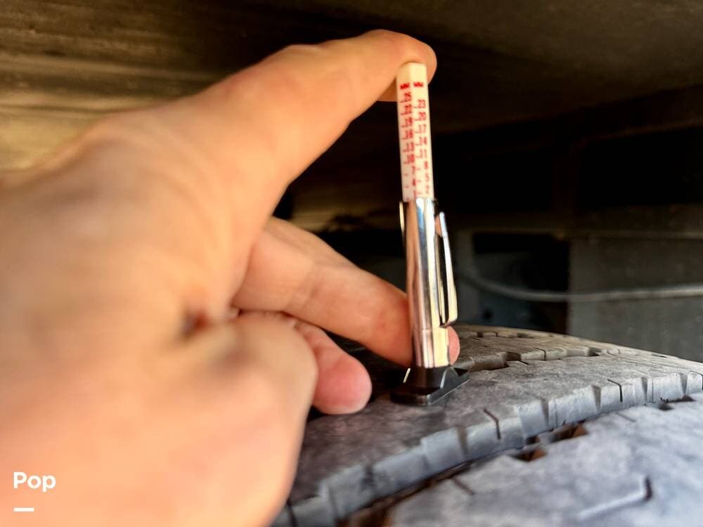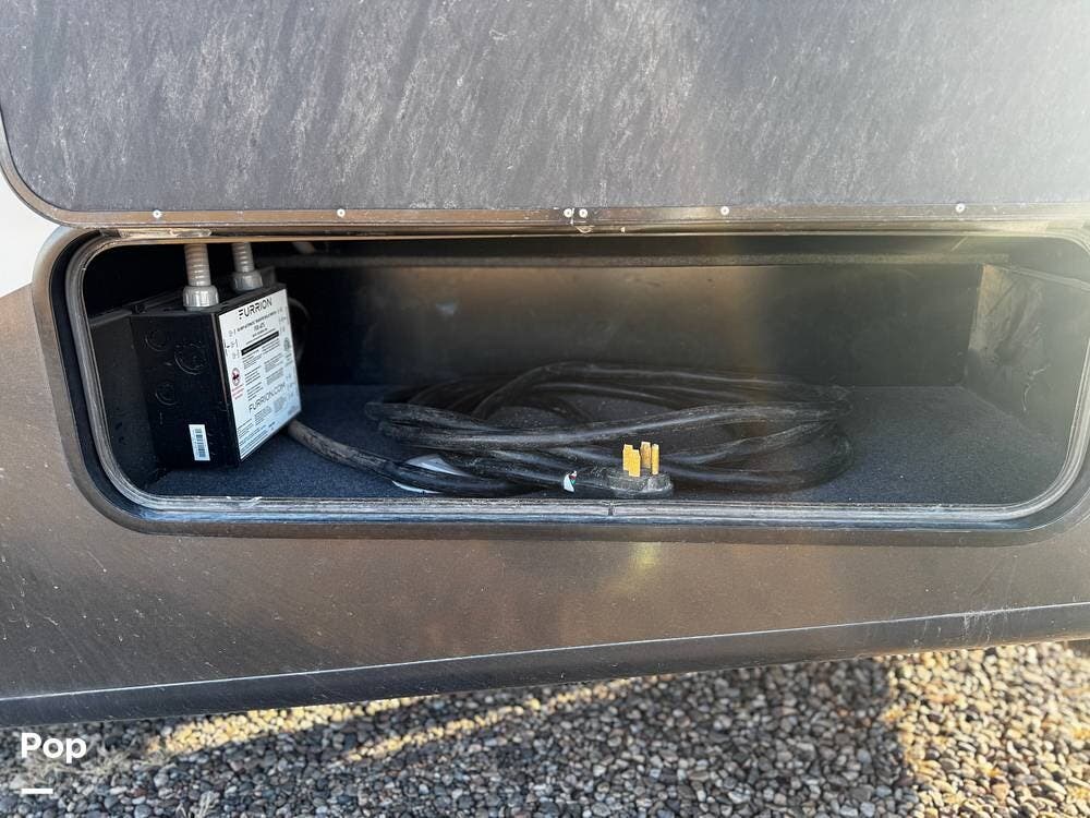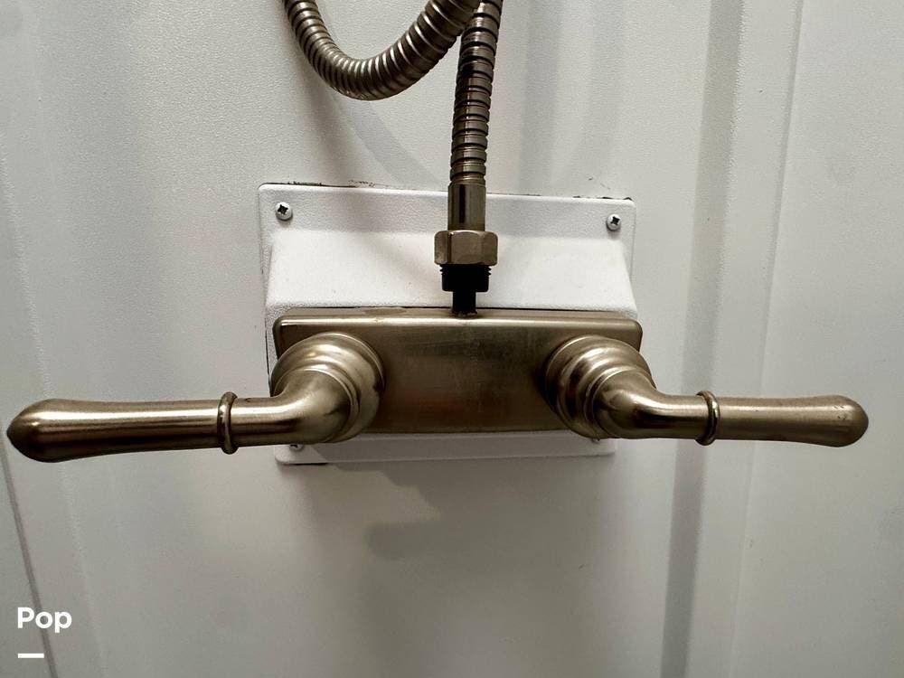 Outside, under the armless electric patio awning, is a flat-screen TV to watch the big game. The seller is throwing in a Blue Ox Alpha II tow hitch! All you need is the specific hitch pins for your tow vehicle. The seller is also sweetening the deal with a Blue Ox Patriot II brake controller (it needs a new charger cord).