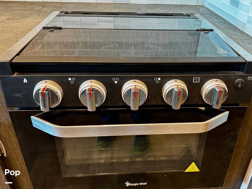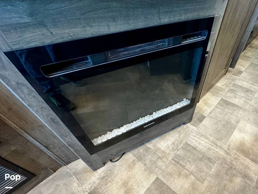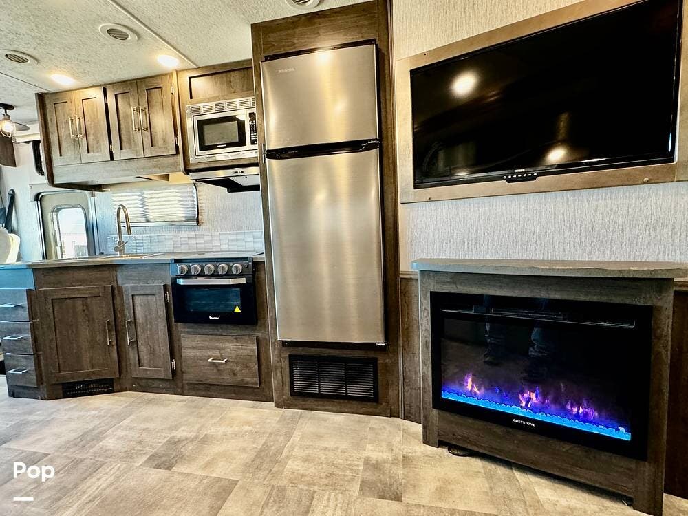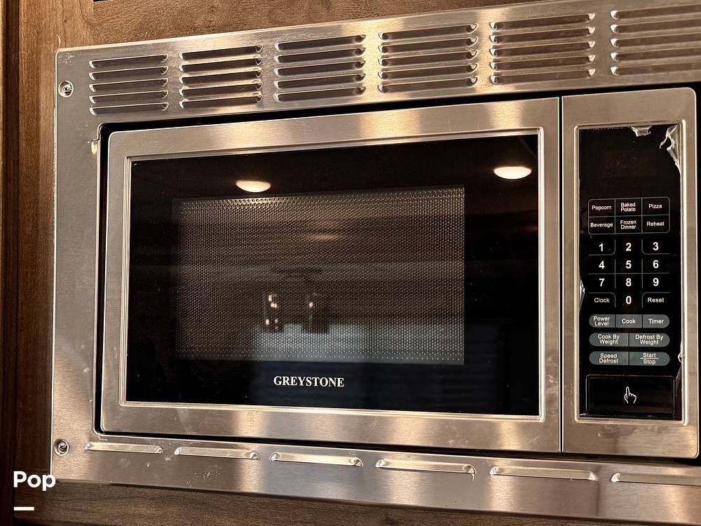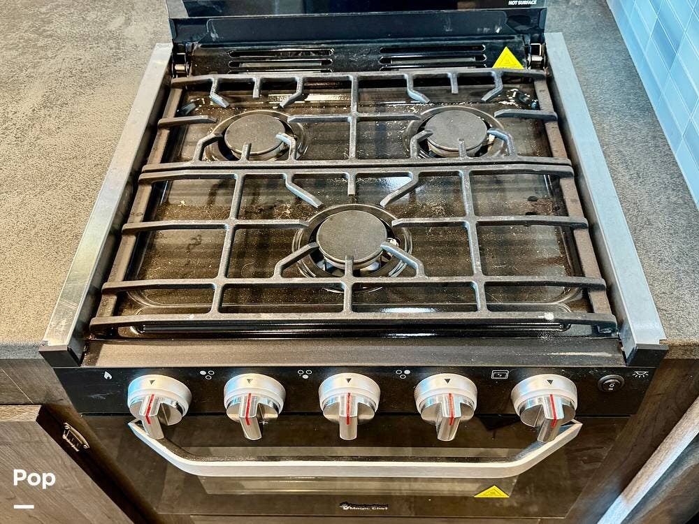 The interior has a residential feel with high-end, leather furniture. This coach has theater seating, a large HD TV, and a fireplace in the living area. The full kitchen has all the amenities of home, including a 3-burner stove with oven and a microwave with a light/vent hood.