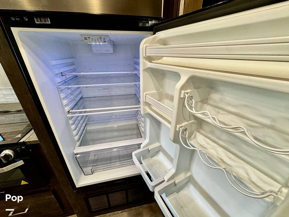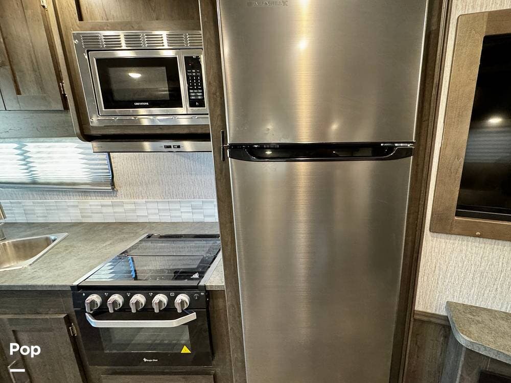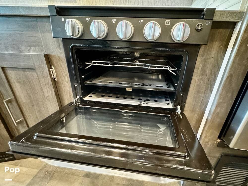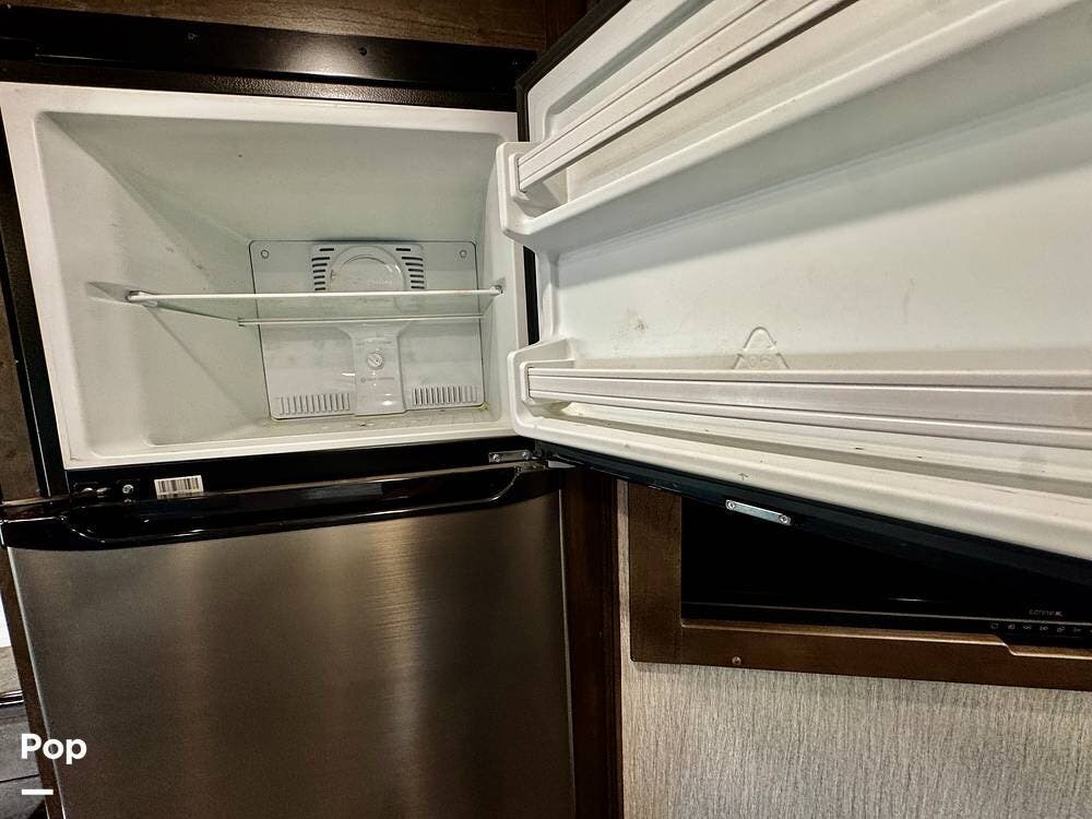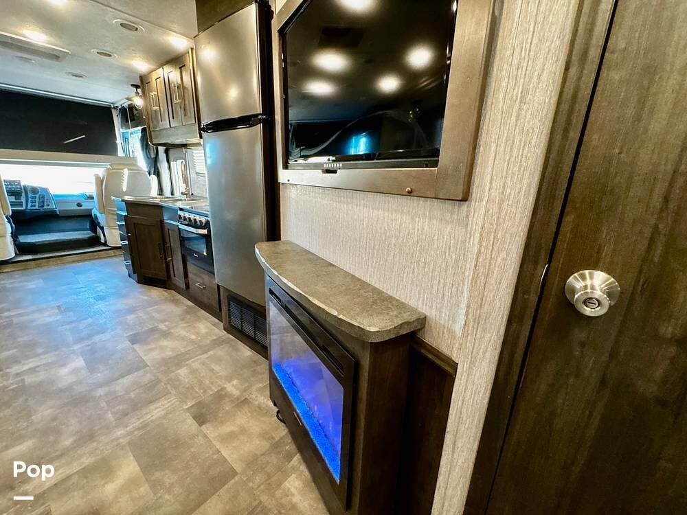 The interior has a residential feel with high-end, leather furniture. This coach has theater seating, a large HD TV, and a fireplace in the living area. The full kitchen has all the amenities of home, including a 3-burner stove with oven and a microwave with a light/vent hood.
