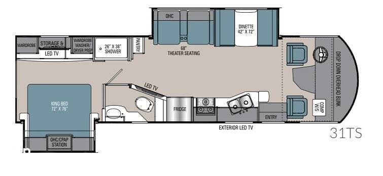 Designed for families and serious travelers alike, this coach is built on a proven Ford F-53 chassis powered by a Ford 7.3L V8 (350HP 468 lb-ft of torque). The Pursuit 31TS delivers a smooth ride with plenty of power for towing up to 5,000 lbs, and getting you up those hills and steep grades.