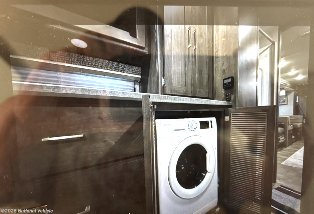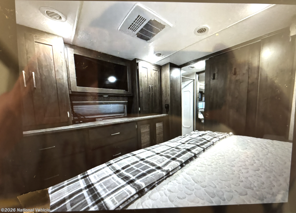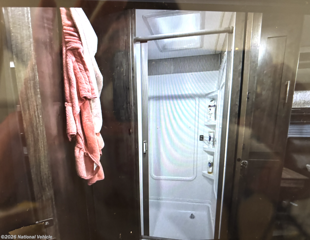 The rear private bedroom offers a relaxing retreat with a walk-around king bed, large wardrobe, and convenient access to the spacious full bathroom with a glass-enclosed shower. Additional sleeping accommodations include an electric drop-down cab-over bunk, allowing room for the whole family.