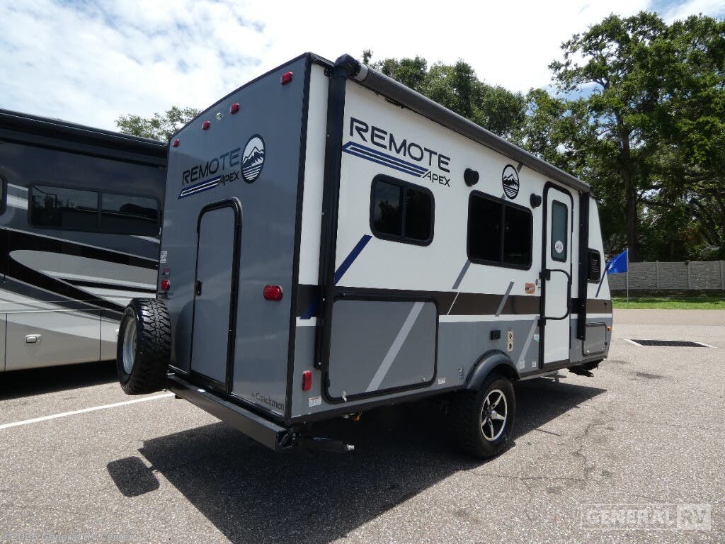 Discover the 2022 Coachmen Apex Remote 16R, a compact yet spacious travel companion perfect for your next adventure. This RV is designed to comfortably accommodate up to four people, featuring a cozy double bed and a convertible dinette for additional sleeping space. The clever layout maximizes every inch of its 19-foot frame, providing a front living area that seamlessly transitions into a central kitchen. The kitchen is equipped with a two-burner cooktop and a mid-size refrigerator, ensuring you have all the essentials to whip up delicious meals on the road. The Apex Remote 16R boasts a thoughtful design with ample storage and a center bath complete with a shower curtain for privacy. Enjoy the great outdoors under the 12-foot powered retractable awning, perfect for relaxing or entertaining. With a robust fresh water capacity of 50 gallons and durable 15-inch all-terrain tires, this RV is ready to take you off the beaten path. Lightweight yet sturdy, it offers a cargo capacity of 940 pounds, making it easy to bring along all your gear. For more details and to experience this model firsthand, visit your nearest General RV dealership.