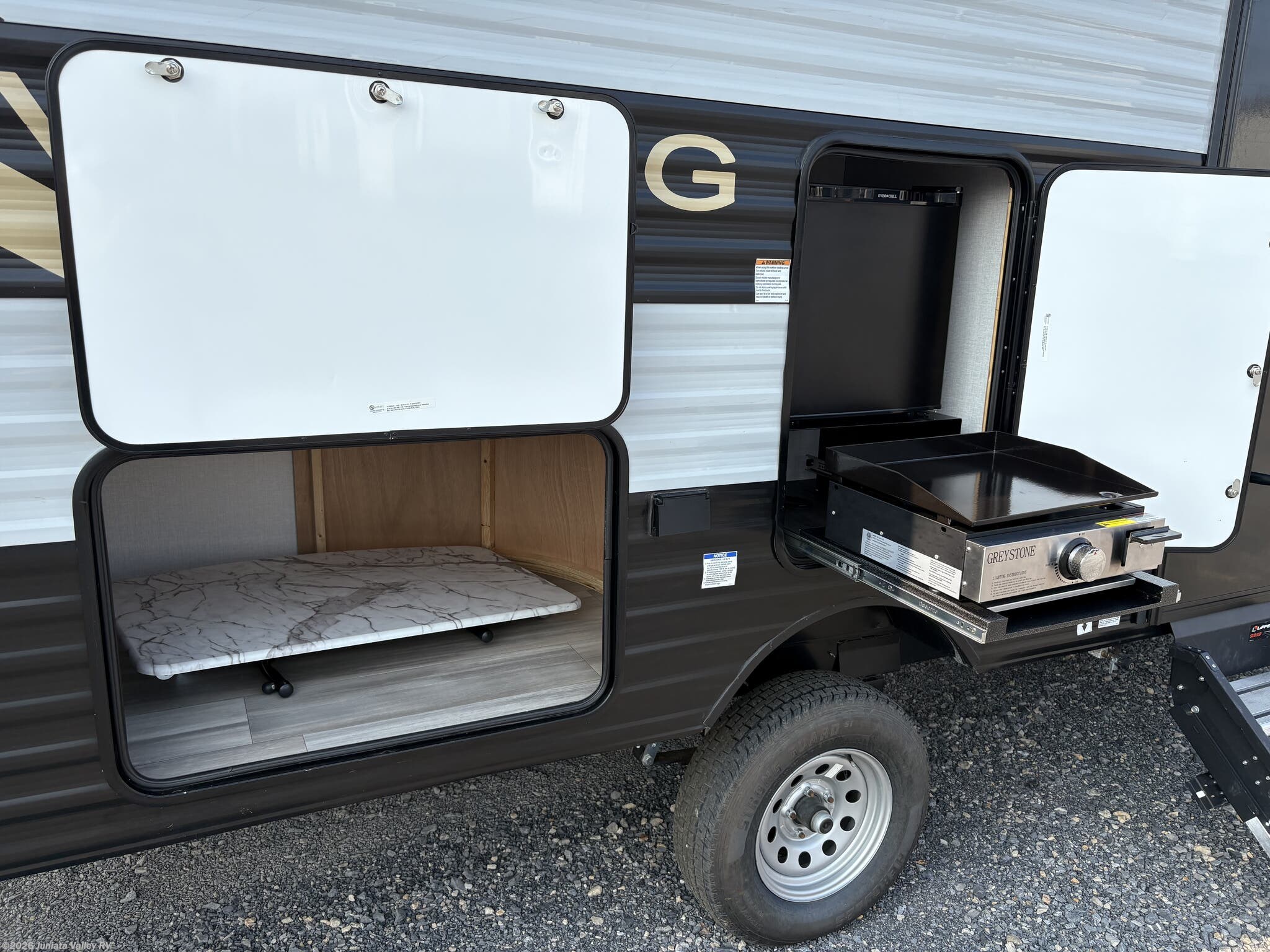 - Convenience: Stabilizer jacks • Spare tire kit • Screen door