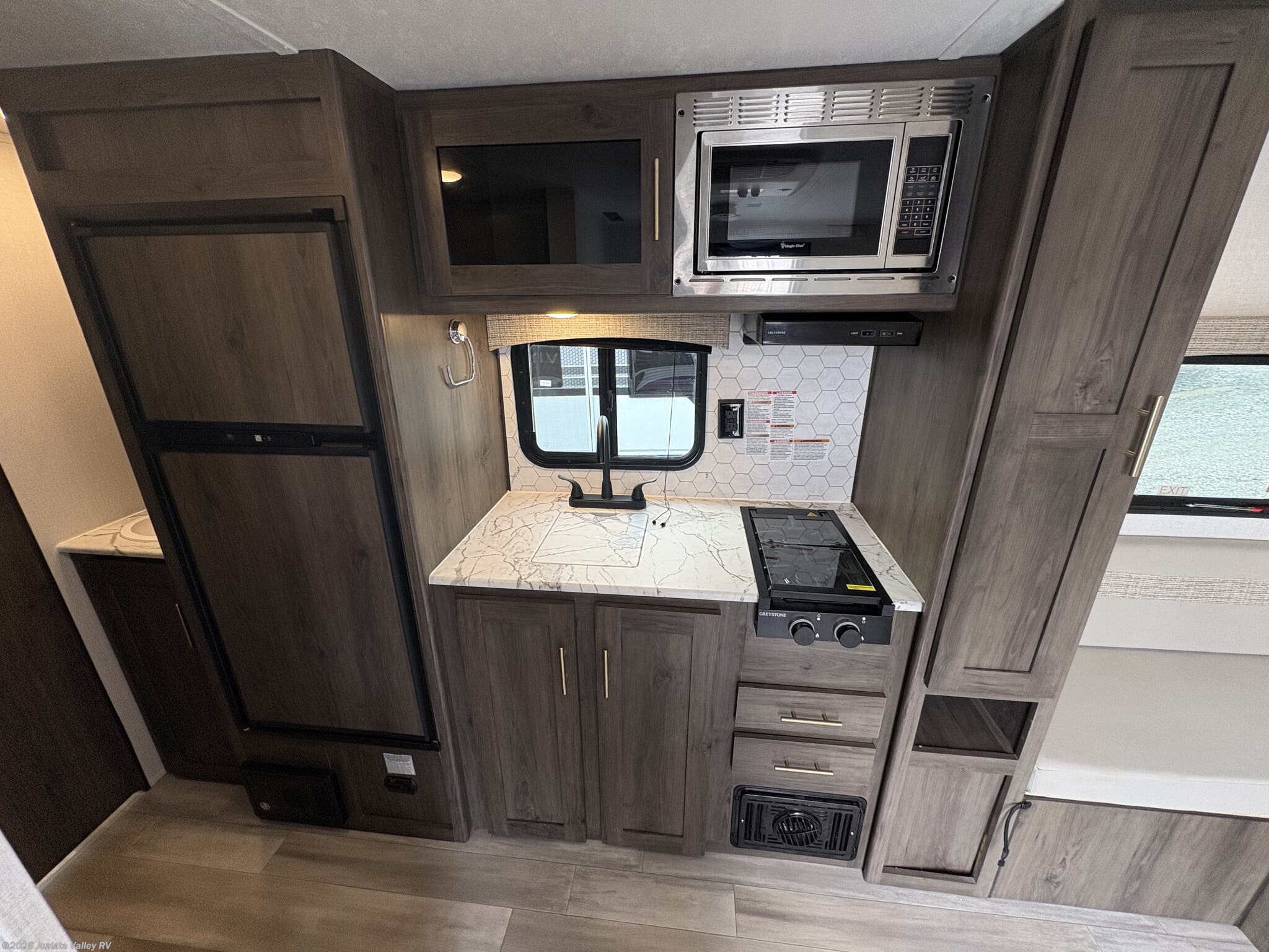- Exterior features: Power awning • Pass-thru storage • Exterior kitchen • Exterior refrigerator • Exterior grill • Outside speakers • Outside shower • Tinted windows