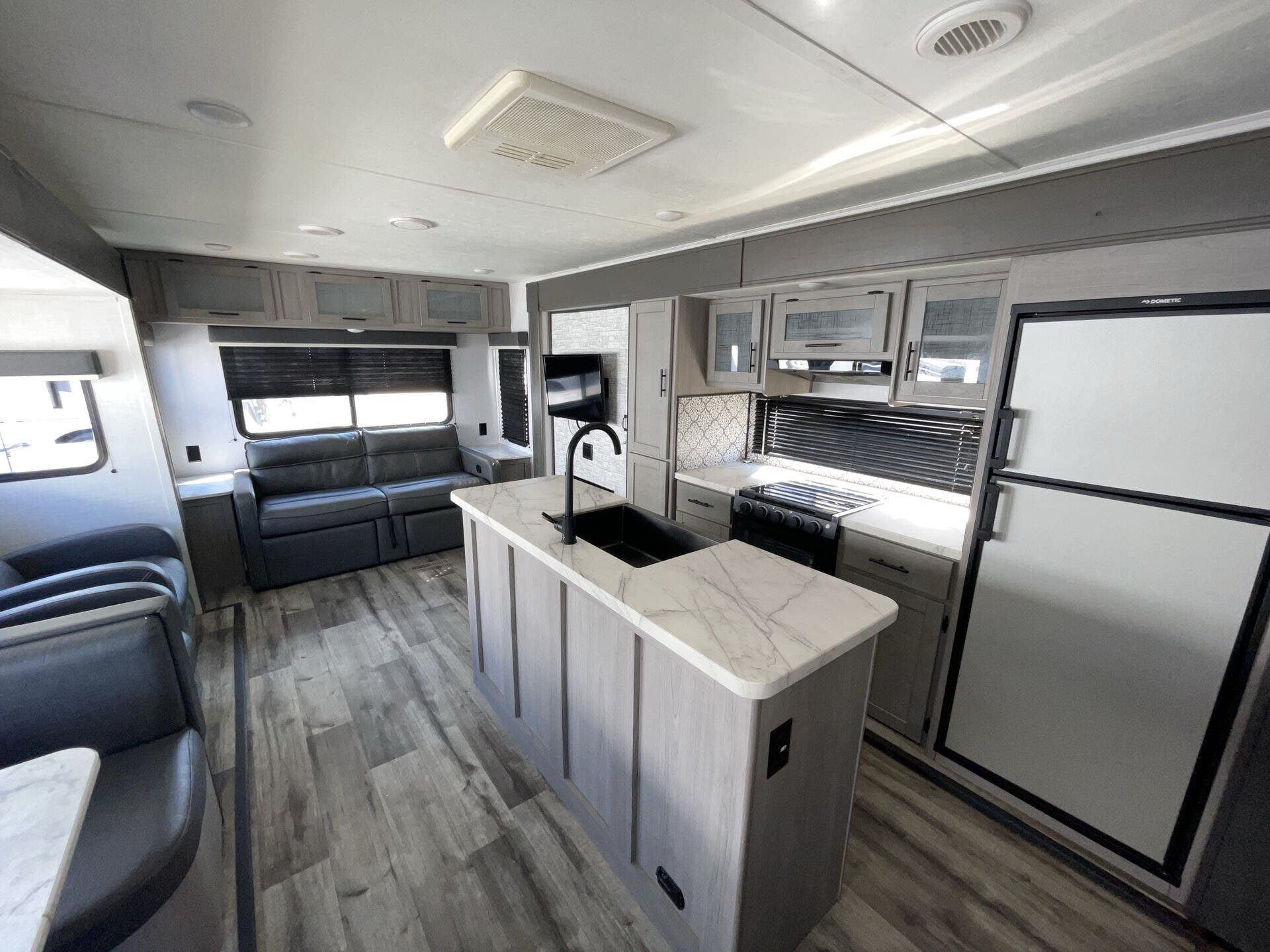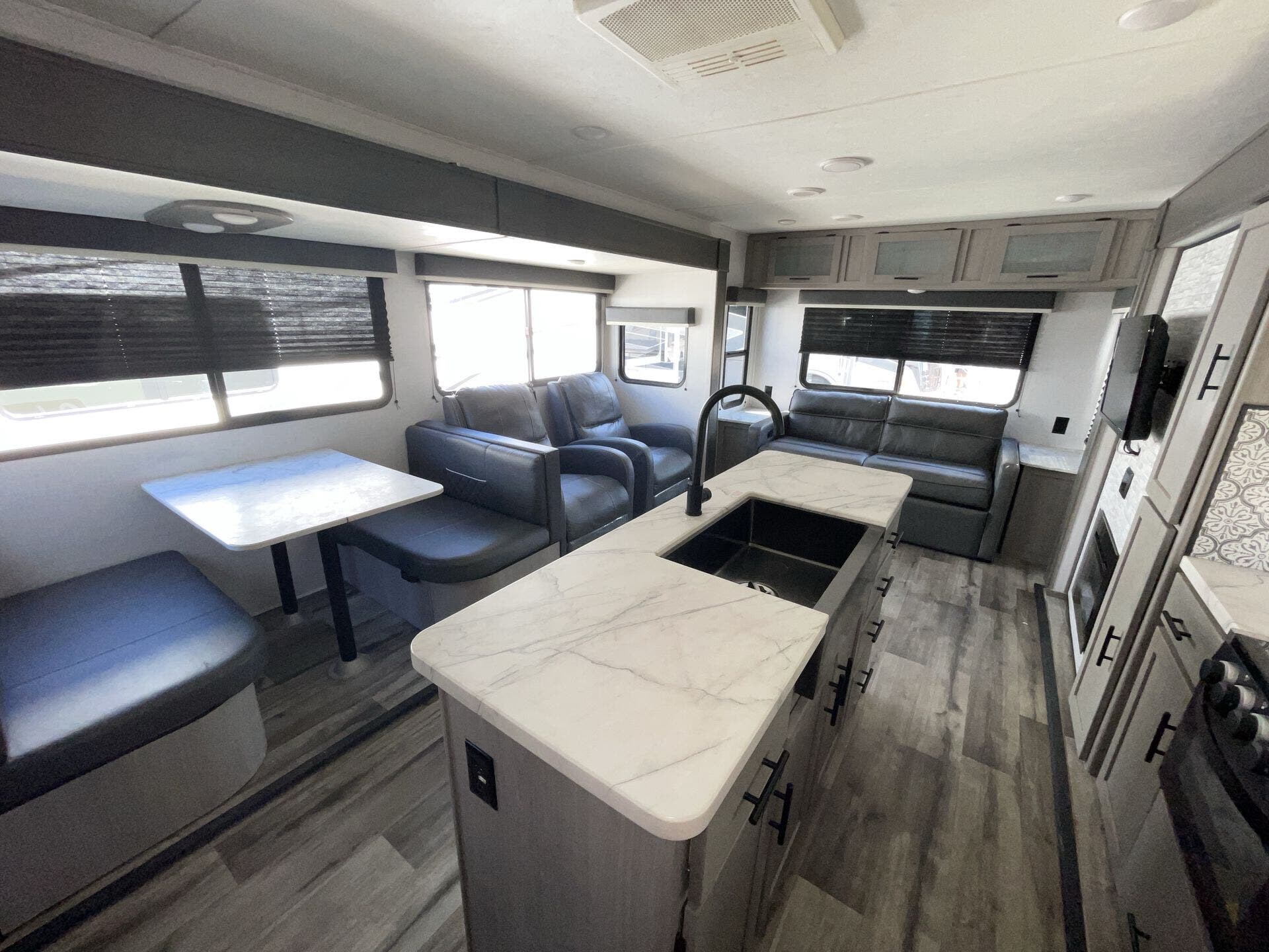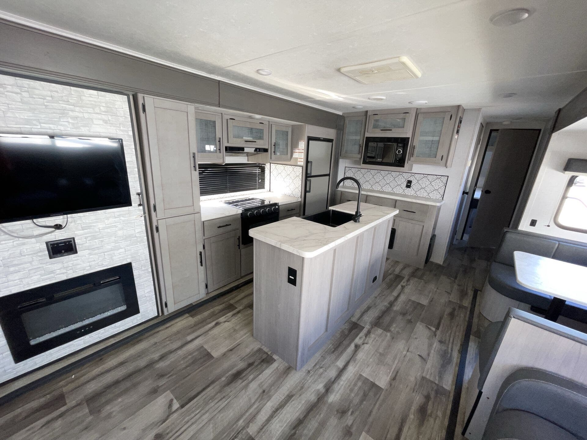 Inside, the rear-living layout creates an open and inviting atmosphere. Dual opposing slide-outs expand the living area, offering plenty of room to relax and entertain. The plush theater seating, tri-fold sofa, and booth dinette provide ample seating options, while the entertainment center with fireplace adds a cozy touch. The fully equipped kitchen features stainless steel appliances, a large pantry, solid-surface countertops, and a center island, giving you everything you need to prepare meals with ease.