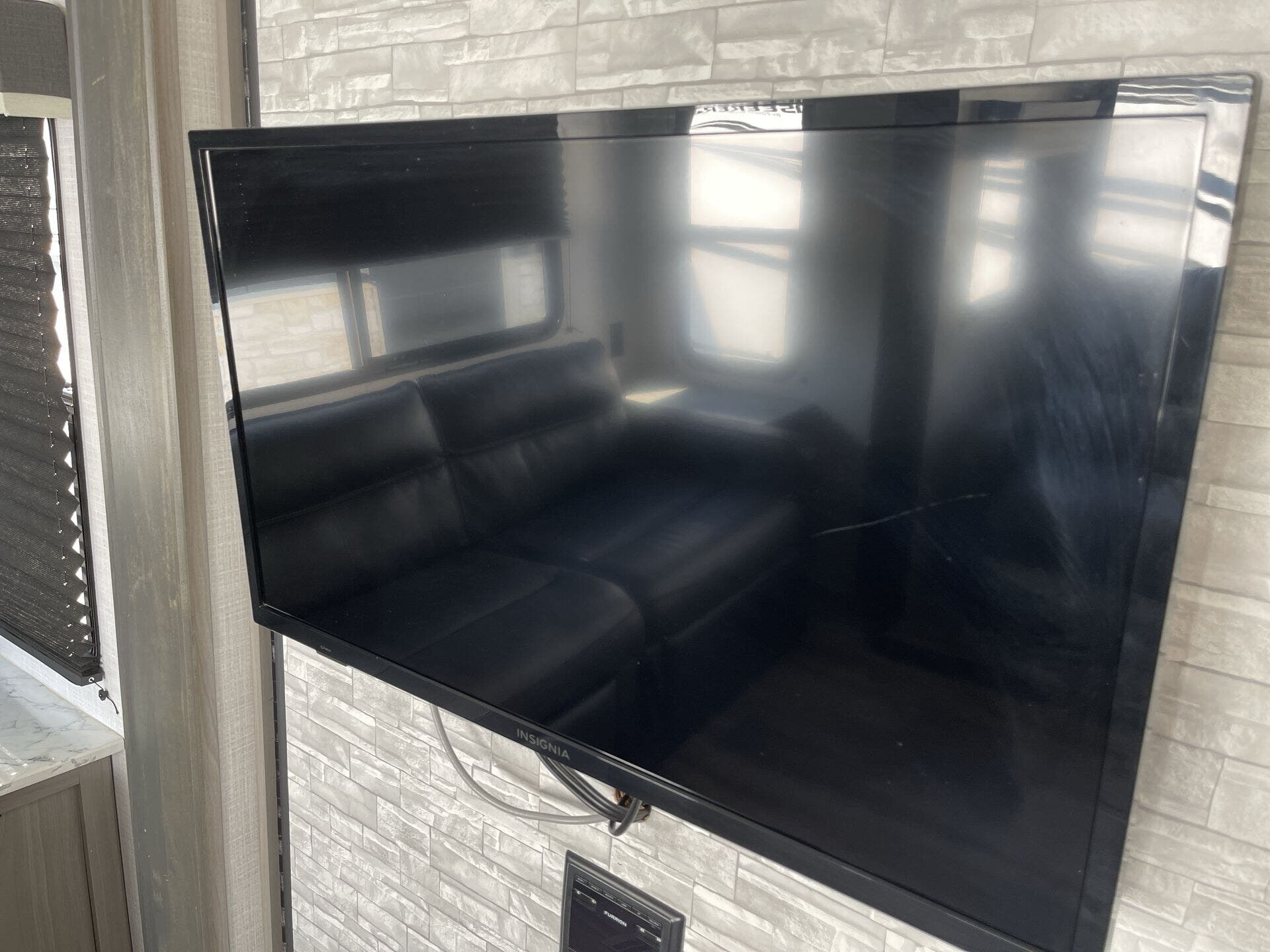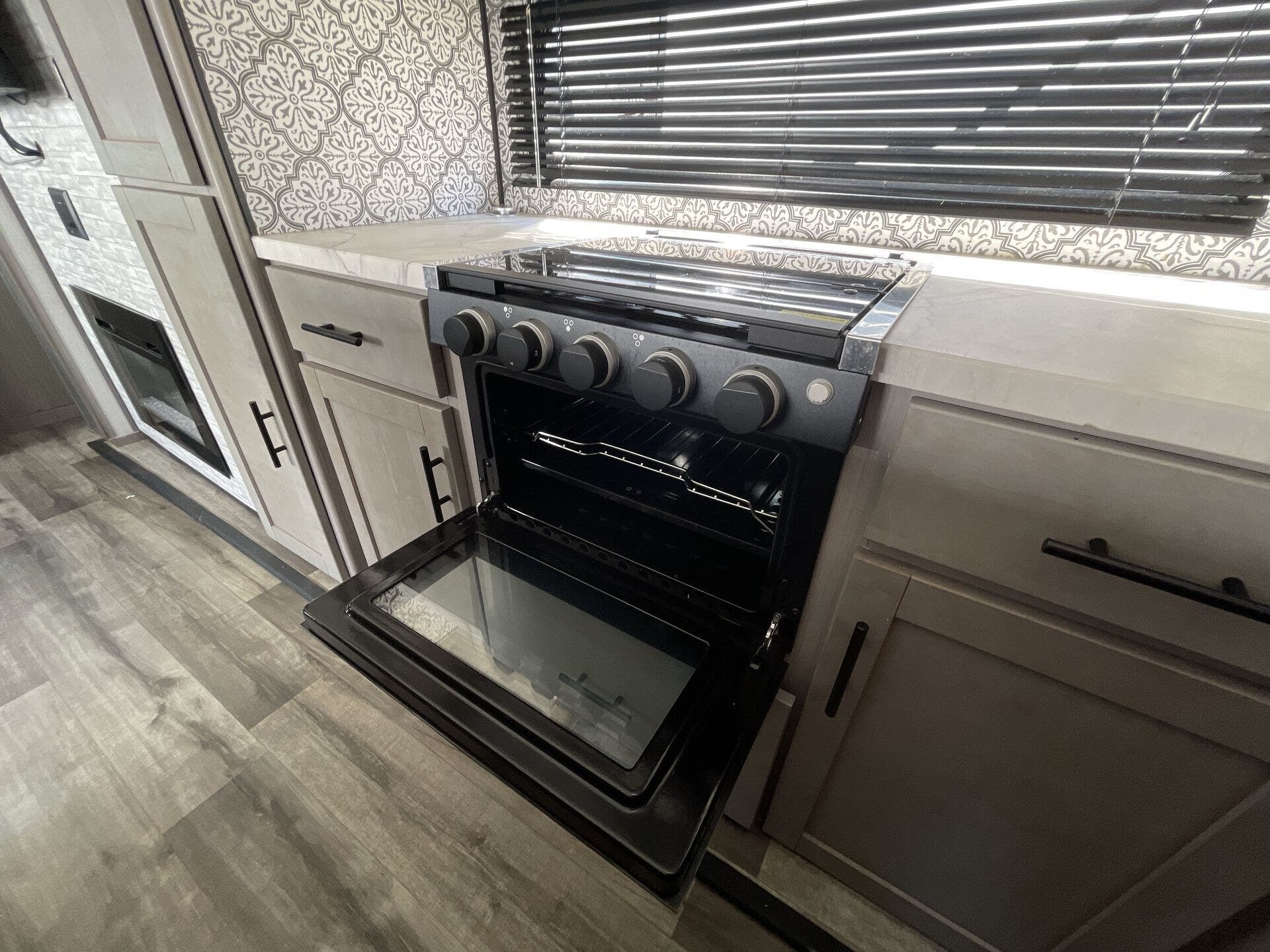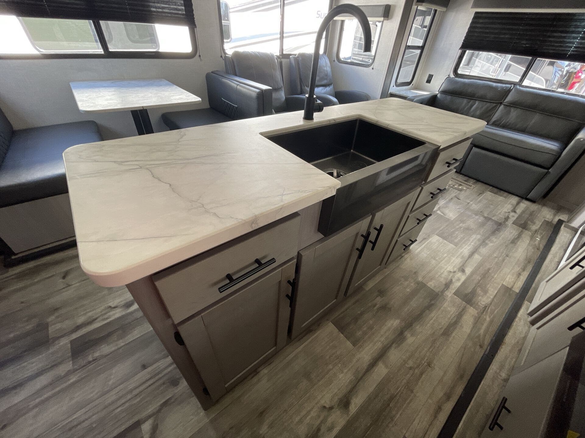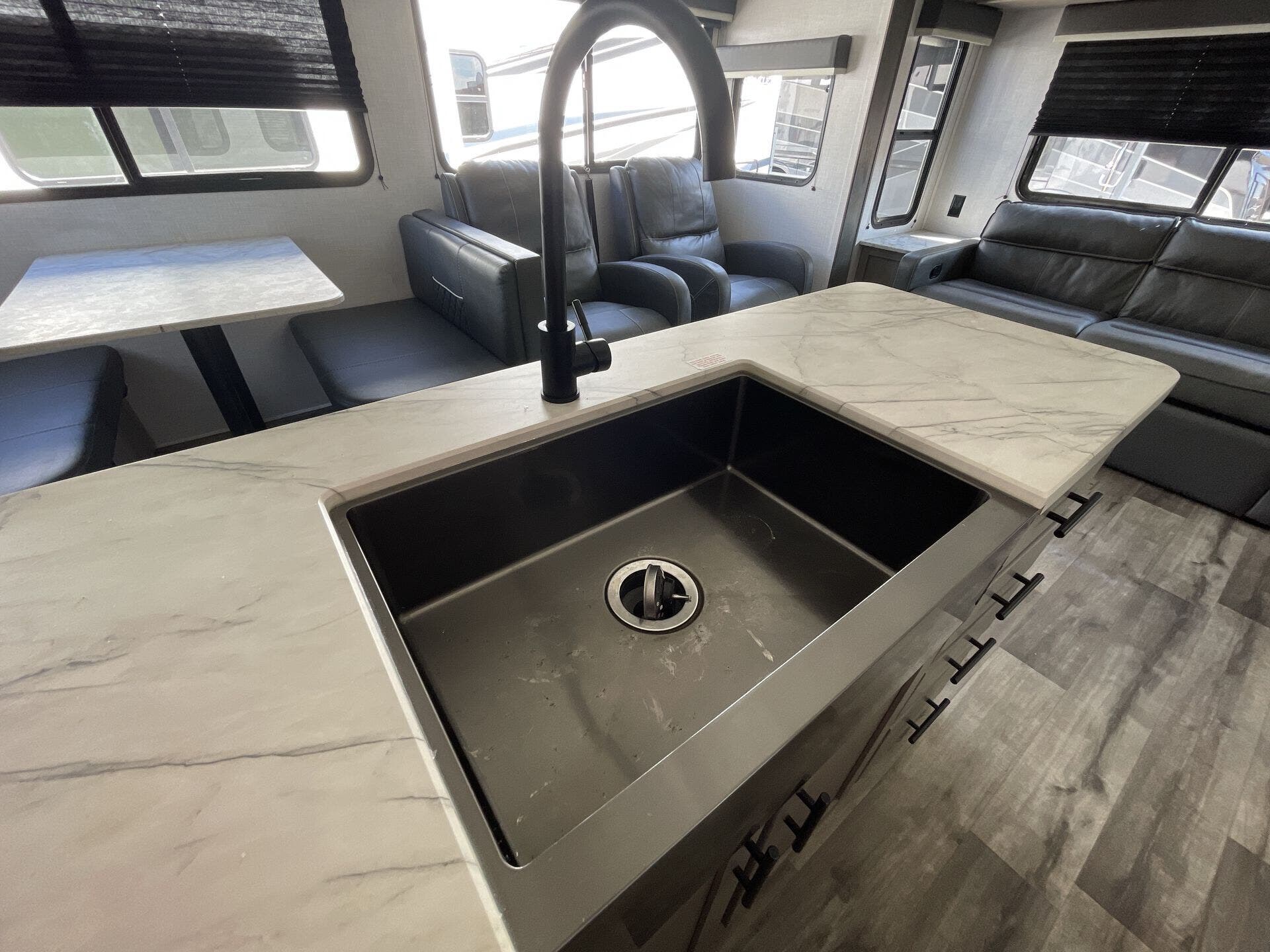 Inside, the rear-living layout creates an open and inviting atmosphere. Dual opposing slide-outs expand the living area, offering plenty of room to relax and entertain. The plush theater seating, tri-fold sofa, and booth dinette provide ample seating options, while the entertainment center with fireplace adds a cozy touch. The fully equipped kitchen features stainless steel appliances, a large pantry, solid-surface countertops, and a center island, giving you everything you need to prepare meals with ease.