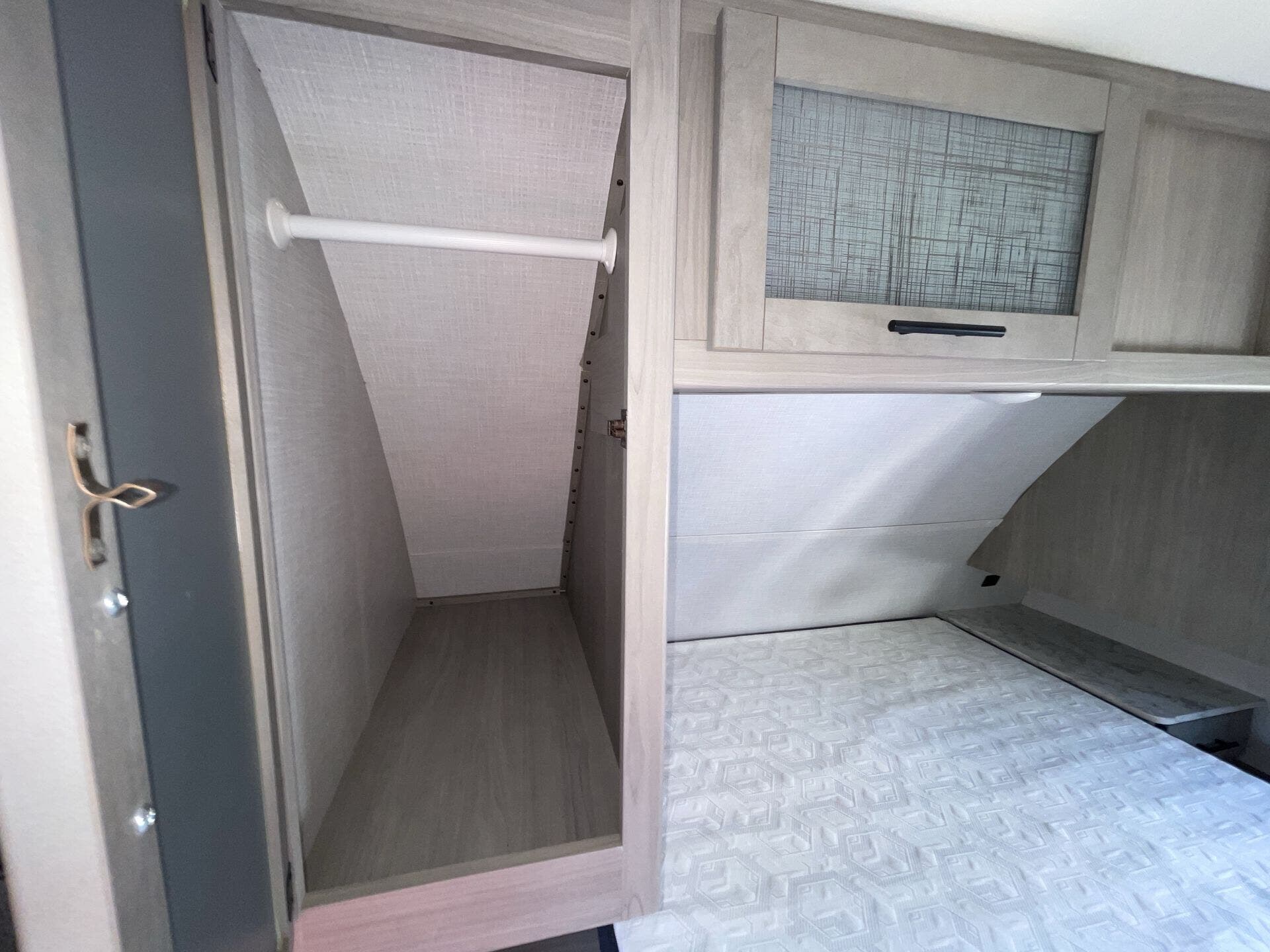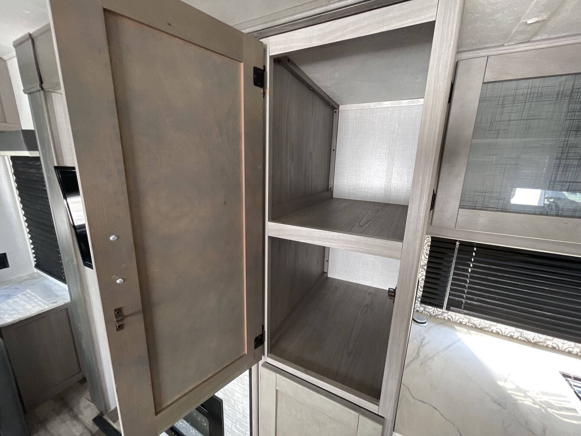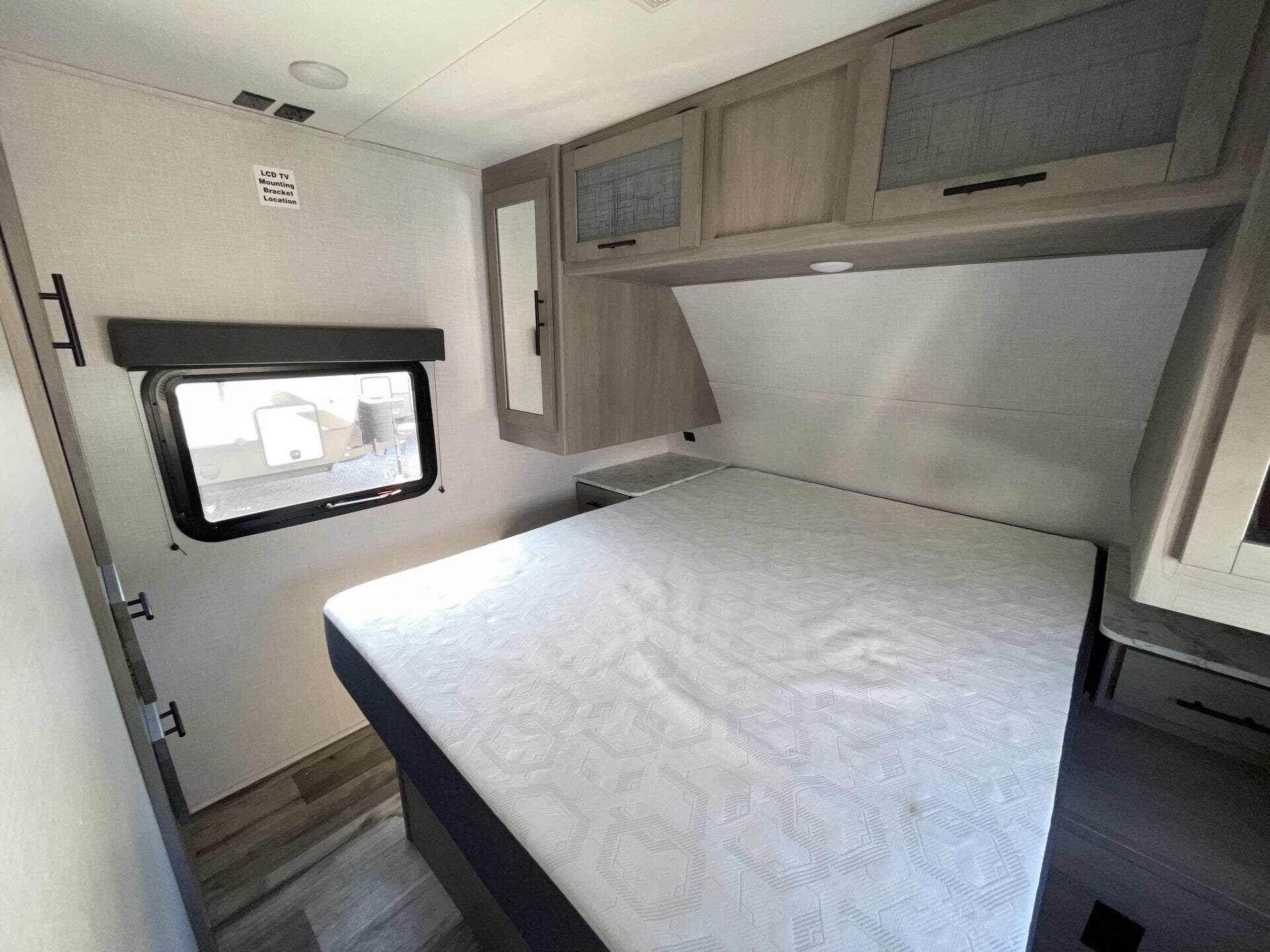 The private front bedroom offers a queen bed, dual wardrobes, and overhead storage for a restful retreat at the end of the day. The bathroom is equipped with a spacious shower, vanity, and linen storage, providing comfort and functionality. Outside, you’ll find a power awning with LED lighting, exterior speakers, and generous pass-through storage to keep your gear organized. Blending practicality with upscale comfort, the 2022 Coleman Dutchmen 2955RL is an excellent choice for RVers who want a homey, well-appointed trailer for every adventure.