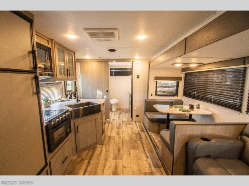 The Dutchmen Coleman Light travel trailer features an upgraded kitchen package with residential appliances, high-rise faucets, and a stainless steel farm-style sink. The fully enclosed underbelly allows all of your trailer's vital functions to be kept out of the freezing cold, and you'll have great stability as you enter your trailer by using the solid entry steps. Each model includes power stabilizer jacks, a power tongue jack, dual 20-LB propane tanks, a residential queen bed, and preparations for Wi-Fi 4G LTE. There is an aerodynamic front fiberglass cap, exterior speakers, solar charging connection, and aluminum wheels.