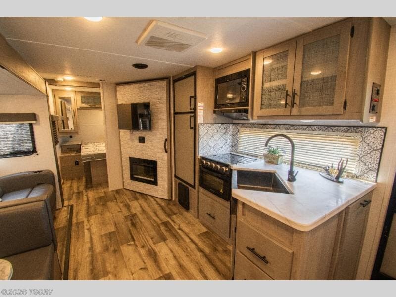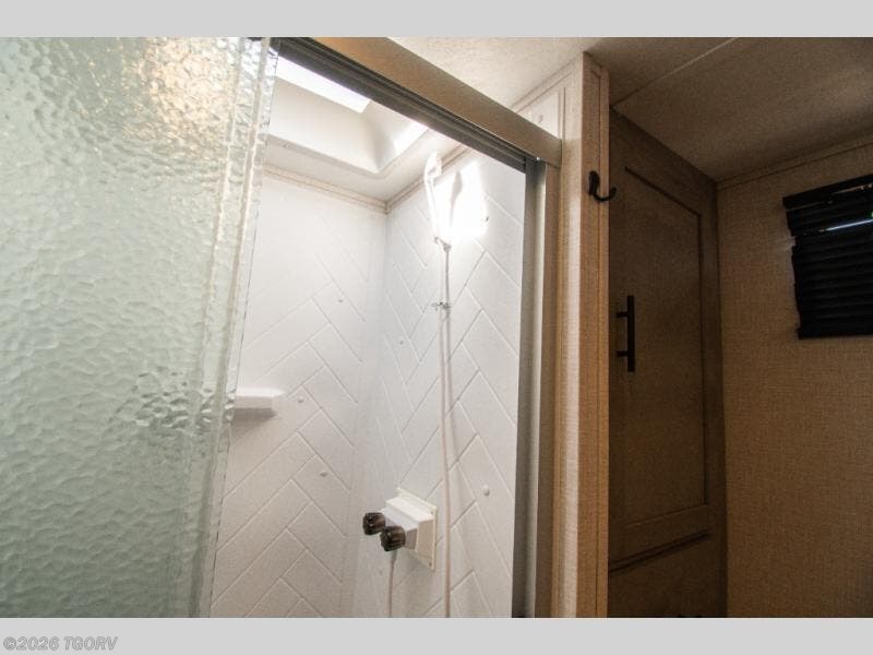 Have fun seeing the country with this Coleman Light travel trailer! You can hunker down back in the woods, or you can head out to a popular campsite to visit with friends. Whatever you choose to do, this trailer will make it fun. It has a hinged entertainment center with a hidden pantry behind it. There is also a fireplace below the entertainment center, and when you are sitting on the reclining sofa or booth dinette, you can benefit from the heat it provides. As you spend time getting ready each morning, you'll appreciate the inclusion of a dual-sink vanity in the rear bathroom. This makes it so much easier to get ready at the same time as your spouse. You'll also have easy access into this trailer because of the two entry doors that have been installed.