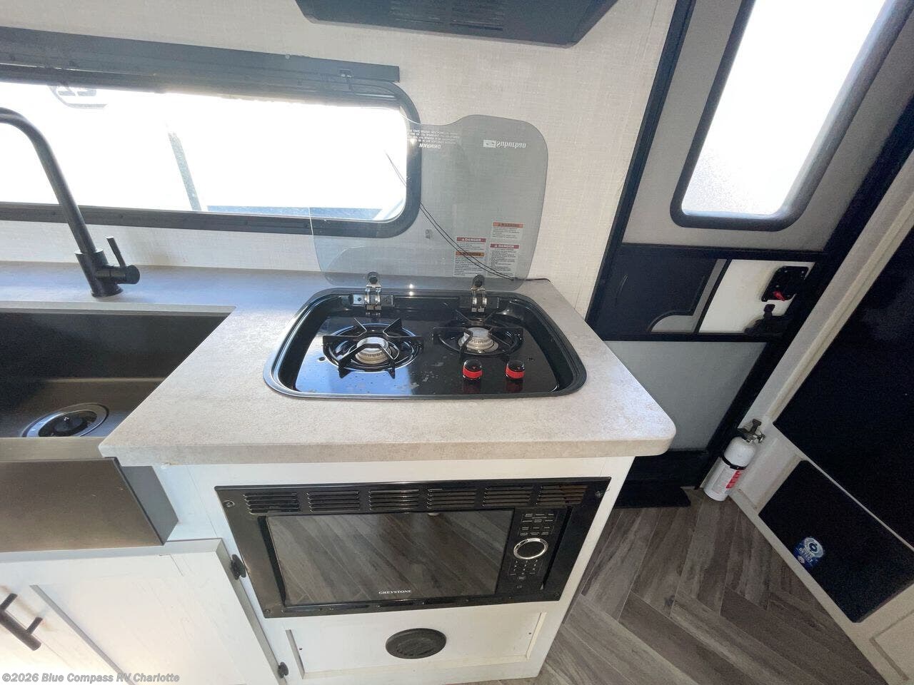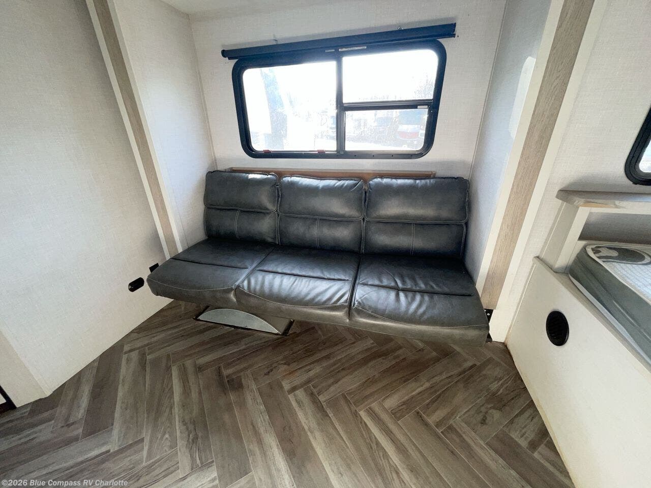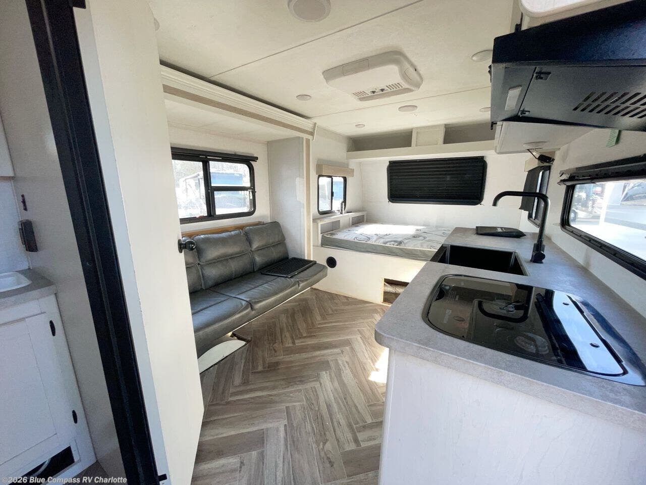 This travel trailer is perfect for two people looking to escape the hustle and bustle of everyday life! The front queen bed welcomes you to enjoy a good night's rest each night so you can feel refreshed every morning. After you have fried up some eggs with the two burner range, you can head to the sofa slide and enjoy it there with the indoor/outdoor table or take the table outside to have breakfast outdoors under the 12' power awning. The rear corner bathroom has a radius shower with a skylight above for natural lighting as you get ready each morning!
