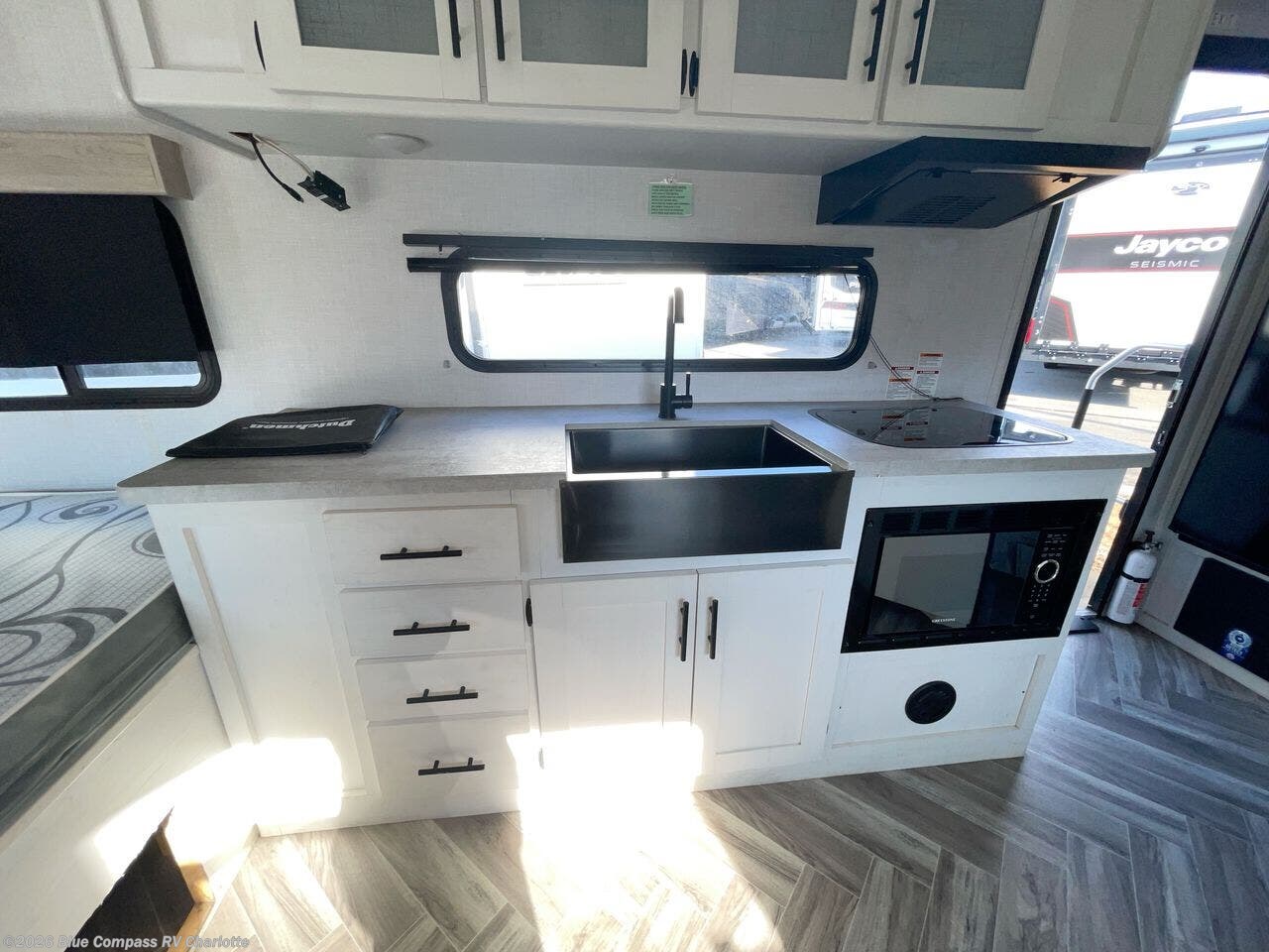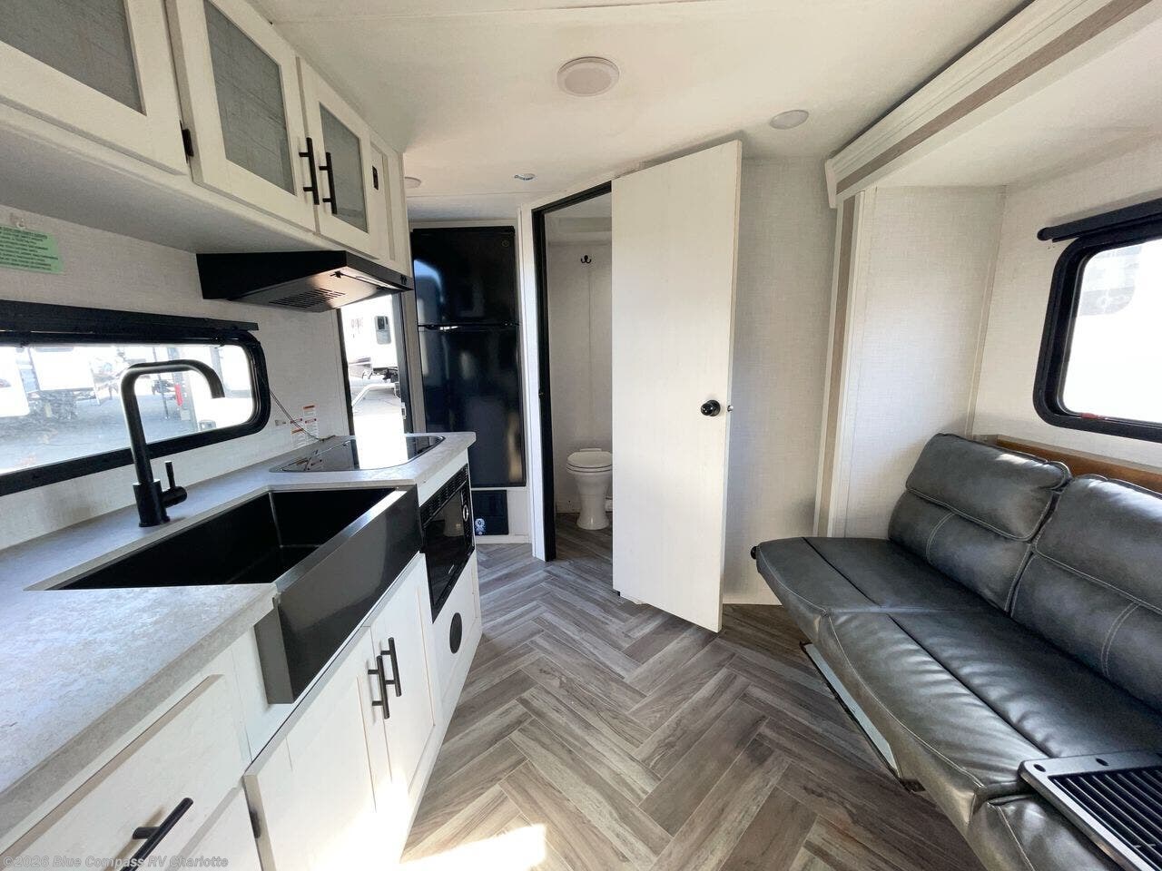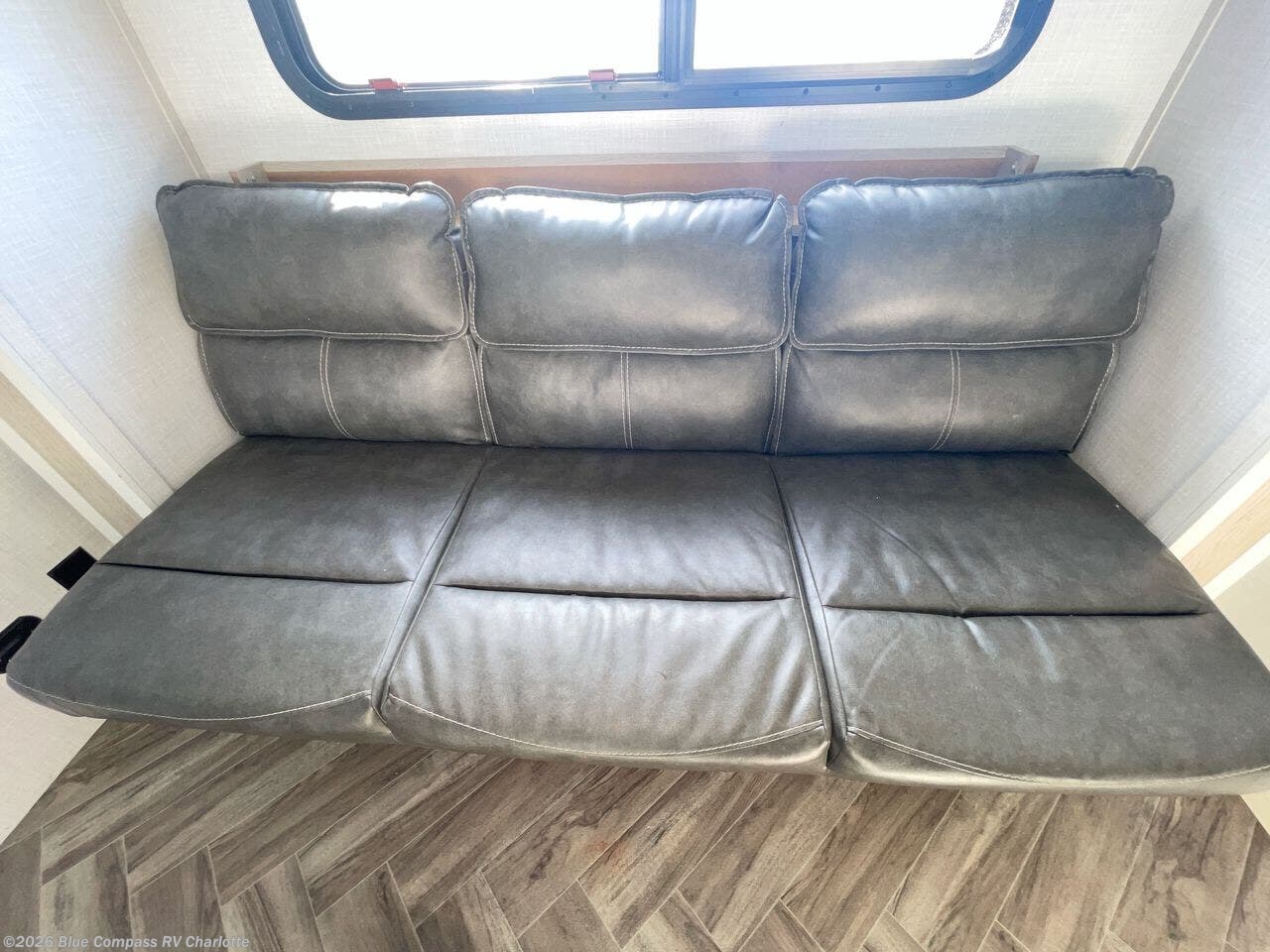 This travel trailer is perfect for two people looking to escape the hustle and bustle of everyday life! The front queen bed welcomes you to enjoy a good night's rest each night so you can feel refreshed every morning. After you have fried up some eggs with the two burner range, you can head to the sofa slide and enjoy it there with the indoor/outdoor table or take the table outside to have breakfast outdoors under the 12' power awning. The rear corner bathroom has a radius shower with a skylight above for natural lighting as you get ready each morning!