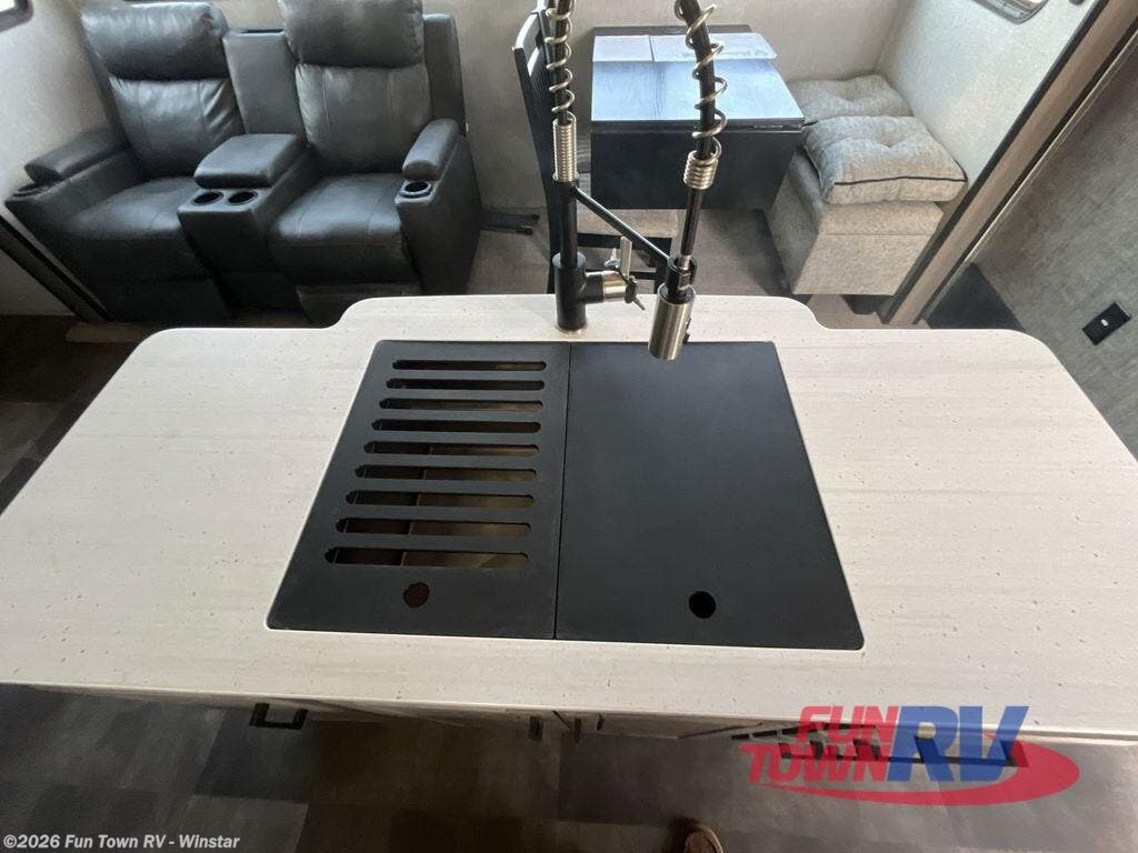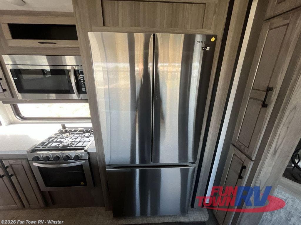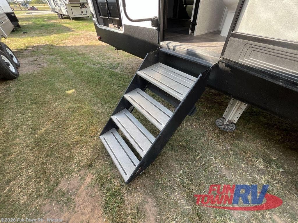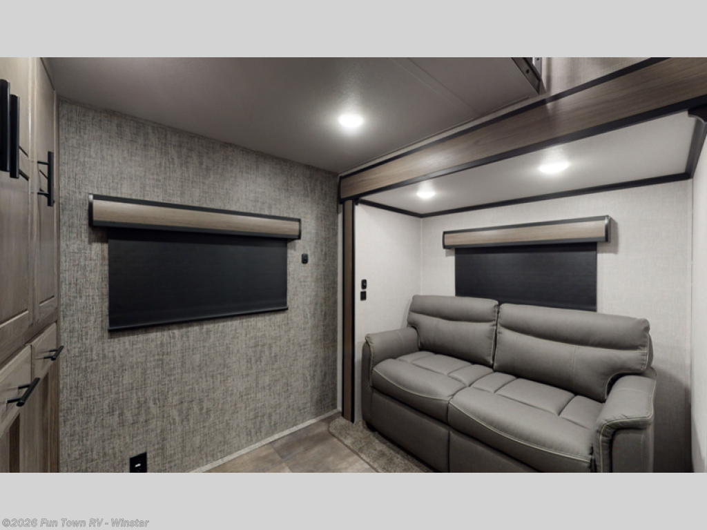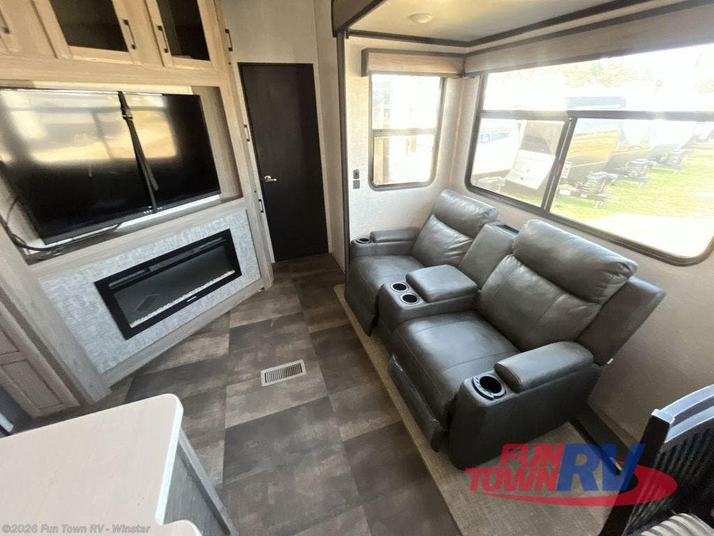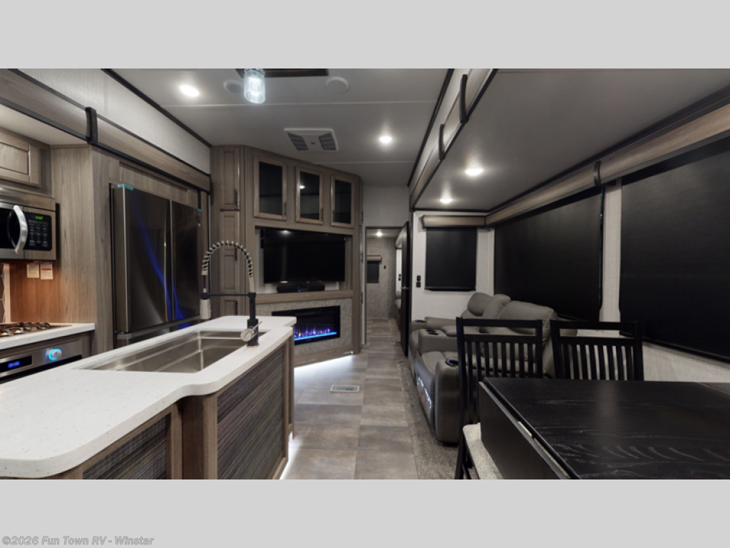With dual entry doors, everyone can easily access this fifth wheel! One of the entrances leads directly into the half bathroom attached to the rear bedroom which has a tri-fold sofa slide and wardrobe below a 54" x 74" loft bunk matt. The chef can prepare their best home cooked meals either indoors with the Furrion kitchen collection and the kitchen island or at the outside kitchen with a refrigerator and griddle. Enjoy your meals together at the dinette with two chairs on one side and bench seating on the other side. The dual entry bathroom has a 48" shower with a seat to freshen up in each morning and a dual sink vanity for two to get ready at once, plus it enters into the front private bedroom. You will feel right at home in the bedroom with the king bed slide across from the dresser with a fireplace and 39" TV, and the front closet with a shoe shelf and an area prepped to add an optional washer and dryer!