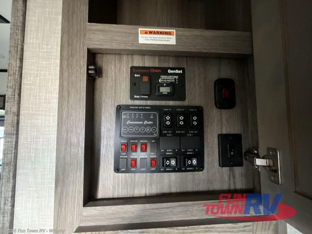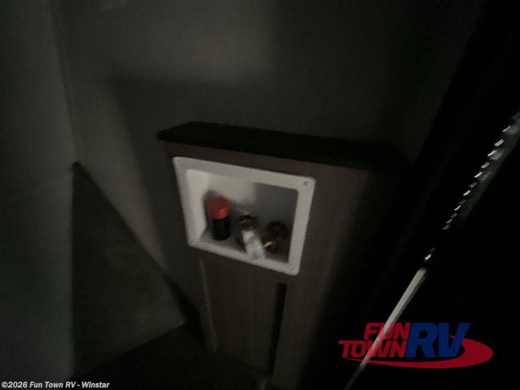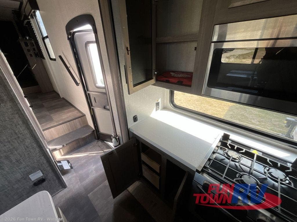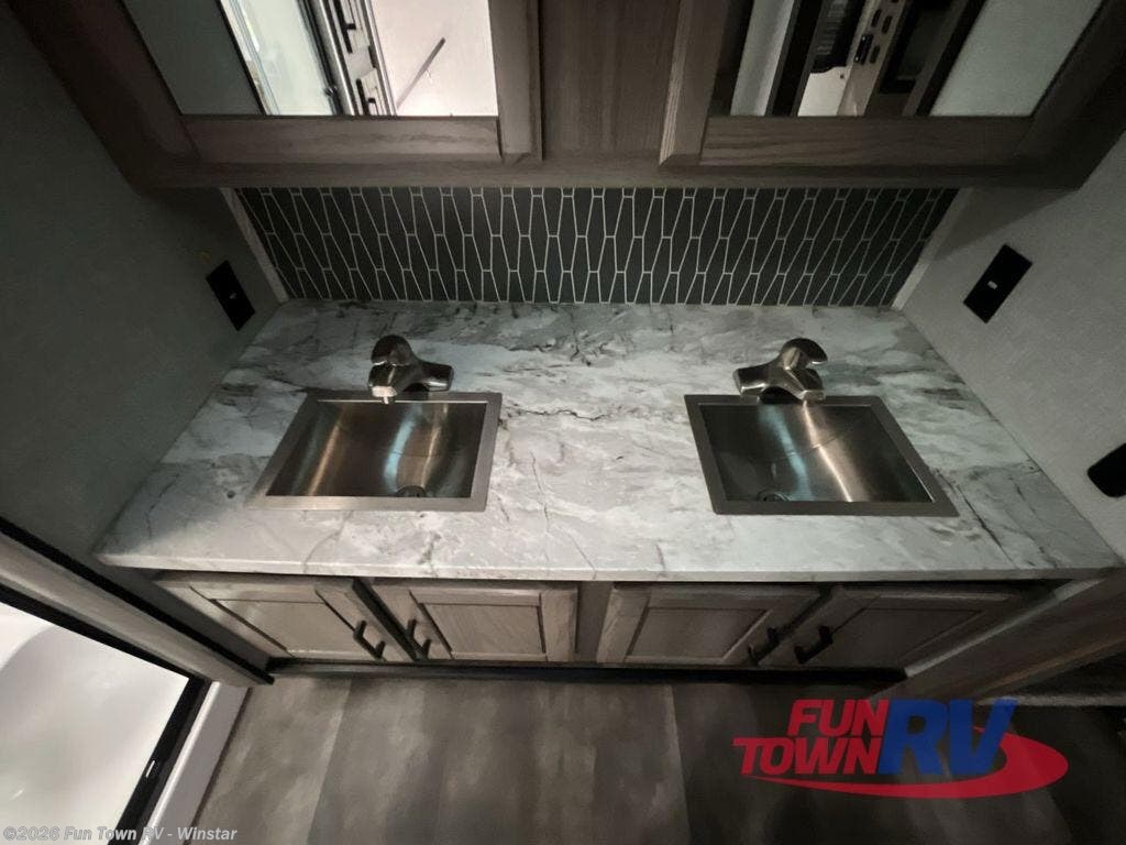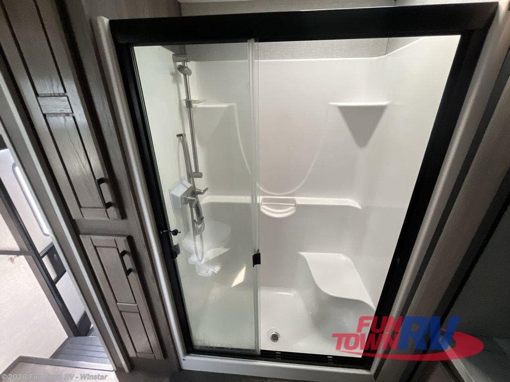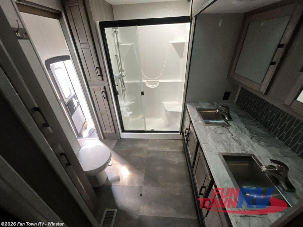 With dual entry doors, everyone can easily access this fifth wheel! One of the entrances leads directly into the half bathroom attached to the rear bedroom which has a tri-fold sofa slide and wardrobe below a 54" x 74" loft bunk matt. The chef can prepare their best home cooked meals either indoors with the Furrion kitchen collection and the kitchen island or at the outside kitchen with a refrigerator and griddle. Enjoy your meals together at the dinette with two chairs on one side and bench seating on the other side. The dual entry bathroom has a 48" shower with a seat to freshen up in each morning and a dual sink vanity for two to get ready at once, plus it enters into the front private bedroom. You will feel right at home in the bedroom with the king bed slide across from the dresser with a fireplace and 39" TV, and the front closet with a shoe shelf and an area prepped to add an optional washer and dryer!