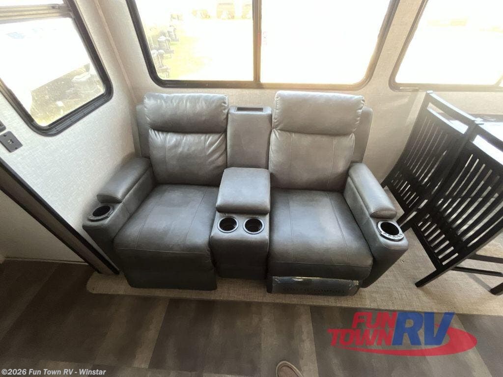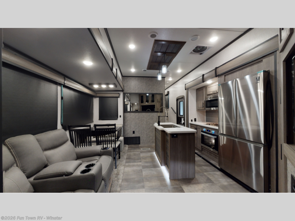 Every element of your home has been considered when creating these CrossRoads RV Cameo fifth wheels! From the oversized pantries, master suites, and full size theater seats with heat and massage to durable construction with the largest I-beam chassis in the industry. They also have the industry's first front windshield, an aerodynamic profile, and a full walk-on roof with an Alpha Ply II roof material. These modern fifth wheels were created with the customer in mind which is why they have convenient features like pass-through heated storage, spacious walk-in closets, an AM/FM/Bluetooth sound bar, a 6-point hydraulic auto level, and a 2" receiving hitch with 4-way plug. The Twice Is Nice package adds even more comforts like dual fireplaces for cozy evenings inside, dual awnings to protect you rain or shine, dual A/C units to keep you cool on those hot summer days, and dual wireless charging stations so your electronics can be at 100%. Come find the right model for you!