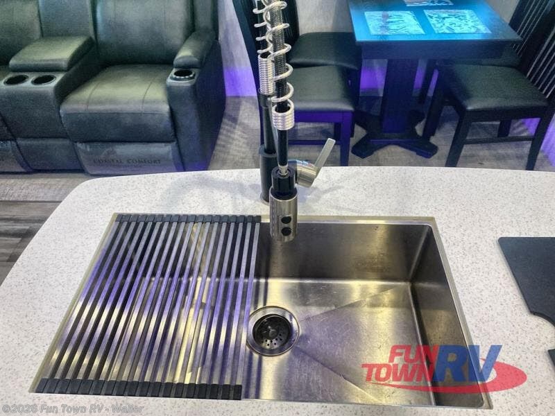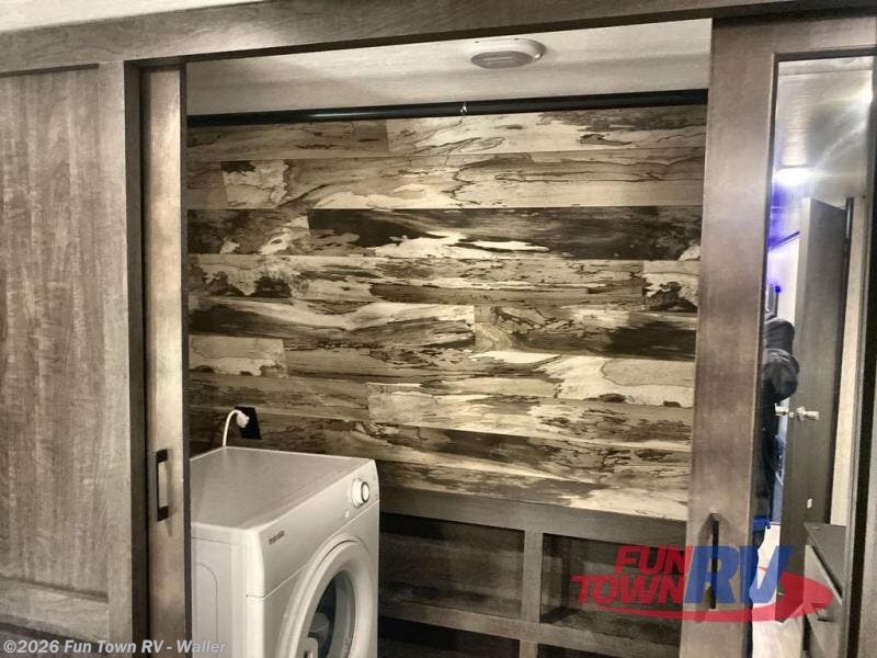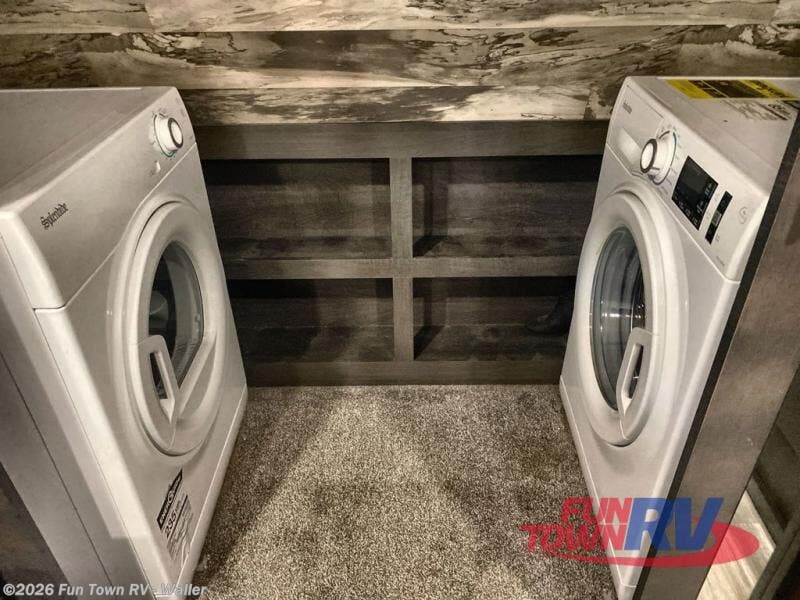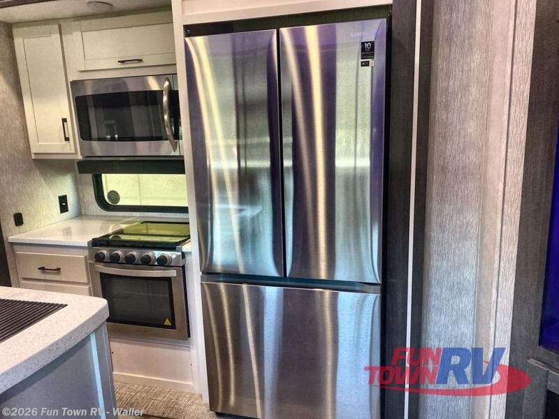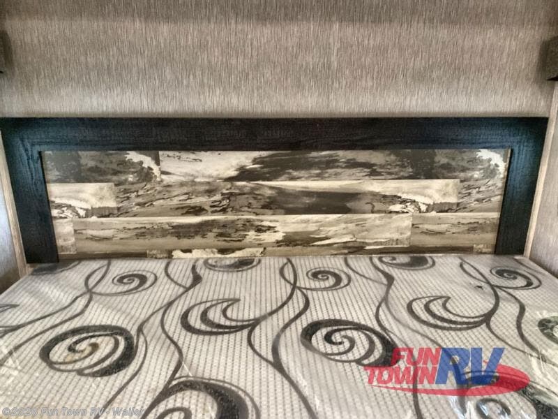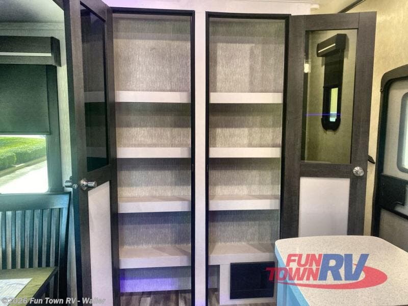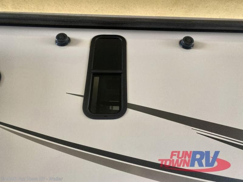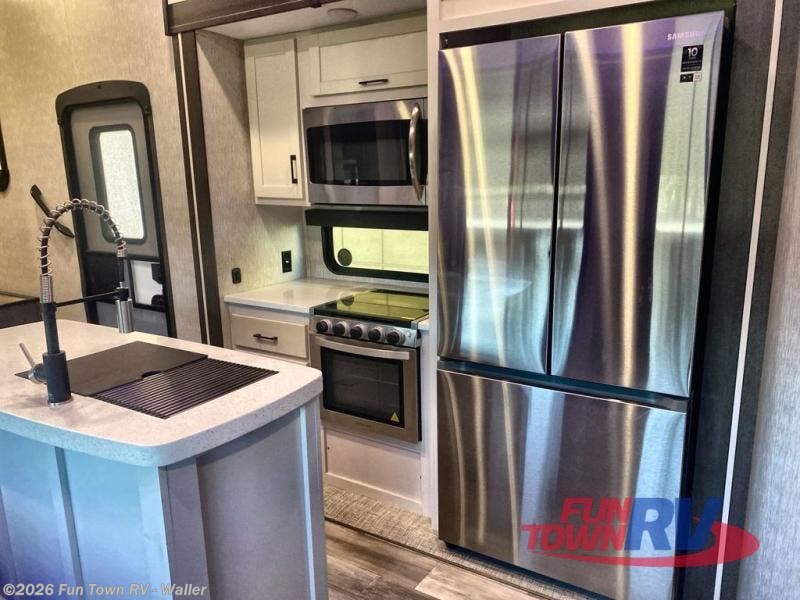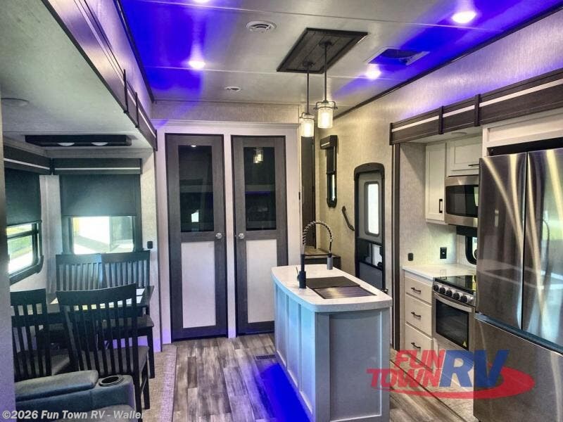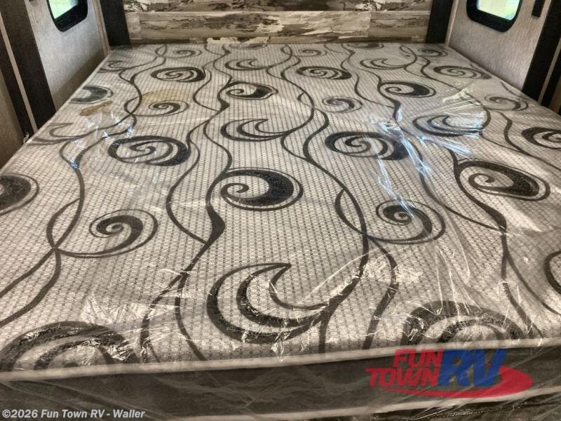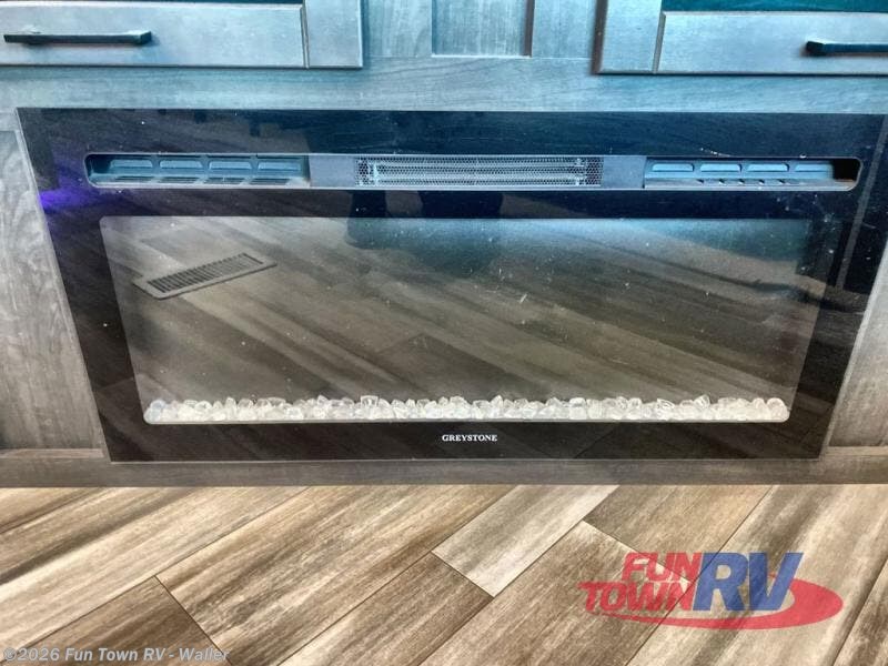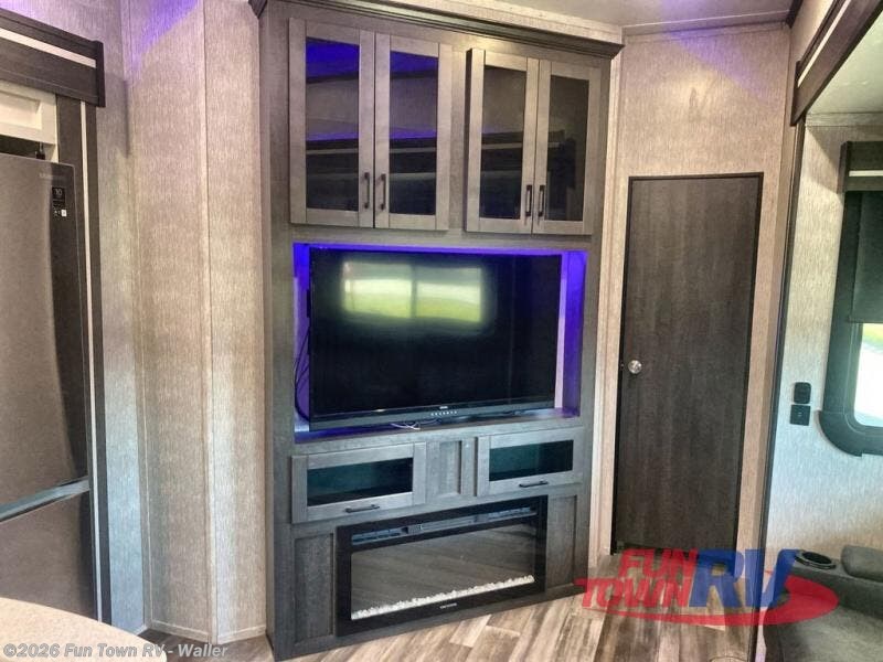 This award-winning Cruiser fifth wheel literally has it all! You will be completely impressed by the many fabulous features found all throughout this model, like the king bed slide in the front private bedroom, the rear bunkhouse suite that has its own half bath and second exterior entry door, and the comfortable living area with a free-standing table with chairs, 50" LED HDTV, and a fireplace. Since there are a set of opposing slides in the main living area, you'll have plenty of room to work around the kitchen island while you prepare dinner. If you are tired of remaining indoors, you can simply take your ingredients outside to use the outdoor kitchen.