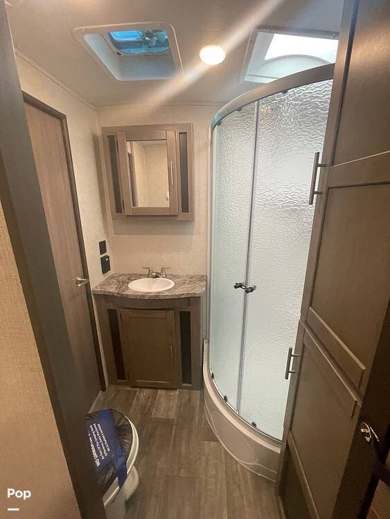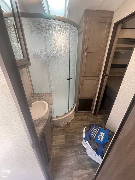 Moving forward in the RV is the bathroom with a corner shower, toilet, and sink with vanity.