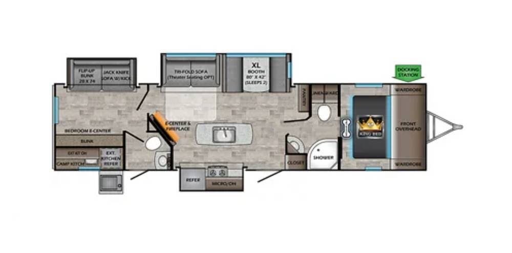 In the front, there is a large primary bedroom with a walk-around king bed and plenty of storage for all of your belongings.