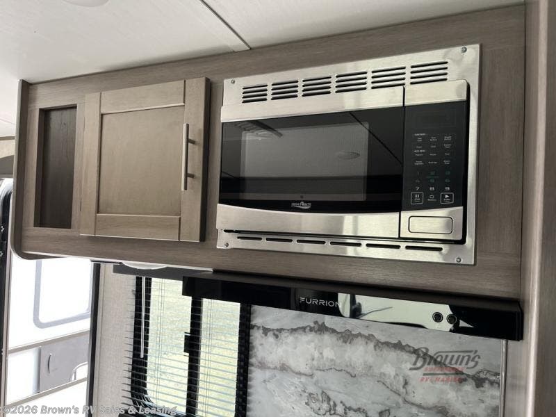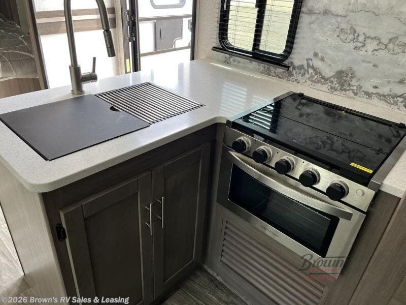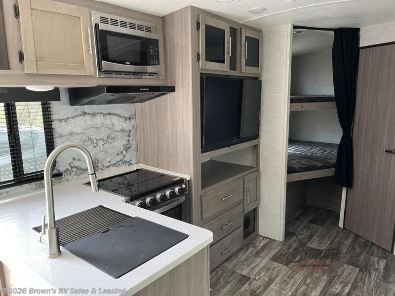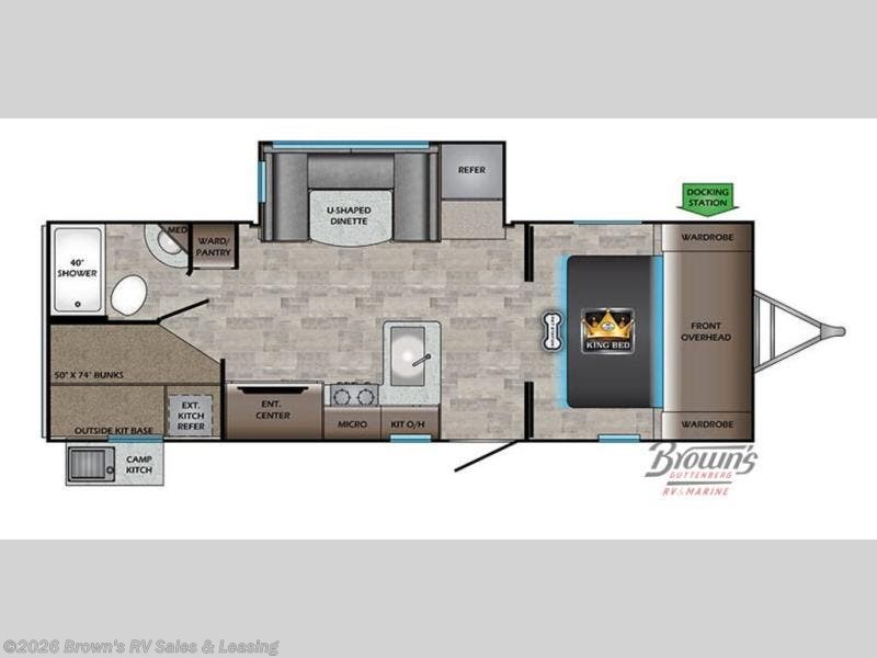 From the front private bedroom with a king bed and a slide out, to the rear corner bath and double-size bunks, you will love everything about this travel trailer. When you wake up in the morning you can prepare breakfast on the exterior camp kitchen, and if it's raining outside, the glass top range indoors will get the job done. There is also a stainless steel microwave for quick meals, and the wardrobe/pantry can store paper goods and the kids' cereal. Play a game of cards around the U-shaped dinette before heading off to bed in the front private bedroom!