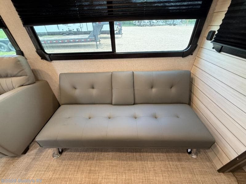 This travel trailer can comfortably sleep ten people each night, so invite the cousins for whole-family fun! The kids are sure to love the double-size bunks, and the owners will have their own private bedroom up front with a king bed. Within the large slide out you'll find the XL booth dinette which can sleep two, plus the tri-fold sofa that can be replaced by an optional theater seating if you choose. Whip up dinner in a flash on the glass top range or use the exterior camp kitchen. The full bath includes its own exterior entrance door for convenience, and there is a power awning with LED lights for the perfect outdoor living space!