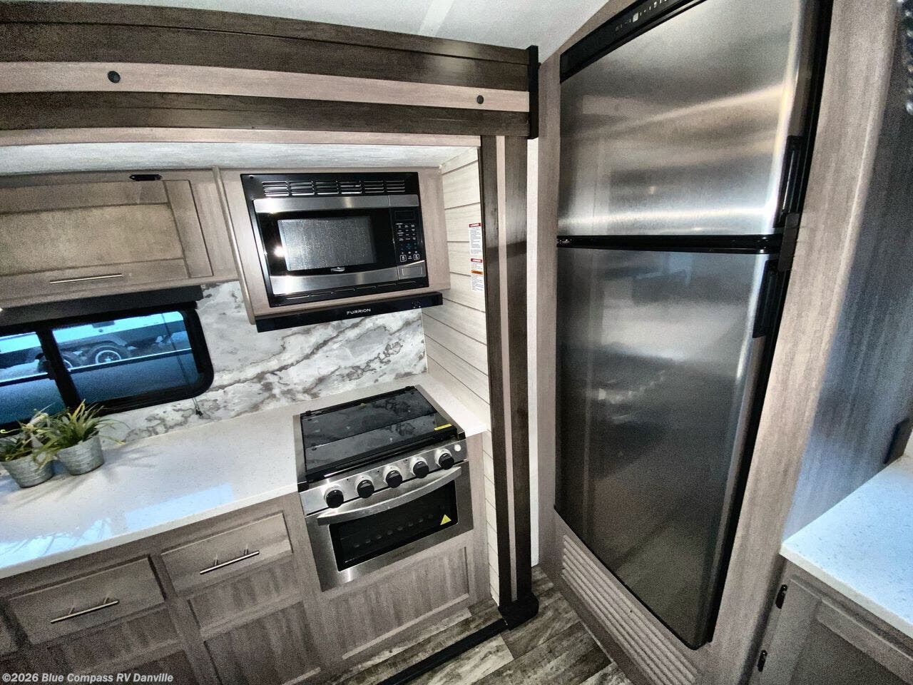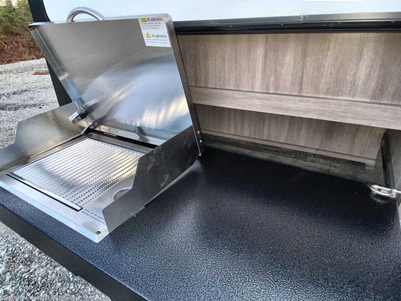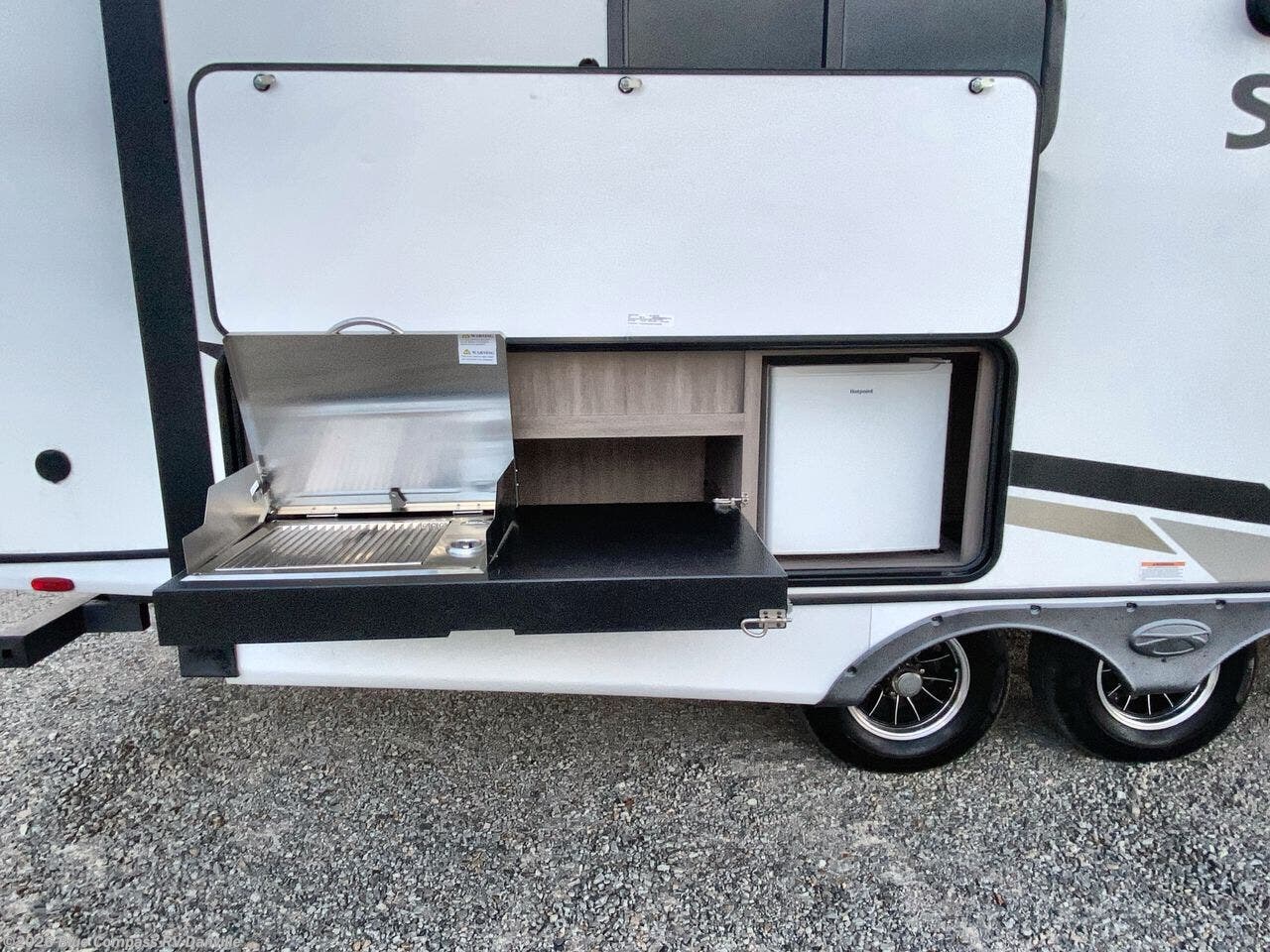 What could be more comfortable than a king bed, dual opposing slides for added space, plus an exterior camp kitchen? You will get all that and more when you choose this spacious travel trailer. The chef of the family will love the kitchen island for added space to cook and clean up, and there is plenty of rear counter space to set out fresh fruits and veggies. The tri-fold sofa sits directly across from the fireplace for a cozy evening indoors, and if you're not needing the extra sleeping space you can choose the optional theater seating in place of the tri-fold sofa. You will truly feel at home in the front private bedroom that includes a king bed, dual wardrobes, plus a third wardrobe in the closet. There is even a pet station that will make camping with your dog easier than ever!