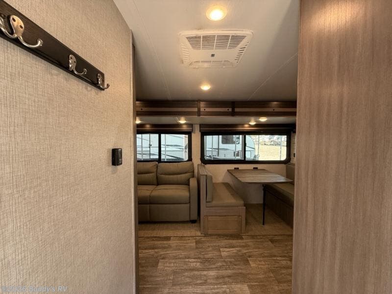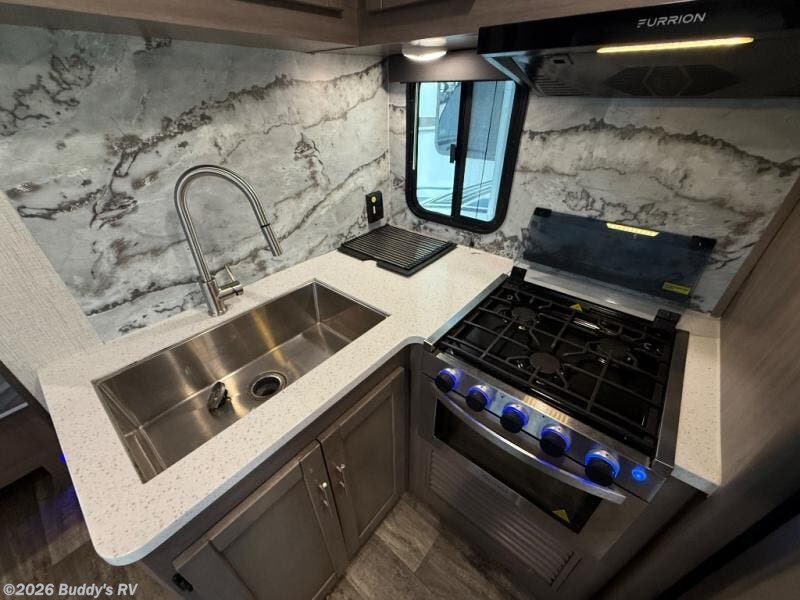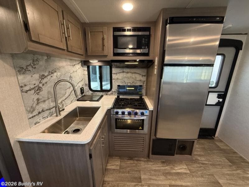 With any Sunset Trail travel trailer by CrossRoads RV, the interior offers a stainless steel farmhouse single bowl sink with a cover, solid surface countertops in the kitchen, a 12 volt refrigerator, USB ports in the bedroom and main area, and a Connexx entertainment TV with soundbar for inside enjoyment. Also included is the Extreme Weather package with maximum insulation with reflective foil, a 30,000 BTU furnace, and a 2" heat duct in the enclosed underbelly for four seasons of traveling. And the Blade Air system offers 20% more airflow and re-engineered components on the A/C. The HyperDeck flooring is water resistant, fiberglass reinforced and has polypropylene layers. Make your lightweight and comfortable RV decision today!