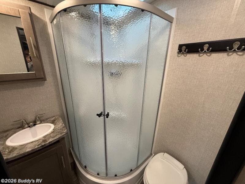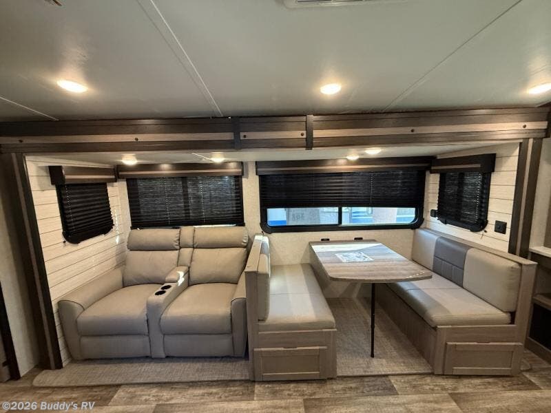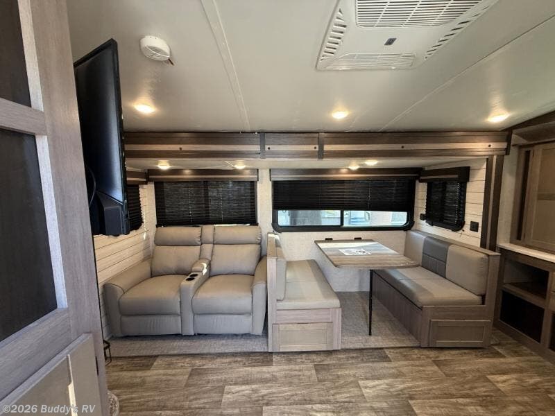You will love this trailer for many reasons beginning with having dual entry for easy access to the spacious rear bedroom or the main living and kitchen area. The cook will love the front kitchen with lots of counter space, a window to enjoy the view and all the kitchen amenities to make warm meals for the two of you plus anyone that visits. The slide out sofa and booth dinette offer sleeping space for the grandkids on top of relaxation inside when you aren't outside under the electric awning with LED strip. You will have a full bathroom to get cleaned up after a fun day outside, and a rear master bedroom with a king bed slide out, storage and a rear window for more great views!