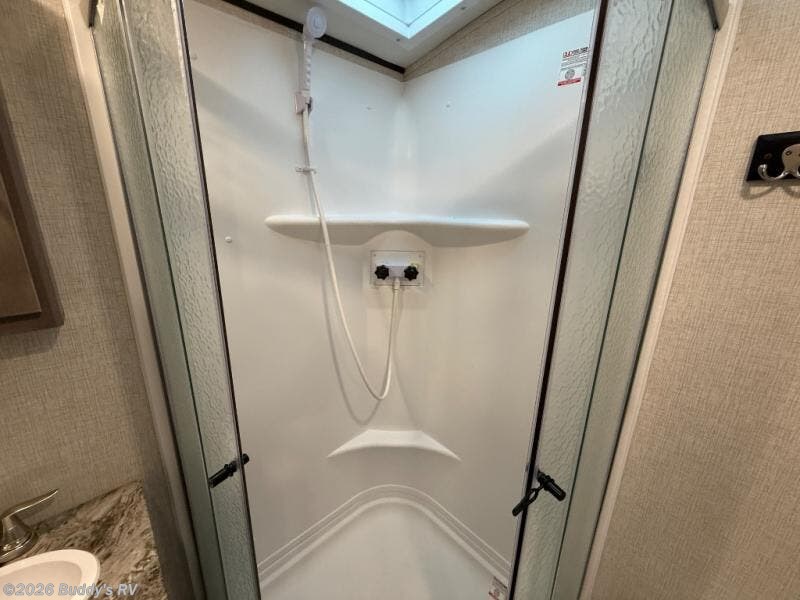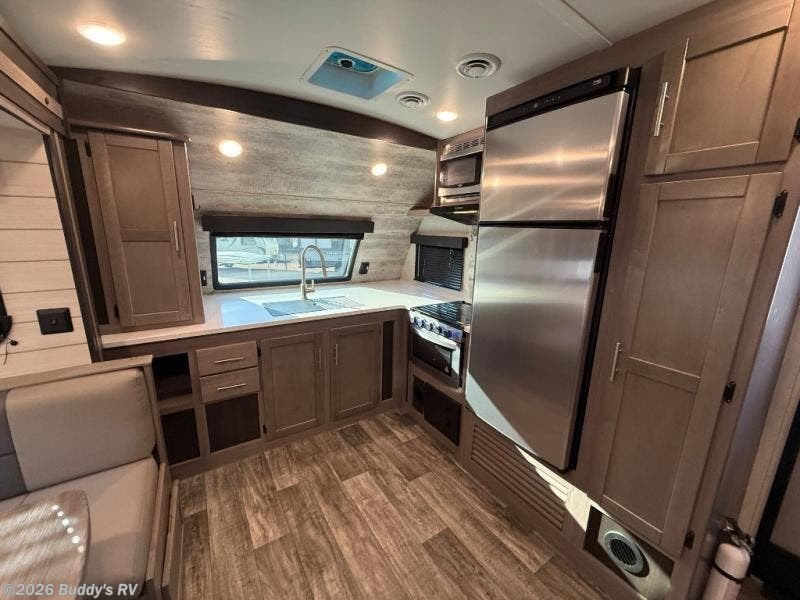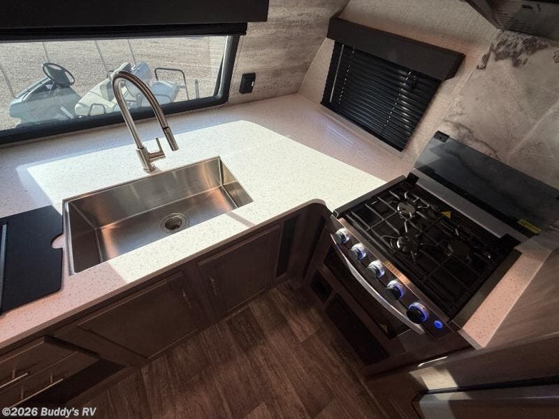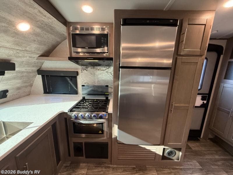 With any Sunset Trail travel trailer by CrossRoads RV, the interior offers a stainless steel farmhouse single bowl sink with a cover, solid surface countertops in the kitchen, a 12 volt refrigerator, USB ports in the bedroom and main area, and a Connexx entertainment TV with soundbar for inside enjoyment. Also included is the Extreme Weather package with maximum insulation with reflective foil, a 30,000 BTU furnace, and a 2" heat duct in the enclosed underbelly for four seasons of traveling. And the Blade Air system offers 20% more airflow and re-engineered components on the A/C. The HyperDeck flooring is water resistant, fiberglass reinforced and has polypropylene layers. Make your lightweight and comfortable RV decision today!