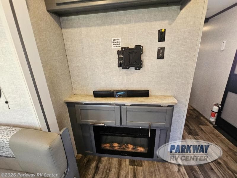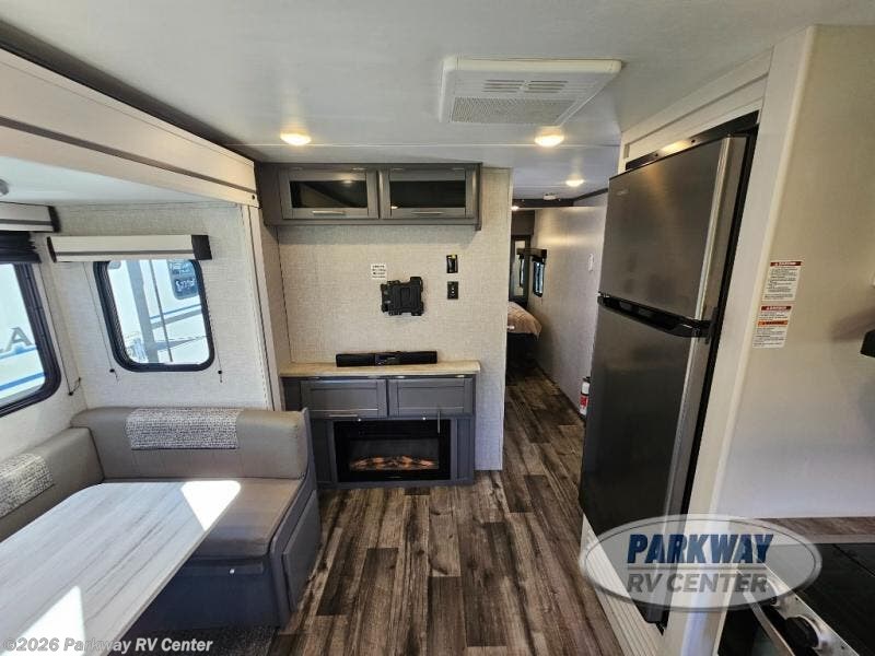 You will feel right at home in this travel trailer that can comfortably sleep four people each night. Once you arrive at your destination, set up the power awning and grab a cold drink from the outside refrigerator. You can then stretch your legs on a trail or two and easily clean up in the full bath when you return. The theater seats sit directly across from the entertainment center and fireplace for easy viewing, and the chef of your group will have all the appliances needed to create a home-cooked meal. You'll love the front private bedroom that includes a king bed, dual shirt closets, plus overhead space to store your things!