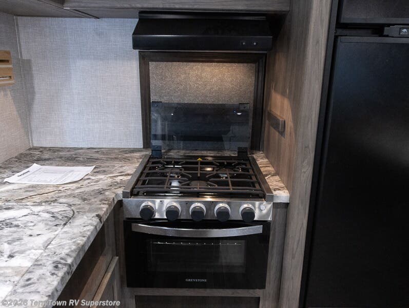 The chef of your group will love cooking in this rear kitchen travel trailer! It not only features a 10-cu. ft. refrigerator, an oven with an LED glass top, and a pressed countertop with a sink cover, but also a stainless steel sink with a stainless steel high-rise faucet and lots of counter space to prep your meals. While the chef is preparing dinner, you can socialize at the U-shaped dinette or 60" jackknife sofa slide while two others sit in the chairs with an end table in between to set a cup of coffee. There is even an outside kitchen, so you can take the fun outdoors while still cooking dinner. The full bathroom has a 34" radius shower with a linen closet next to it for you to grab a towel without dripping water all over the place. Head to the front private bedroom and grab your pajamas from one of the two shirt closets or even from the overhead cabinets above the 60" x 74" RV queen bed!