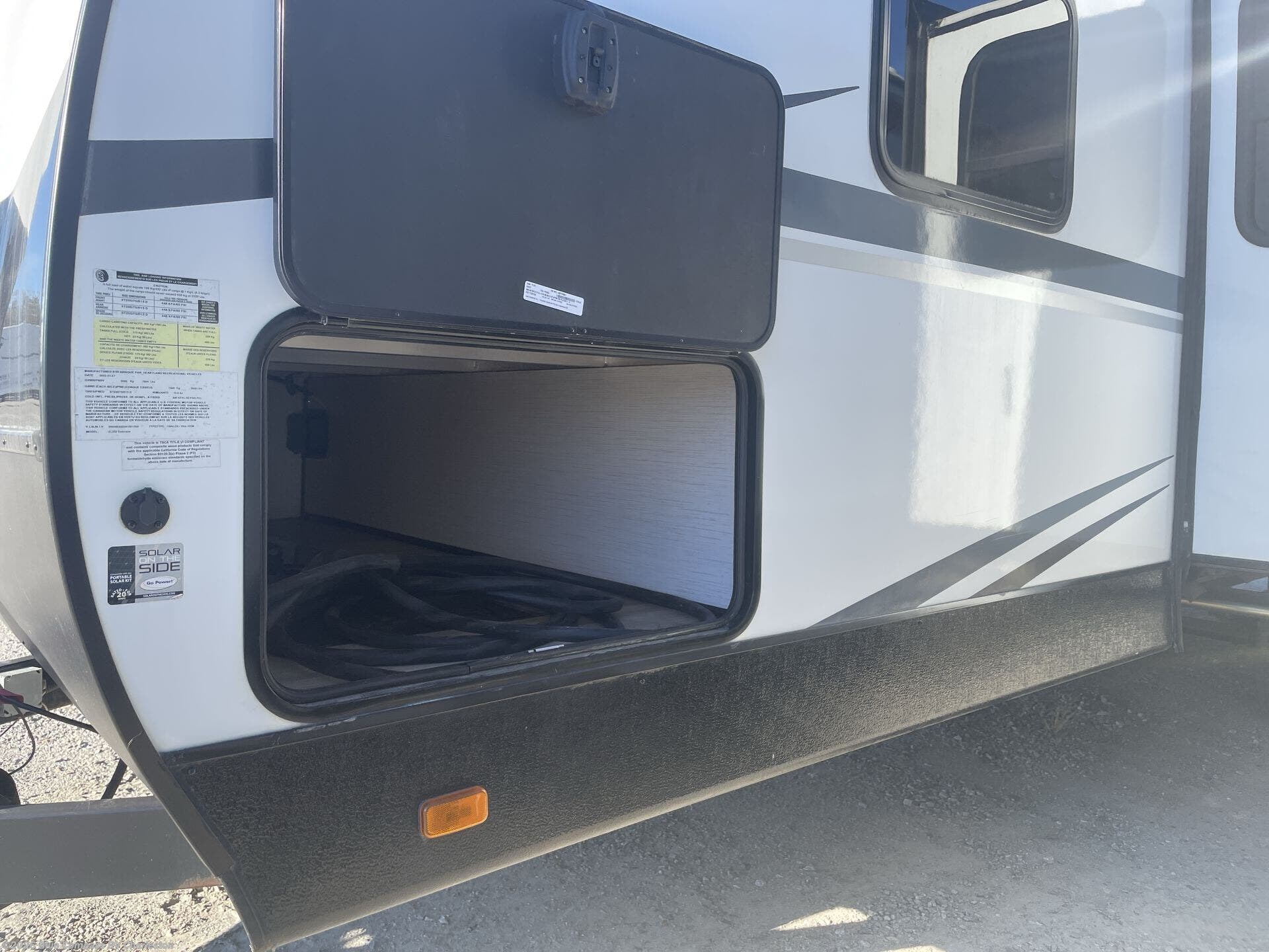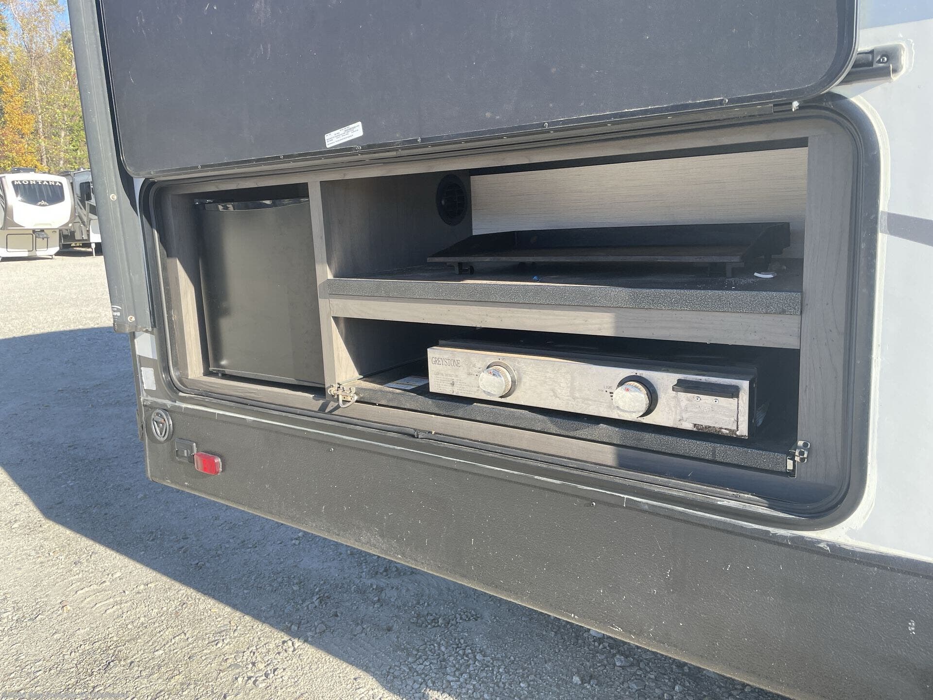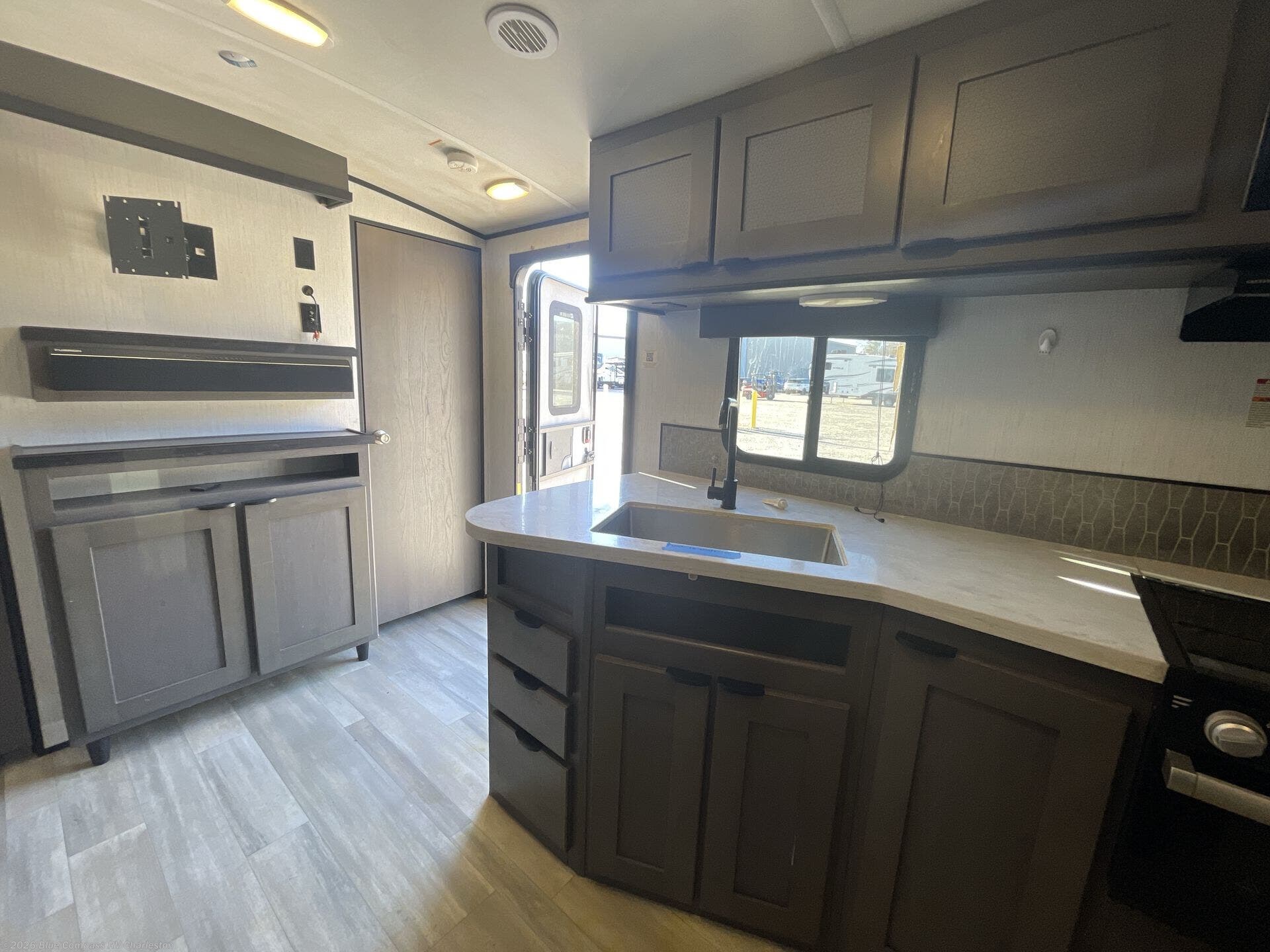 Get the whole crew together for trips in this single slide out travel trailer! The little ones will love the double-size bunks, and you'll have your own private bedroom up front. If you have any other guests, they can sleep on the U-shaped dinette when it's not being used for meal times or game night. The chef can cook indoors on the three burner cooktop, or outdoors on the outside kitchen. There is also a 19' power awning with LED lights here to keep them in the shade. Storage space in this model is found in the overhead compartments, the dual bedroom wardrobes, and the exterior full belly storage system!