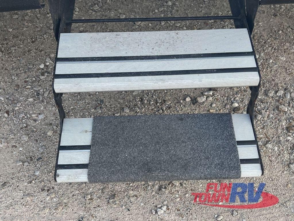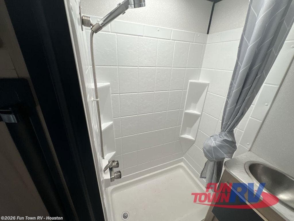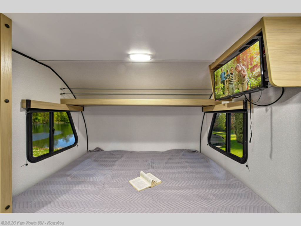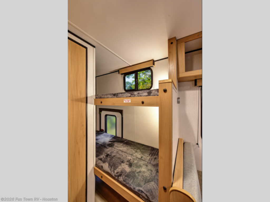 The whole family can camp comfortably in this travel trailer! The kids can sleep on the set of double bunk beds and you can sleep on the front queen bed with drawers underneath to store your necessities. The booth dinette could also transform into an extra sleeping space when you aren't using it to enjoy a meal prepared with the two burner cooktop and 8 cu. ft. refrigerator. Everyone can stay squeaky clean with the shower in the rear corner bathroom. Don't leave any outdoor gear behind when you have a front exterior full pass-through storage area for it all!